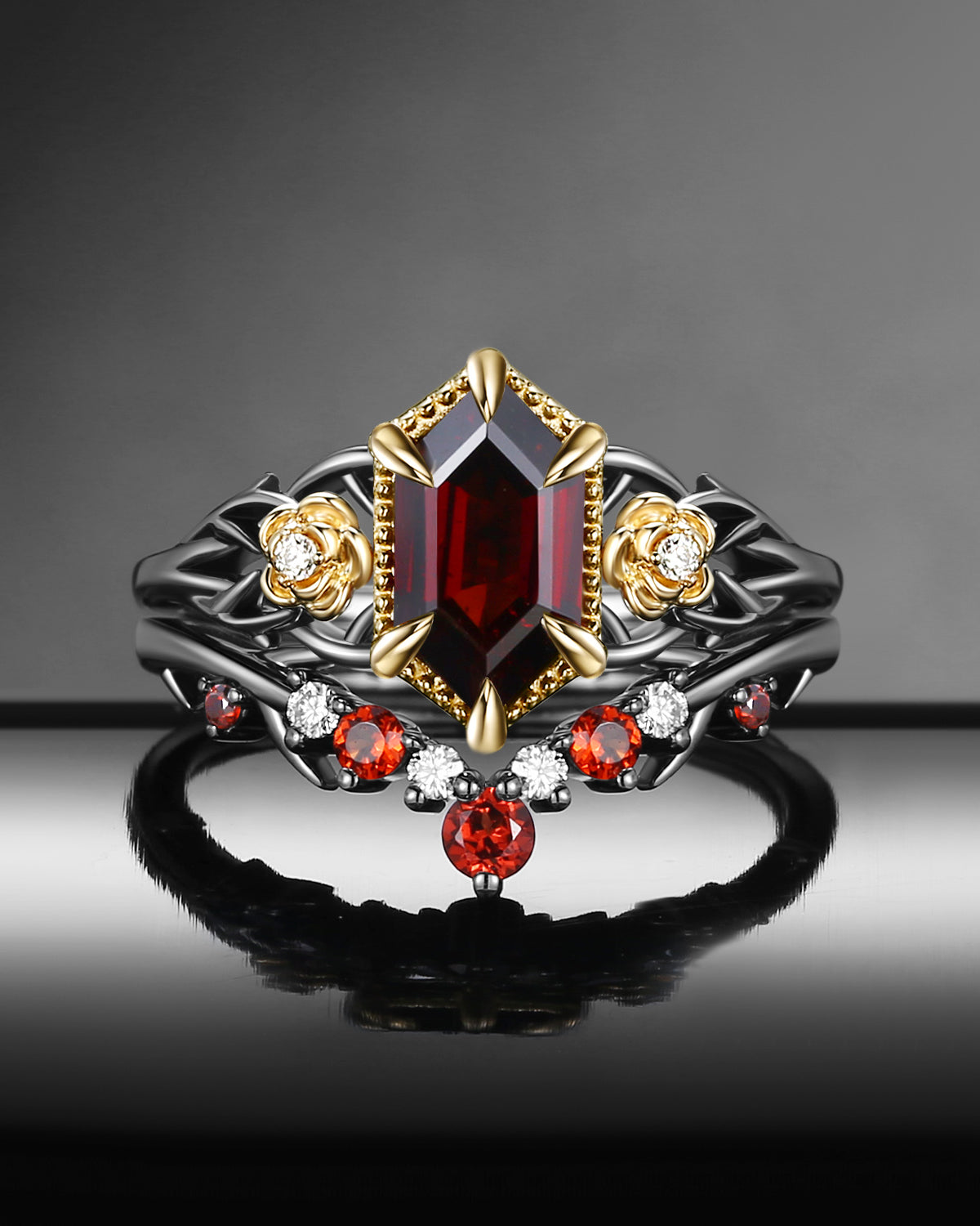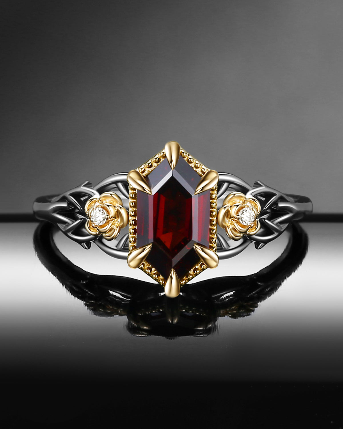 Nature Inspired Long Hexagon Garnet 'Thorns & Roses' Two-Toned Engagement Ring