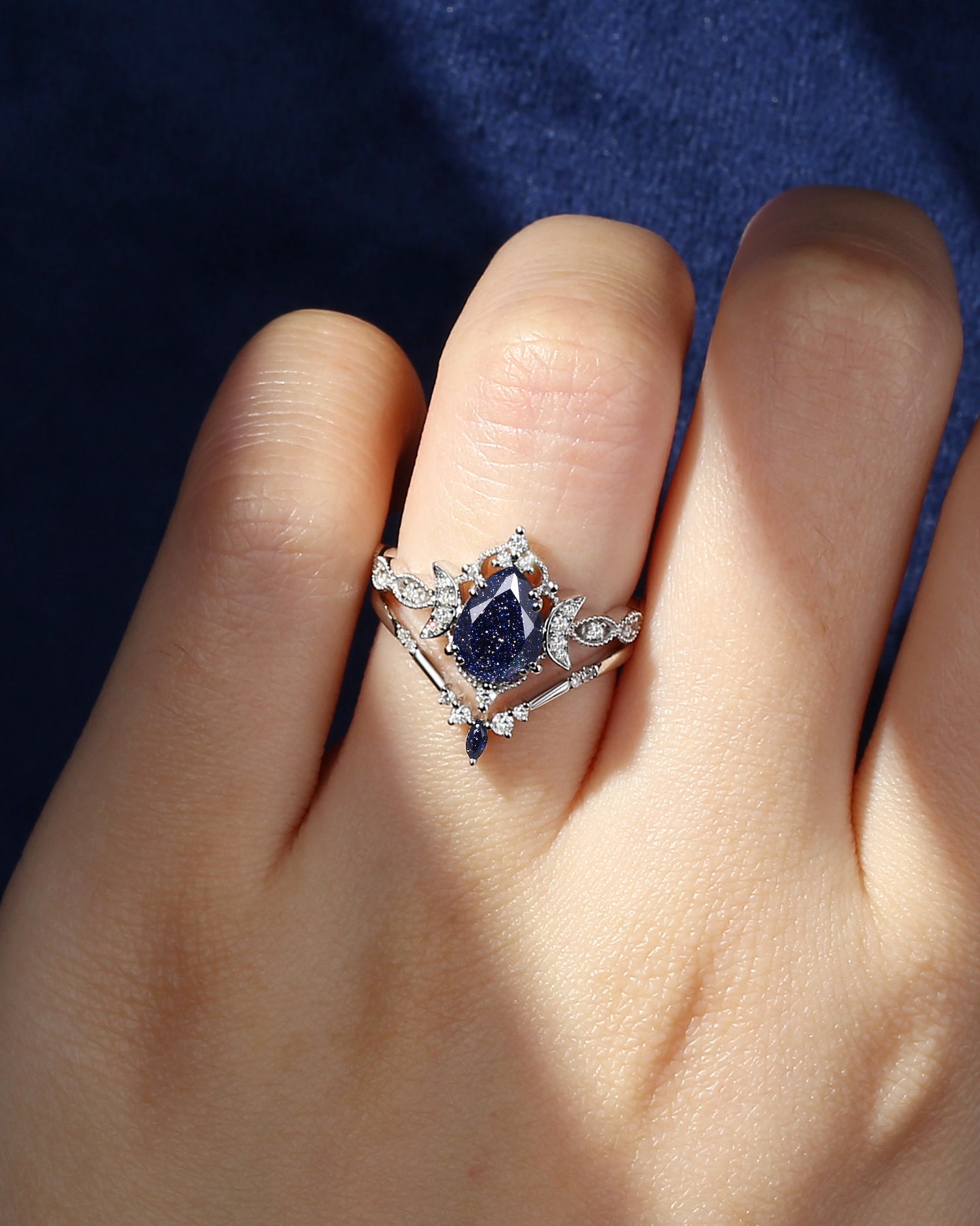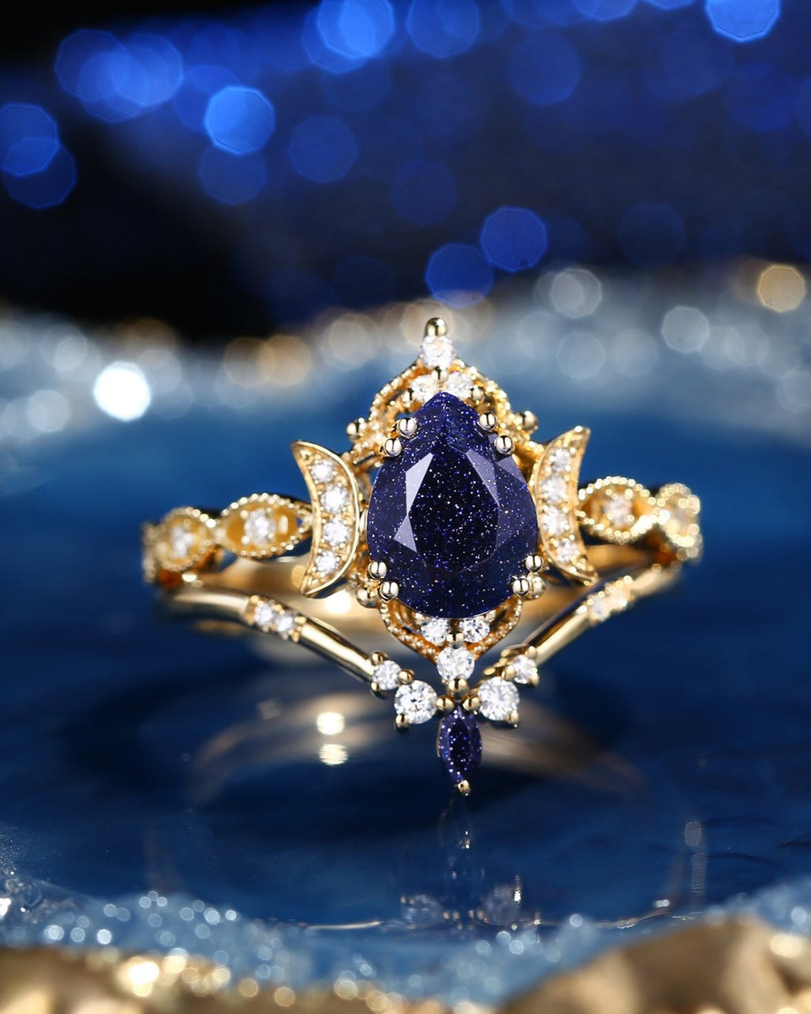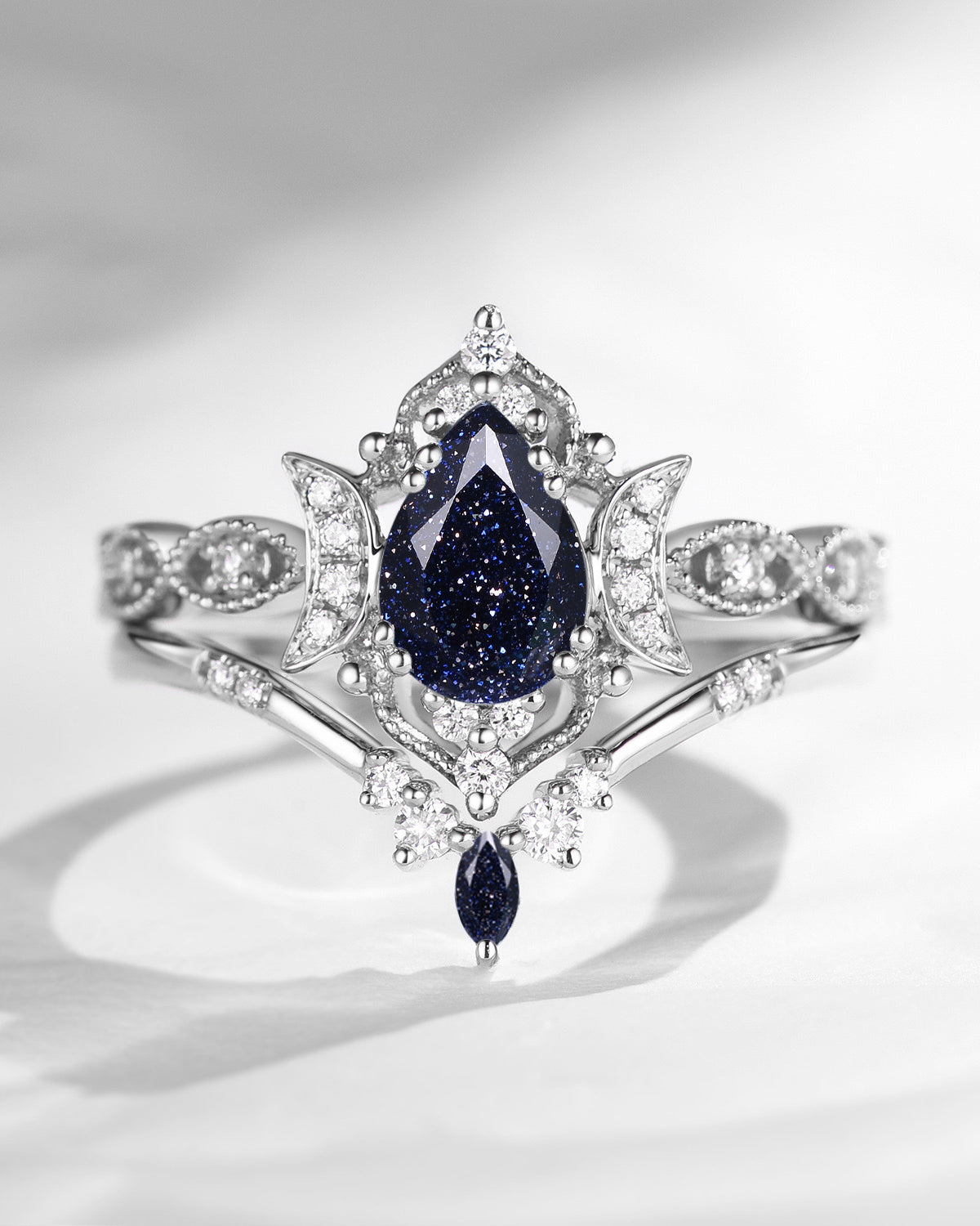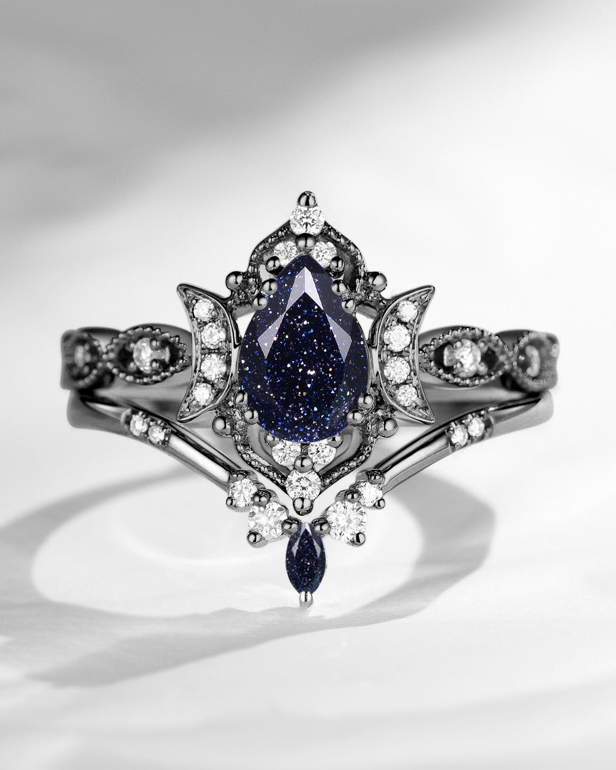 Crescent Moon | Pear Cut Blue Sandstone 'Ultra Galaxy' Engagement Ring Set 2pcs