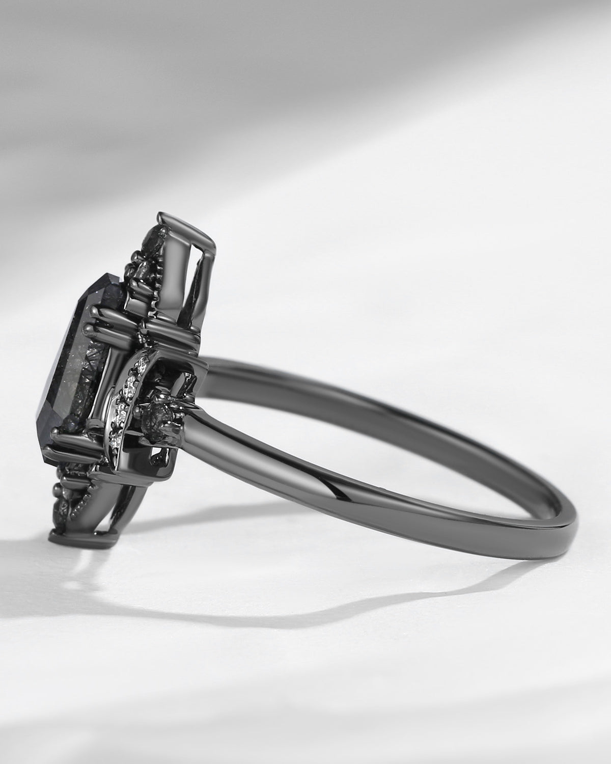 Crescent Moon | Vintage Style Coffin Cut Black Rutilated Quartz 'Evermore' Black Gold Engagement Ring