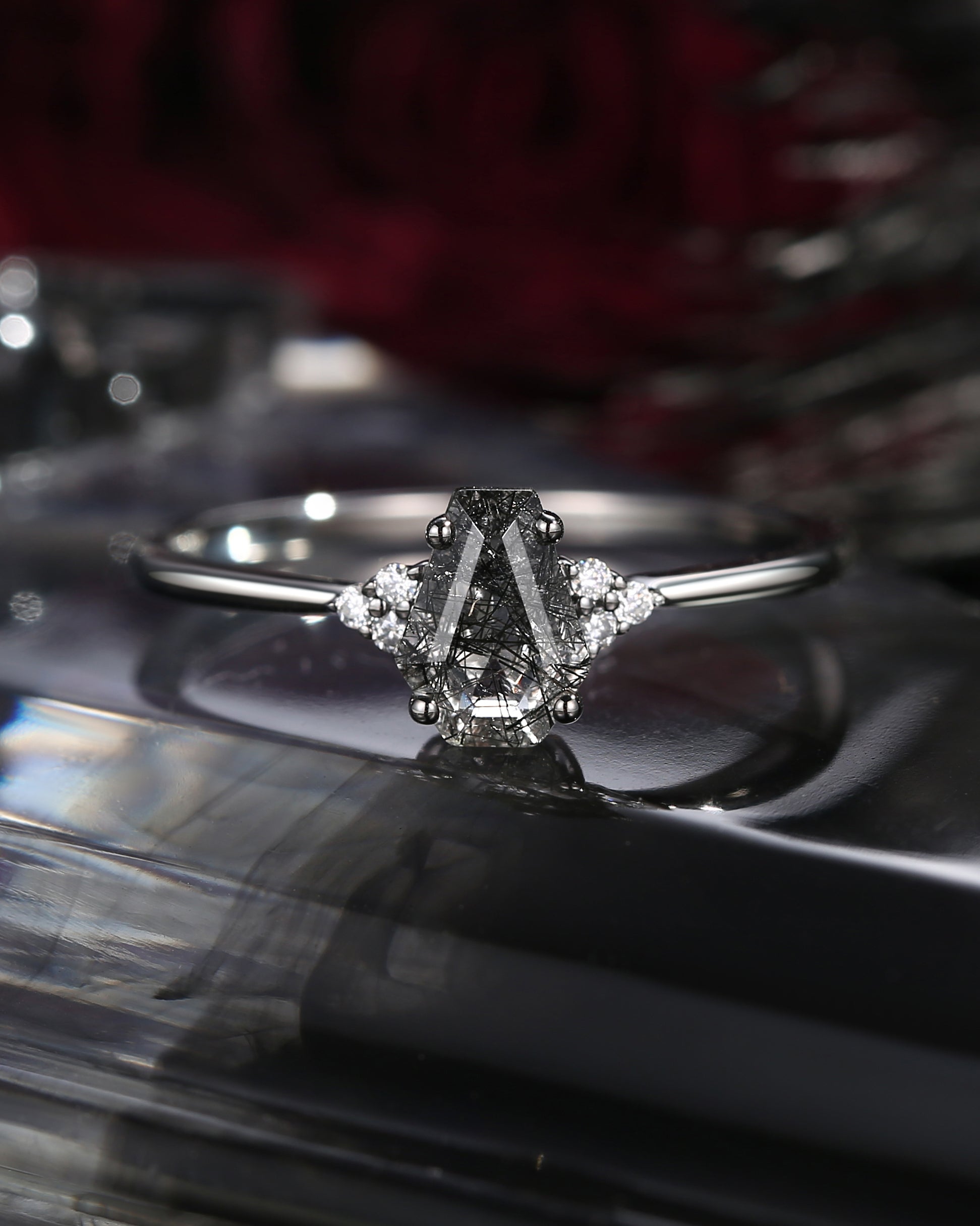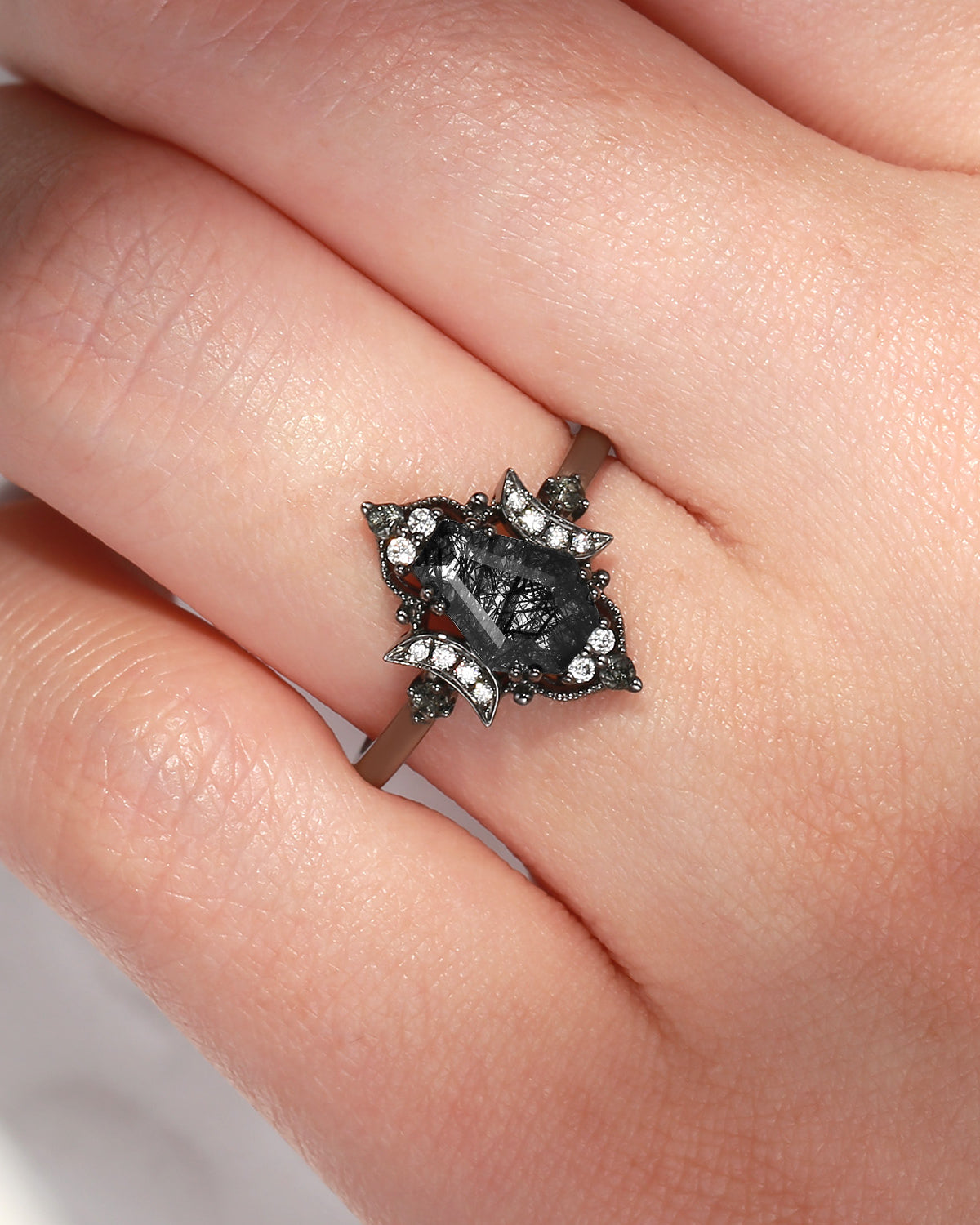 Crescent Moon | Vintage Style Coffin Cut Black Rutilated Quartz 'Evermore' Engagement Ring