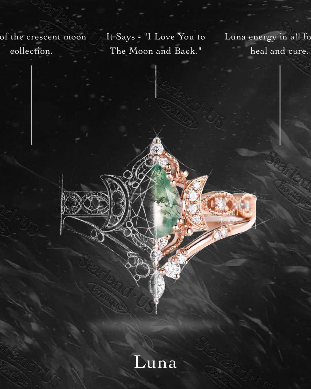 Crescent Moon | Unique Coffin Black Rutilated Quartz Infinity Celtic Engagement Ring