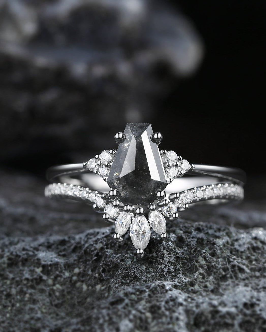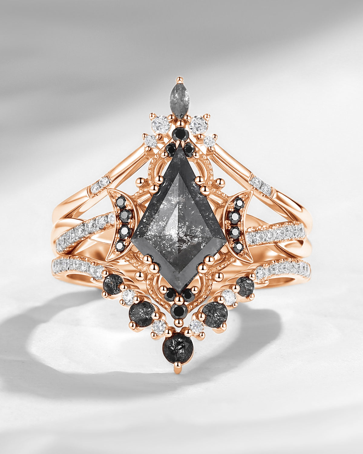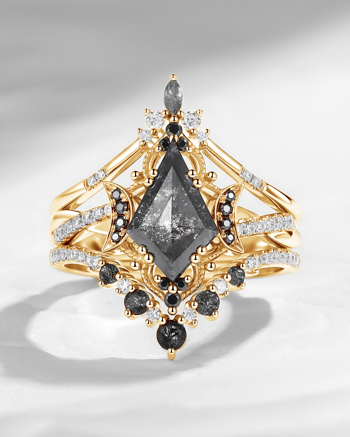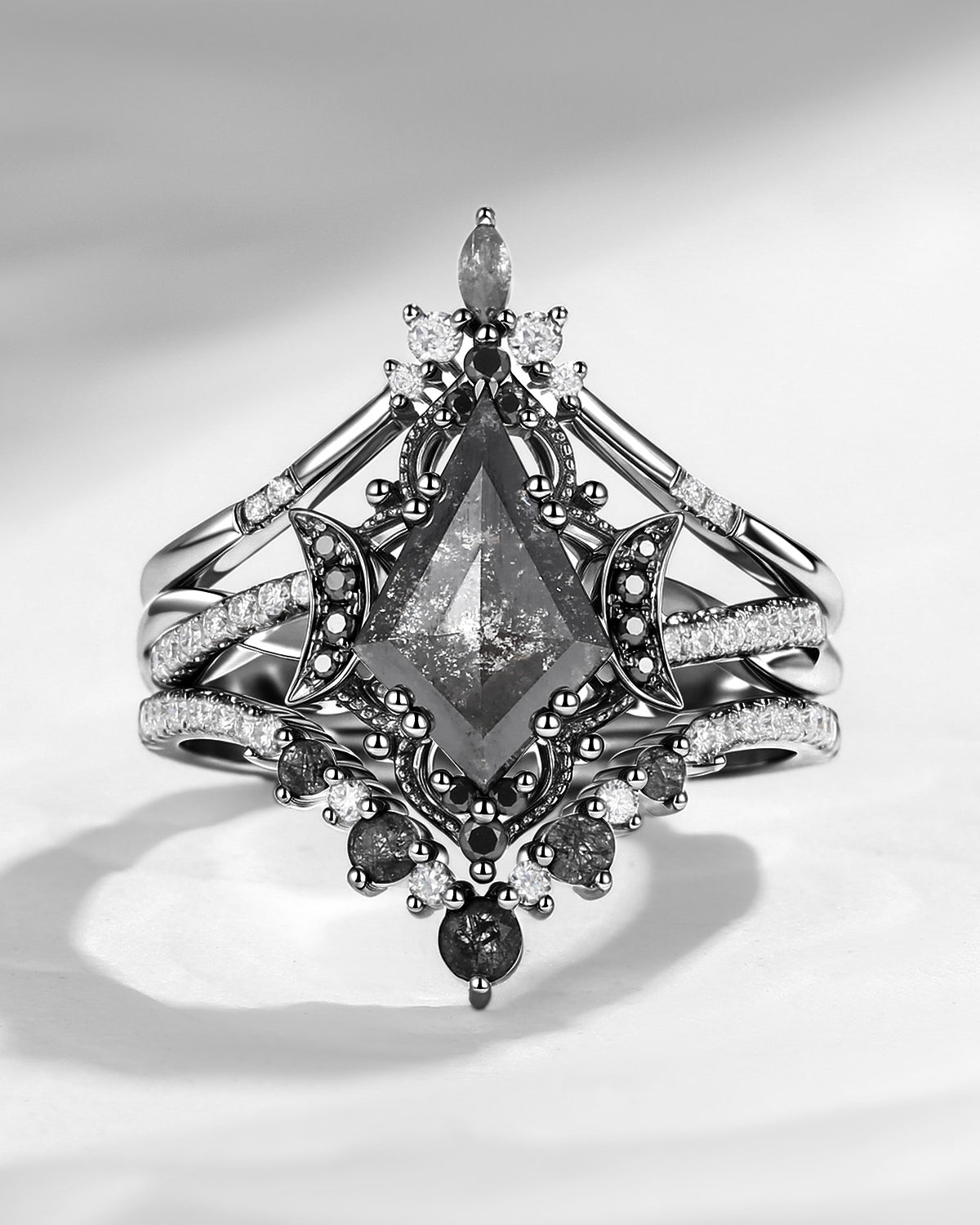 Crescent Moon | Kite Cut Salt and Pepper Diamond 'Noir' Engagement Ring Set 3pcs