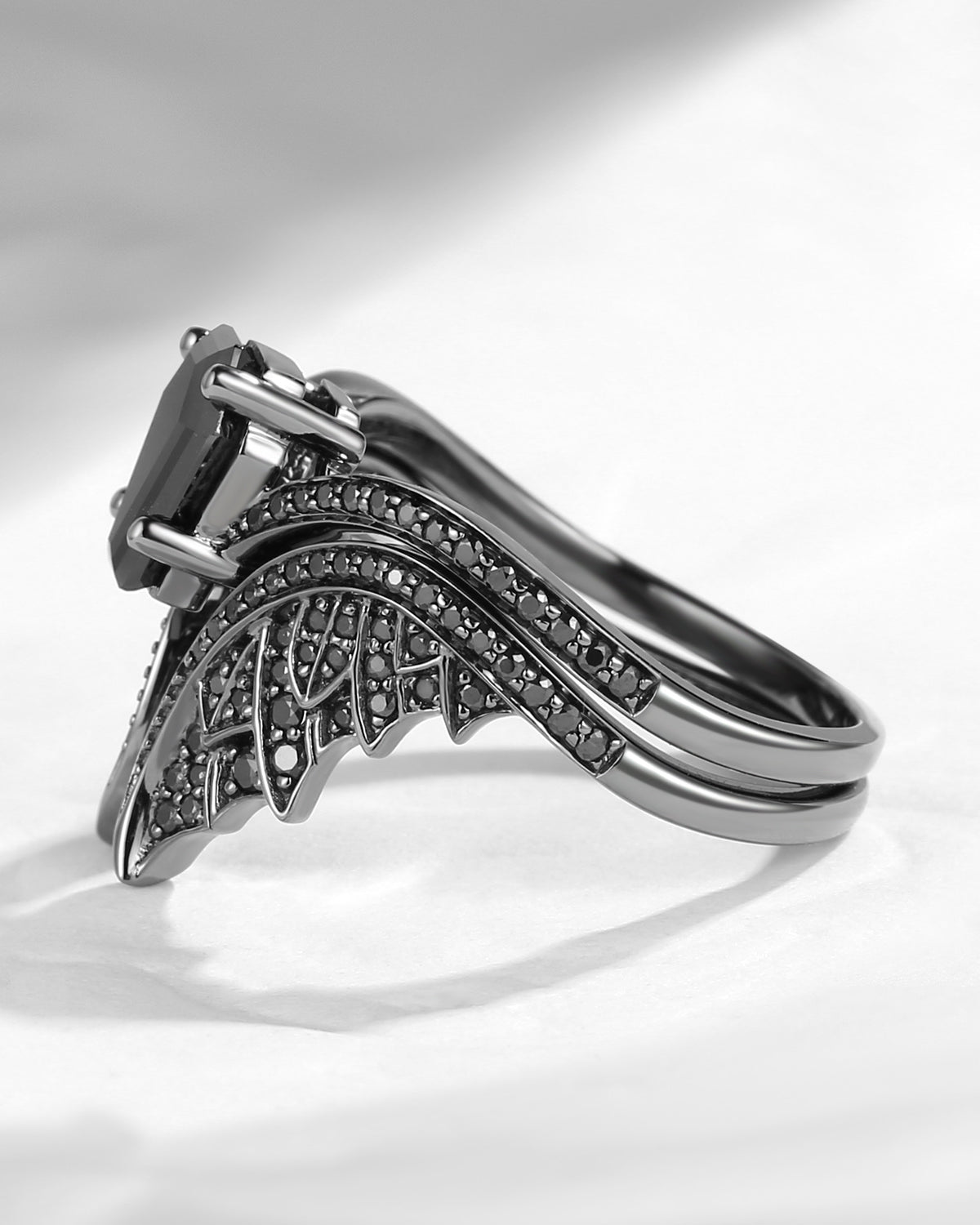 Coffin Cut Black Moissanite Vintage Black Gold Bridal Set 2pcs - Bat Ring