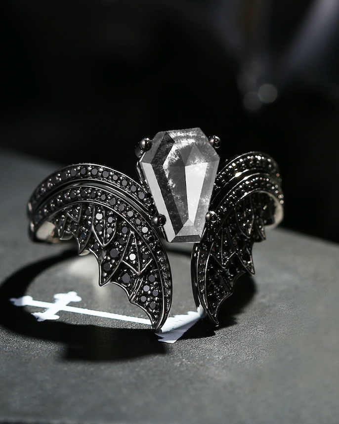 Coffin Cut Salt And Pepper Diamond Vintage Black Gold Bridal Set 2pcs - Bat Ring