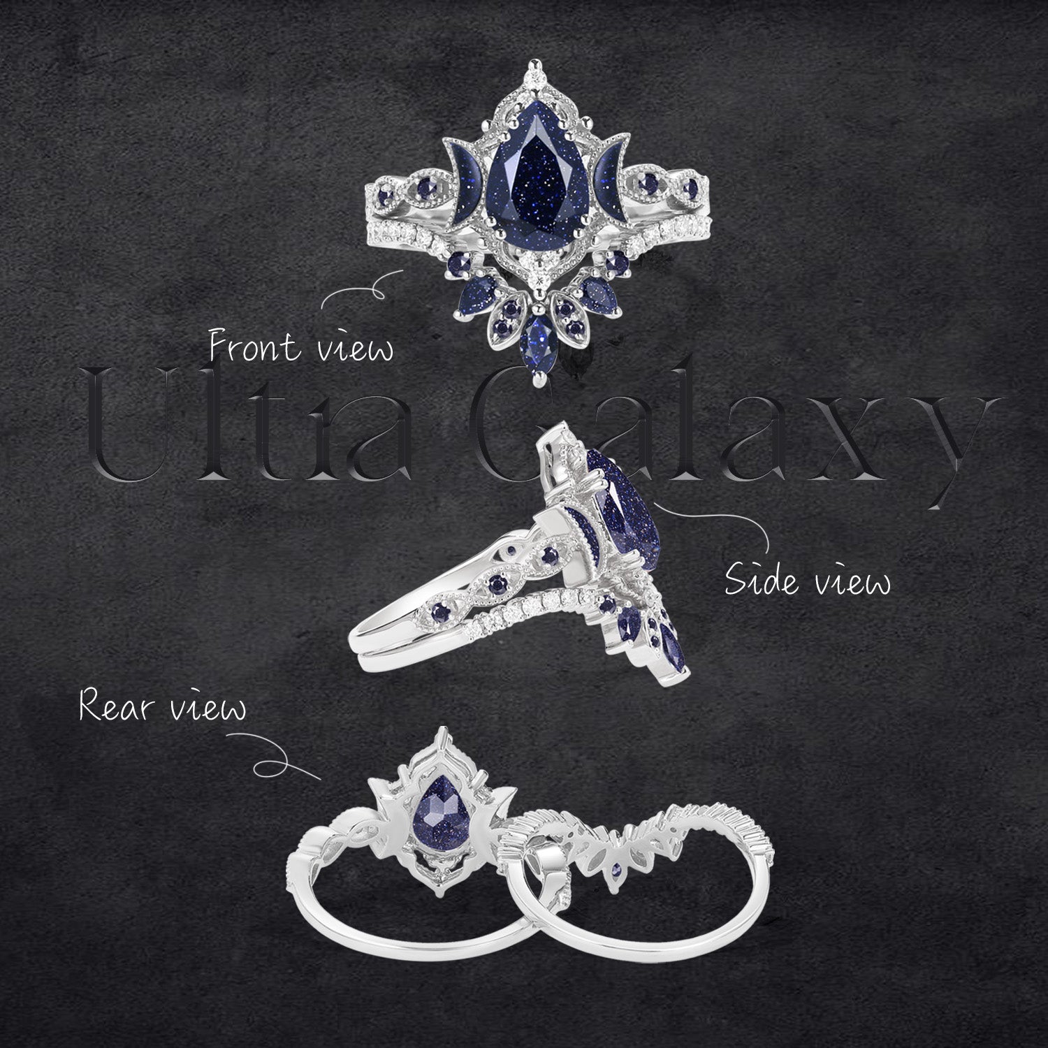 • Design - Two masterfully cut moon shaped gems guarding the center pear, clustered by little sparkly accents, mimicking a galaxy-like setting. A romantic Sci-Fi fiction at its finest.