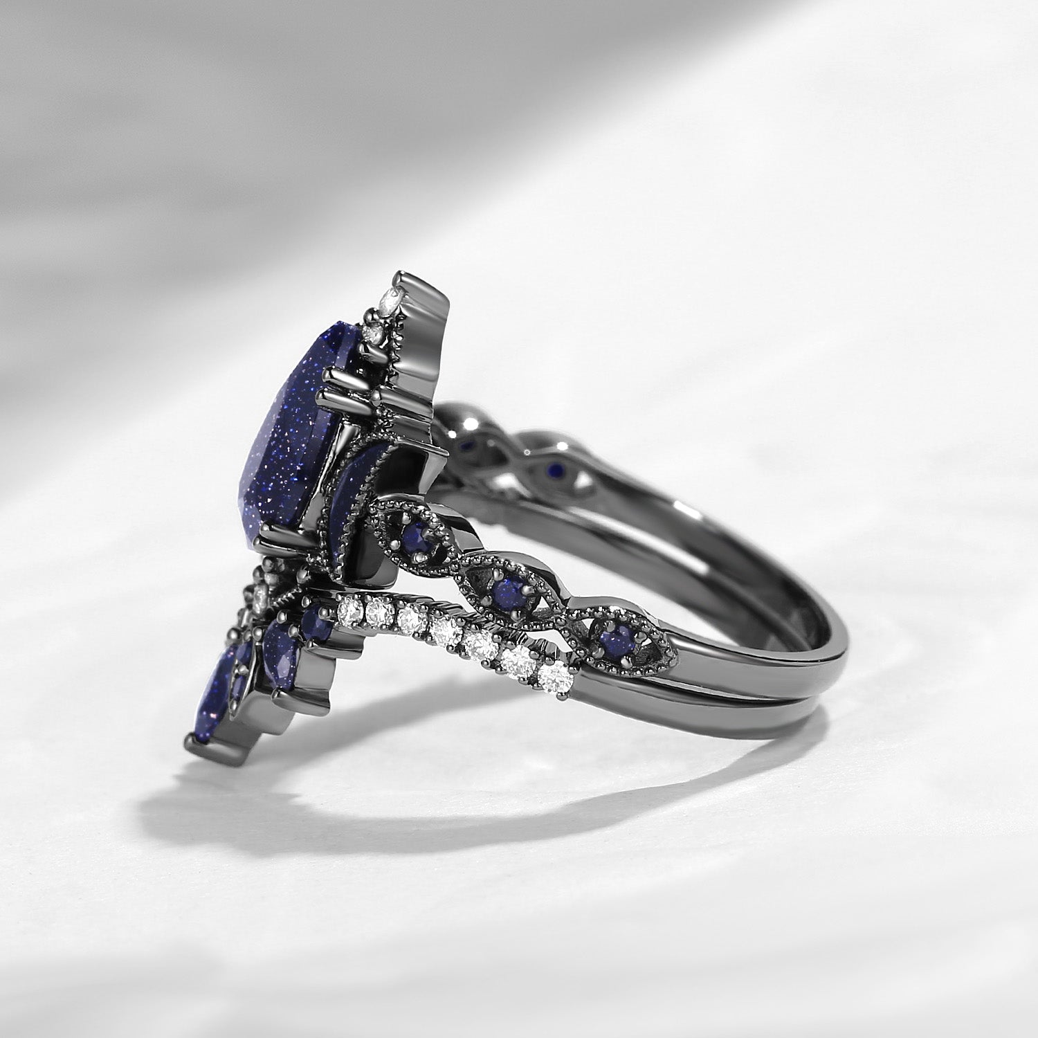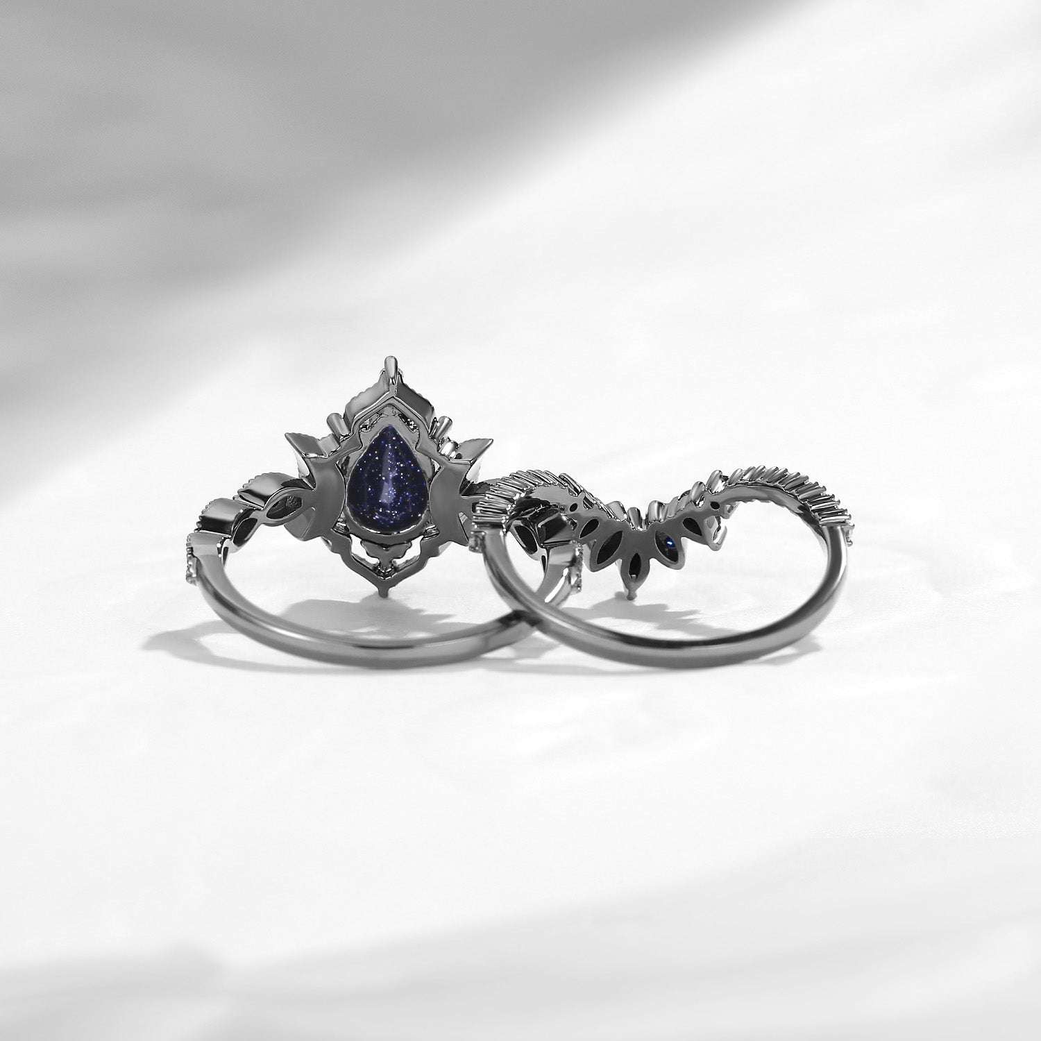 Crescent Moon | Pear Cut Blue Sandstone 'Ultra Galaxy' Black Gold Engagement Ring Set 2pcs