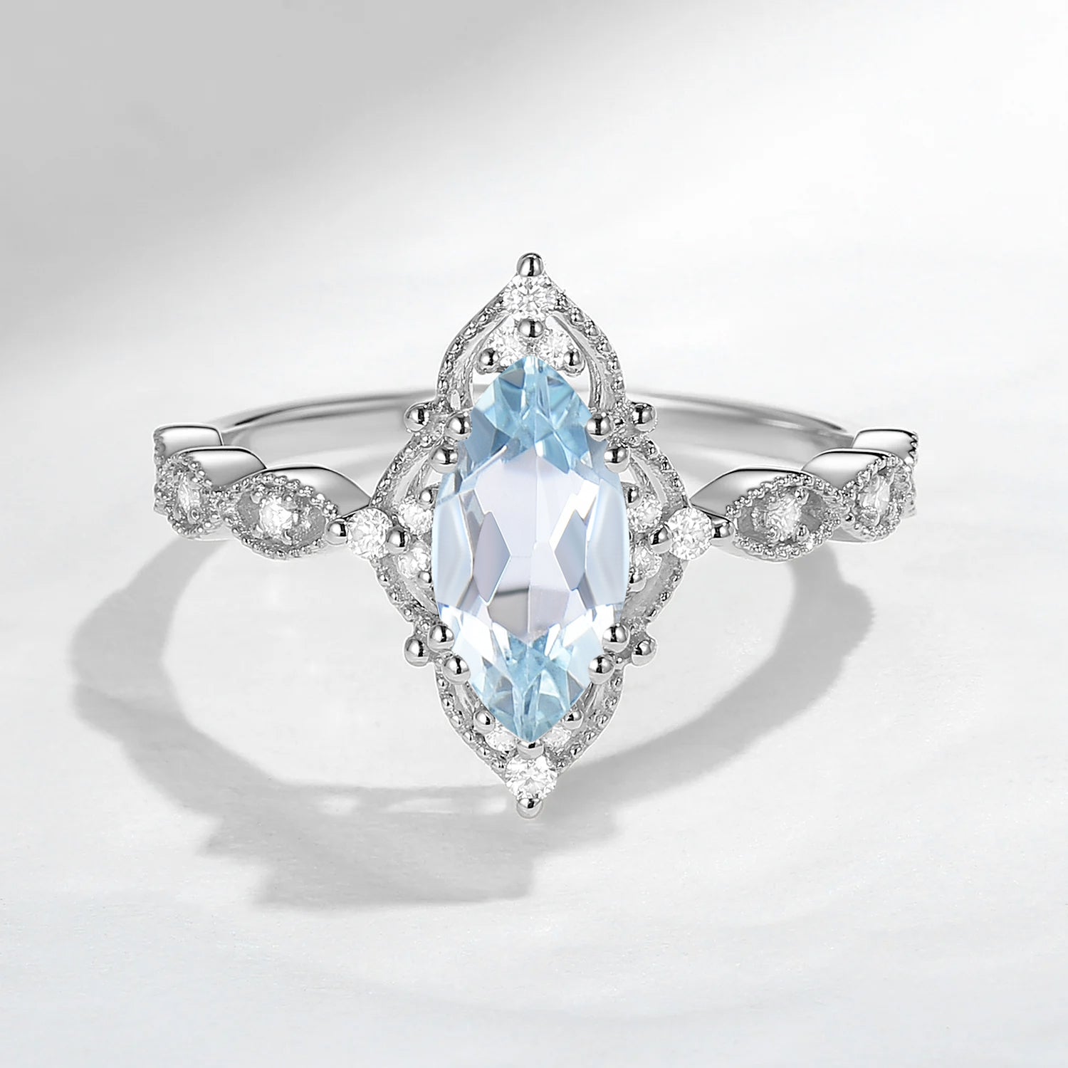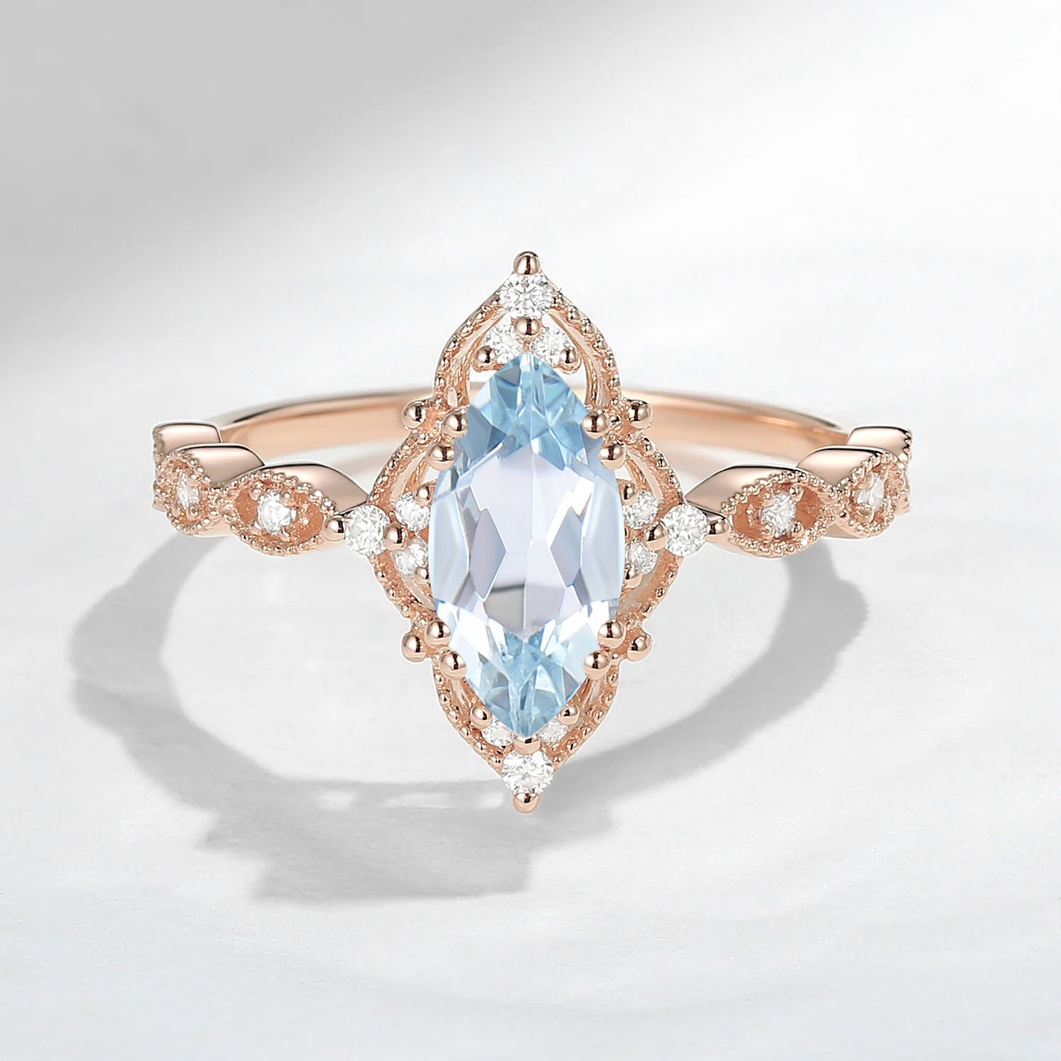 18K Unique Marquise Aquamarine Vintage Inspired Engagement Ring