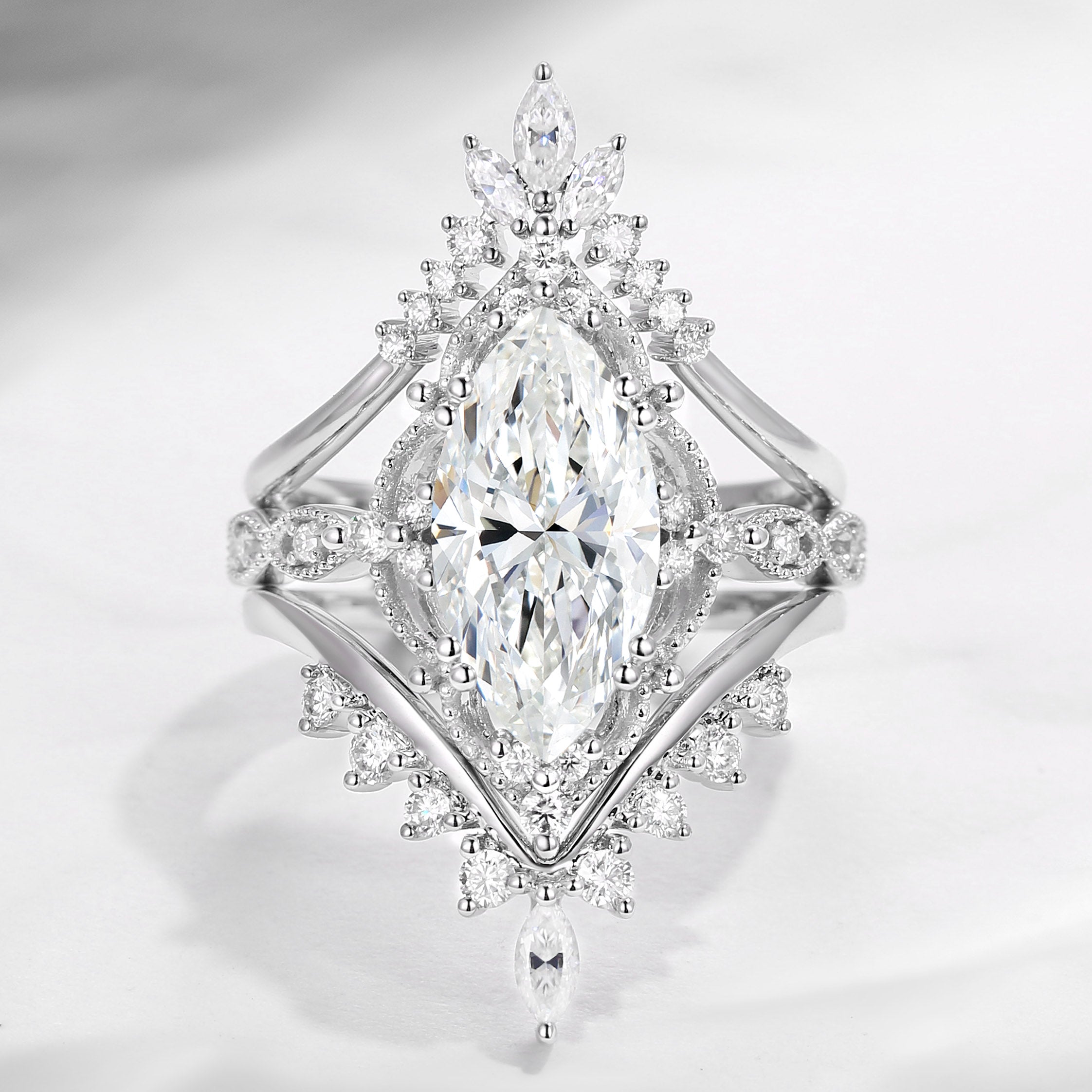 Vintage Inspired Marquise Cut Moissanite Engagement Ring Set 3pcs