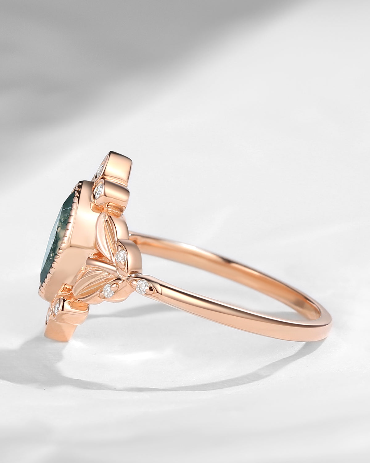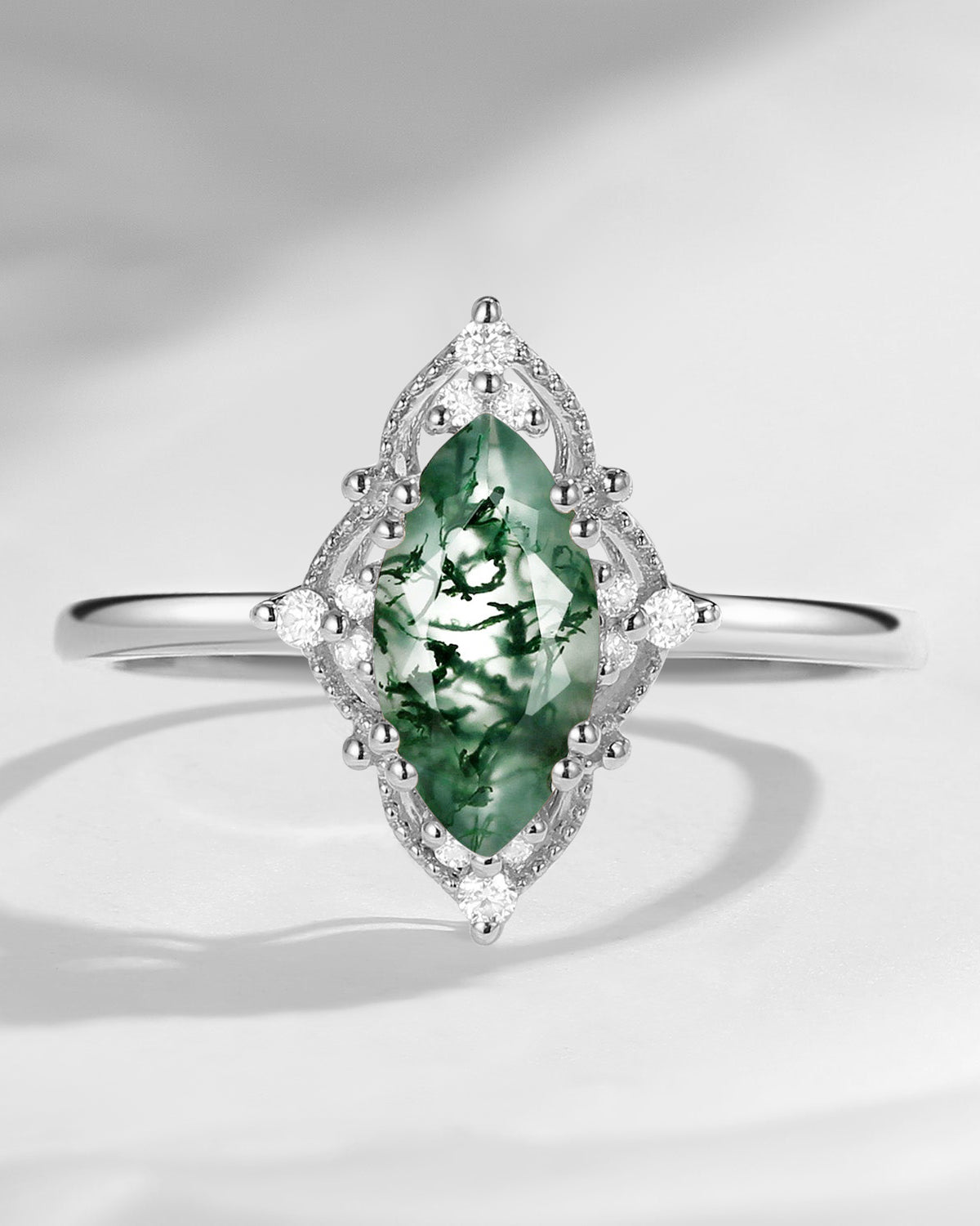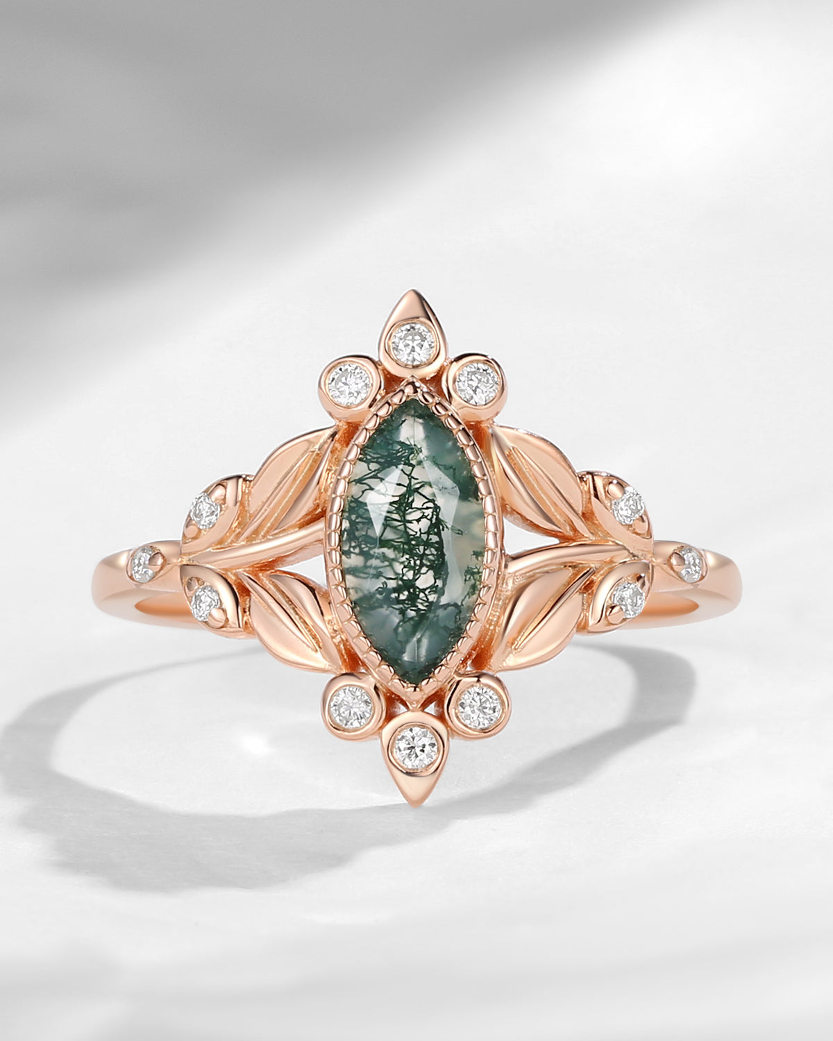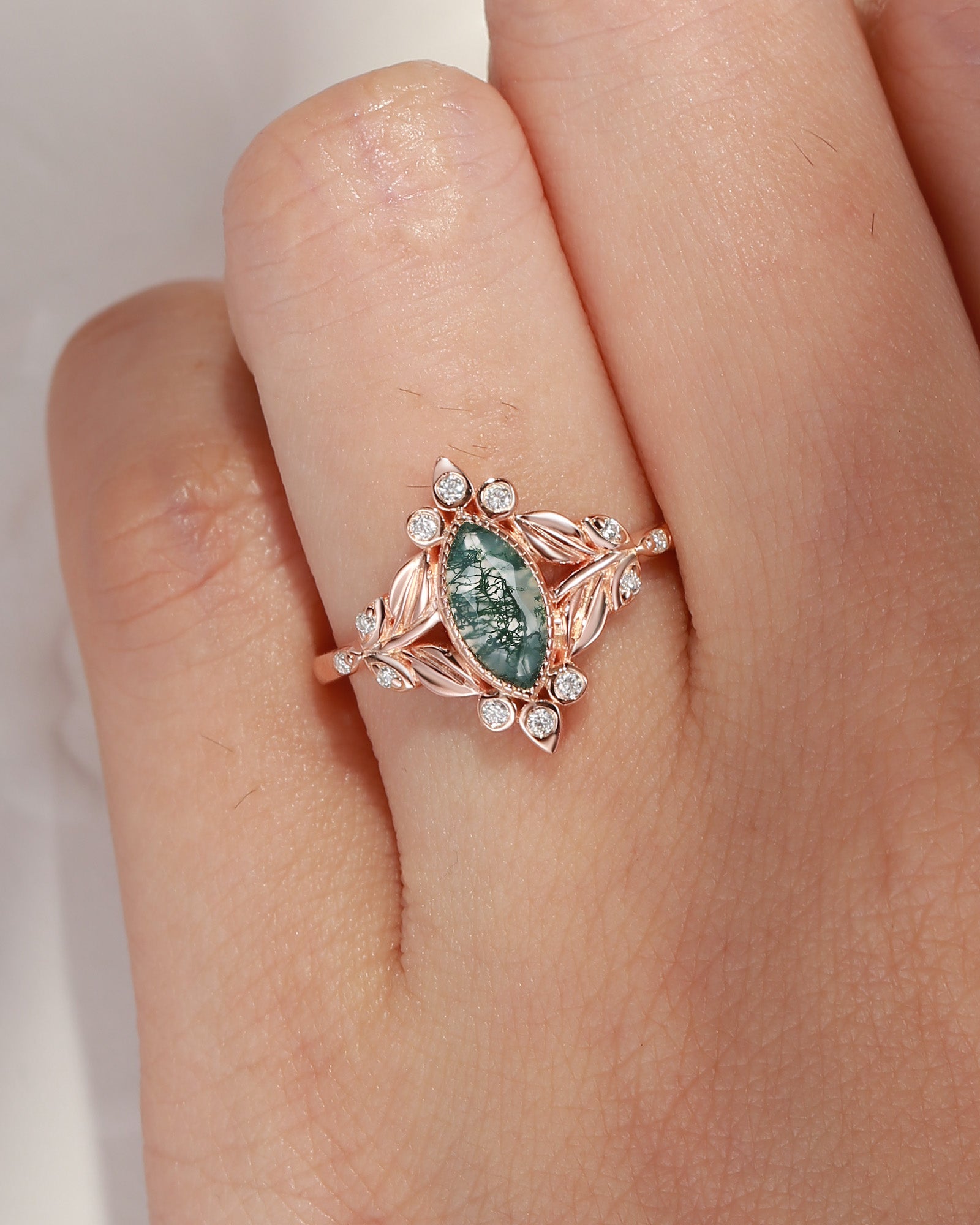 Unique Bezel Marquise Moss Agate Nature Inspired Engagement Ring