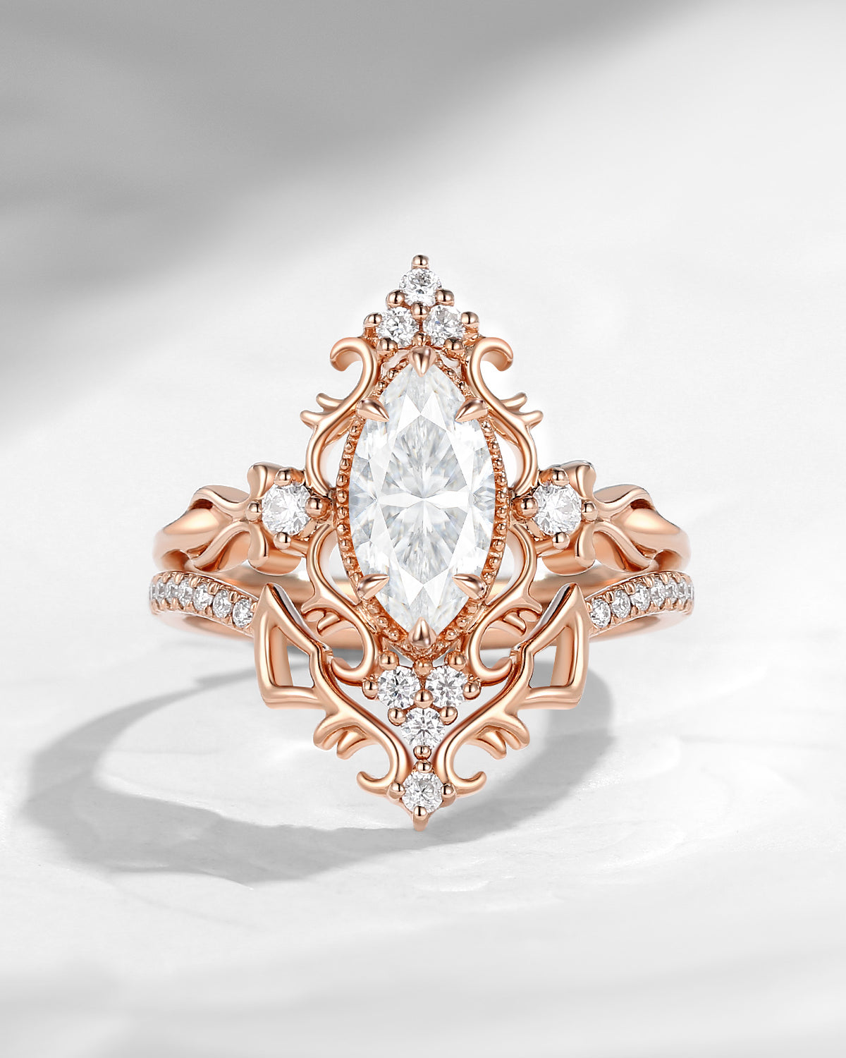 Vintage Inspired Marquise Cut Moissanite Engagement Ring Set 3pcs