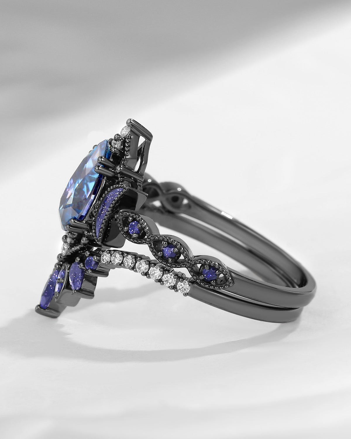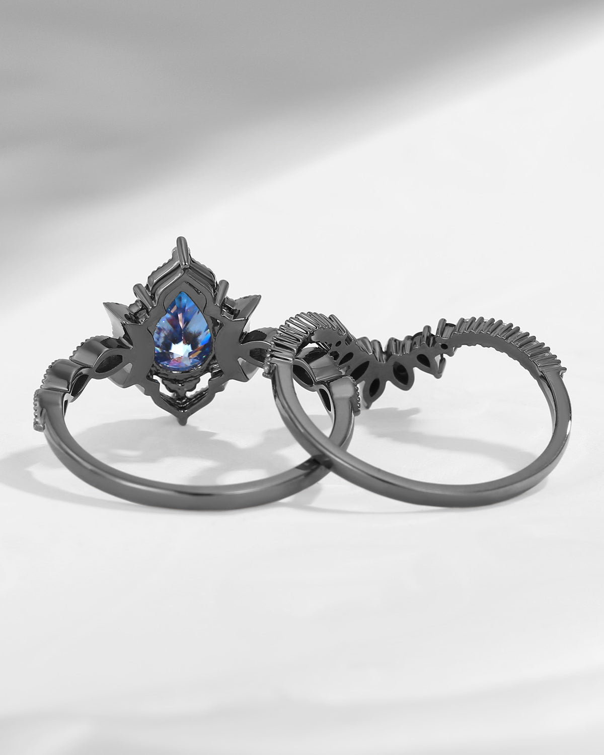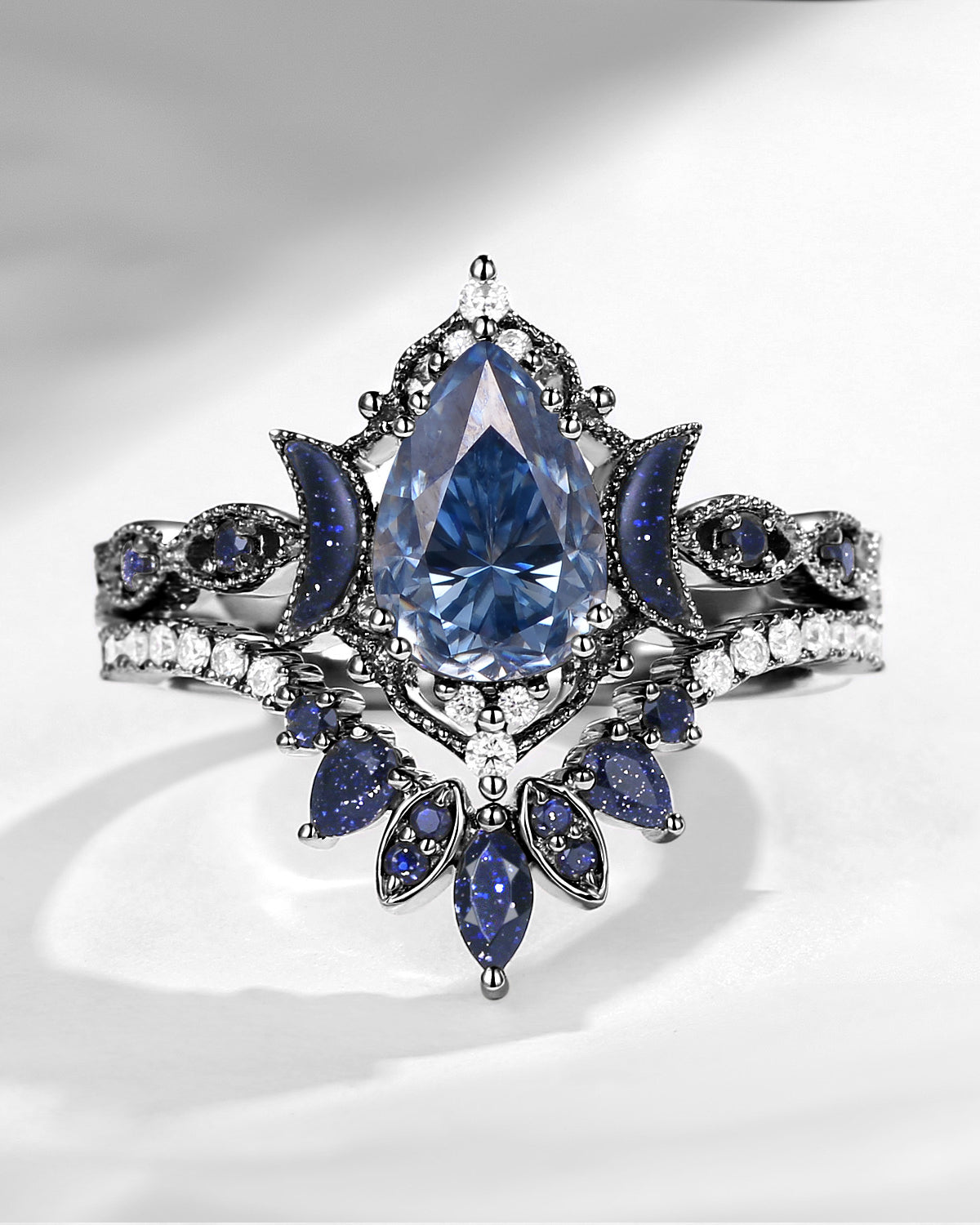Crescent Moon | Pear Cut Blue Moissanite 'Ultra Galaxy' Engagement Ring Set 2pcs