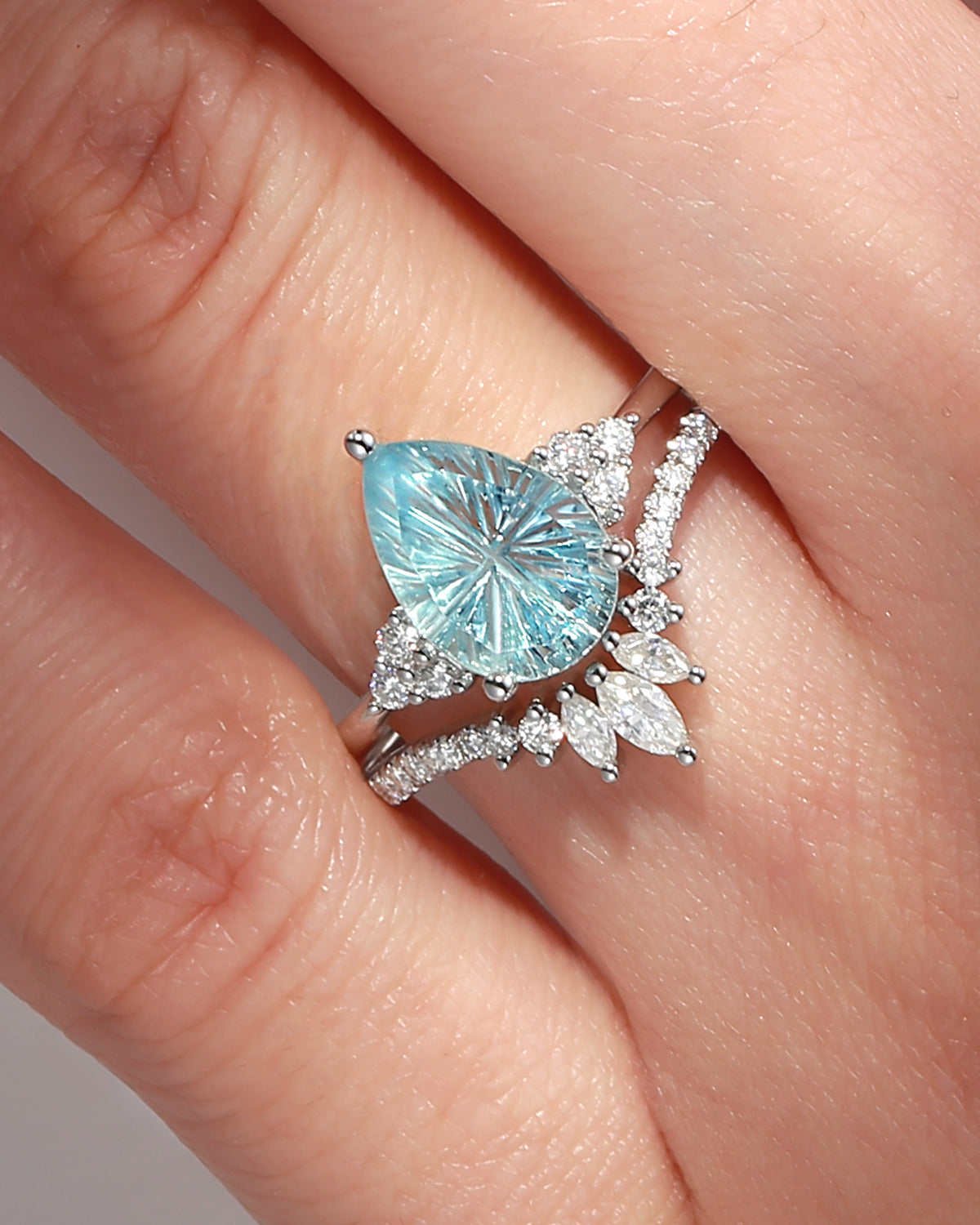 Crescent Moon | Pear Cut Natural Aquamarine 'Ultra Galaxy' Engagement Ring Set 2pcs