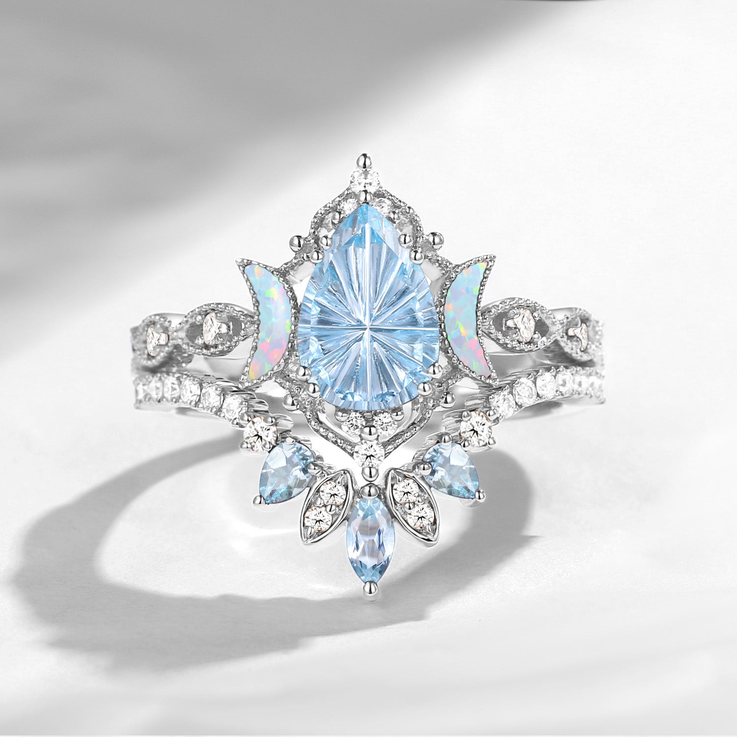 Firework Cut Pear Shaped Natural Aquamarine Engagement Ring Infinity Ring Vintage Style Cluster Moon Wedding Ring Set 2pcs