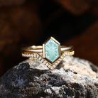 Solitaire Fantasy Carved Long Hexagon Firework Cut Lab Mint Sapphire Bridal Set 2pcs