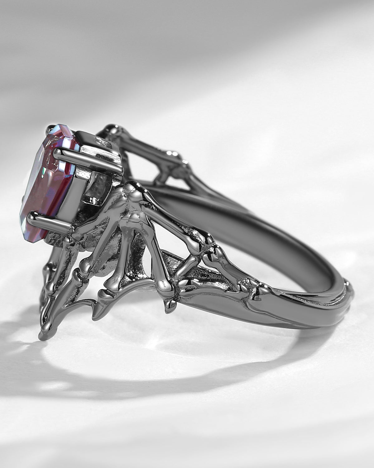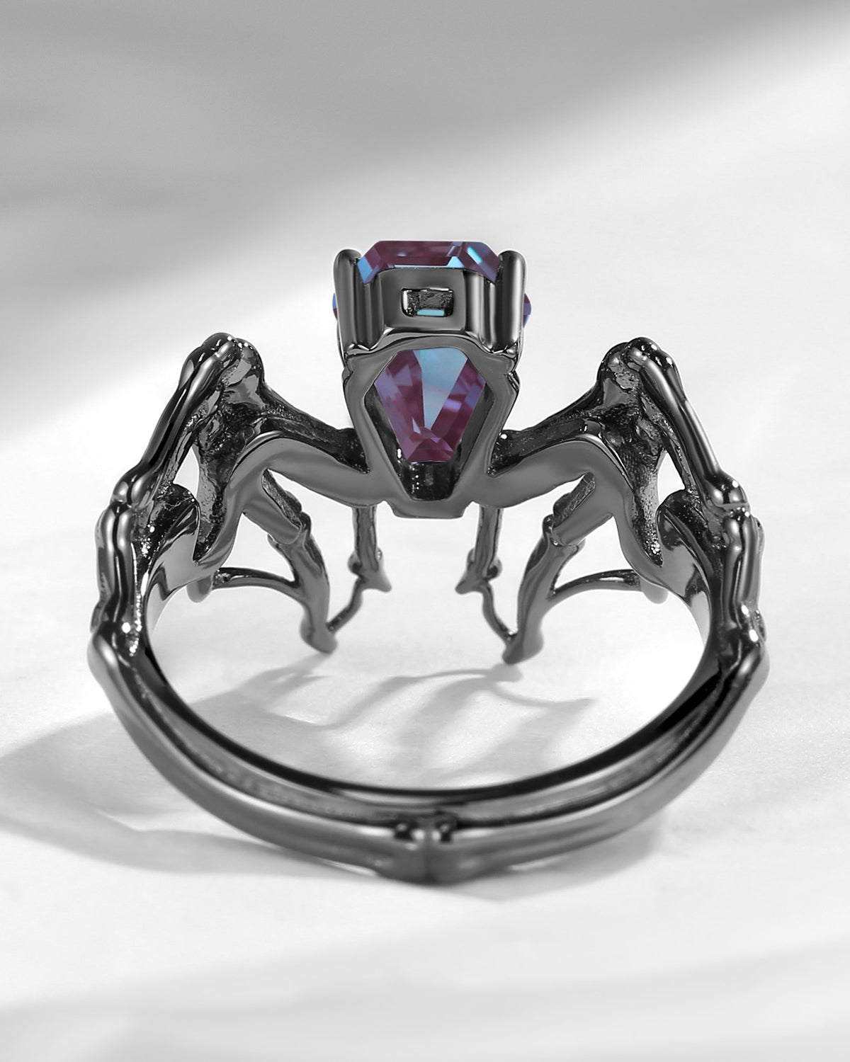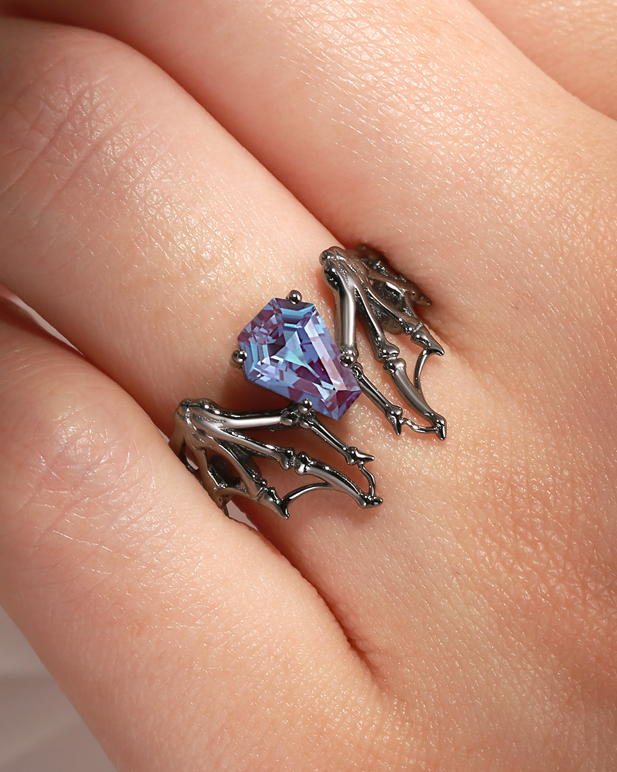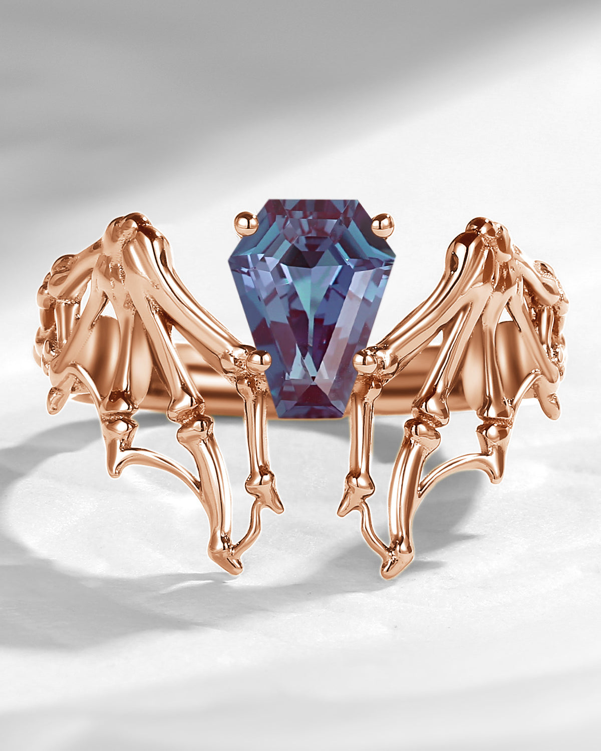 Coffin Cut Lab Alexandrite Vintage White Gold Bridal Set 2pcs - Bat Ring