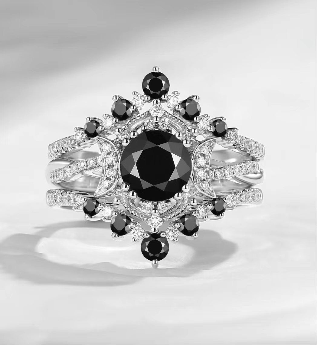 Crescent Moon | Unique Infinity Round Cut Black Moissanite Engagement Ring Set 3pcs
