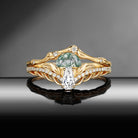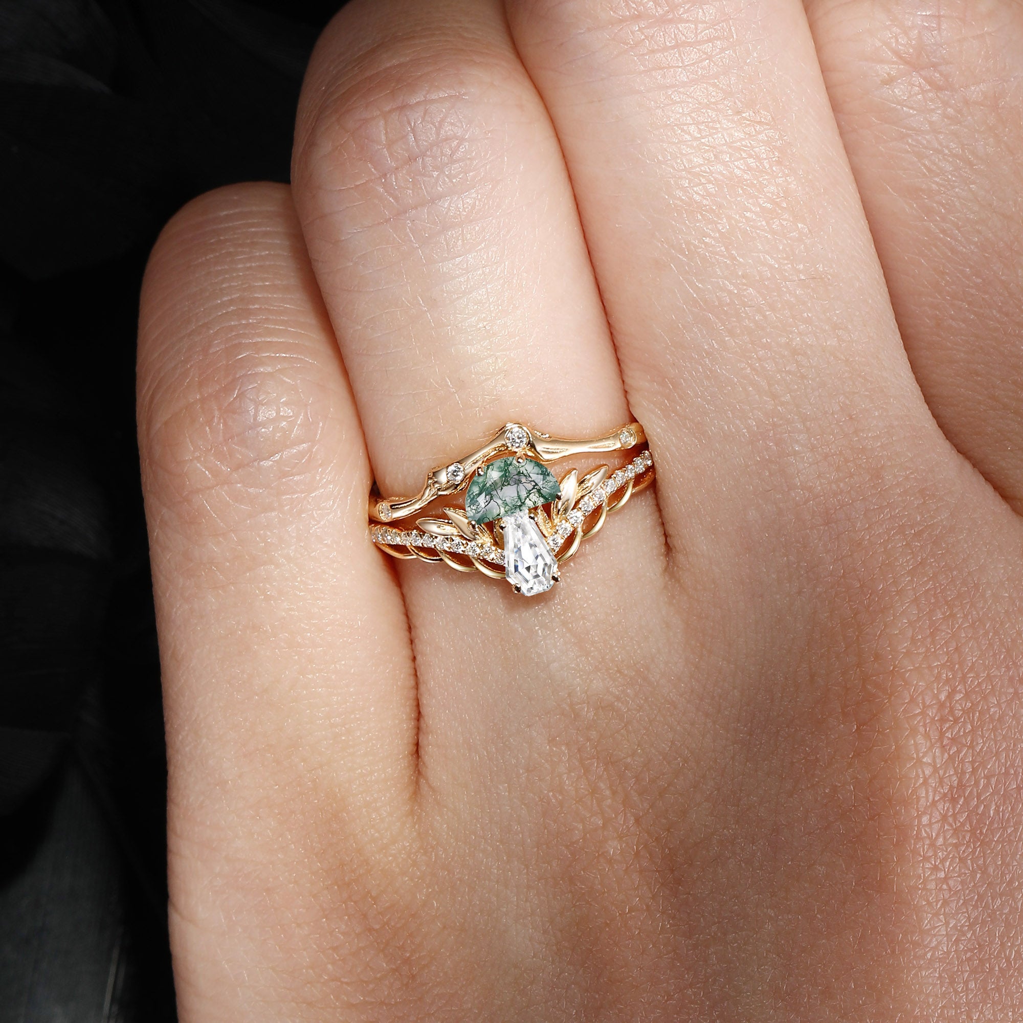 Nature Inspired Bark Textured 'Tree of Life' Half Moon Moss Agate & Coffin Moissanite Mushroom Engagement Ring Set 2pcs