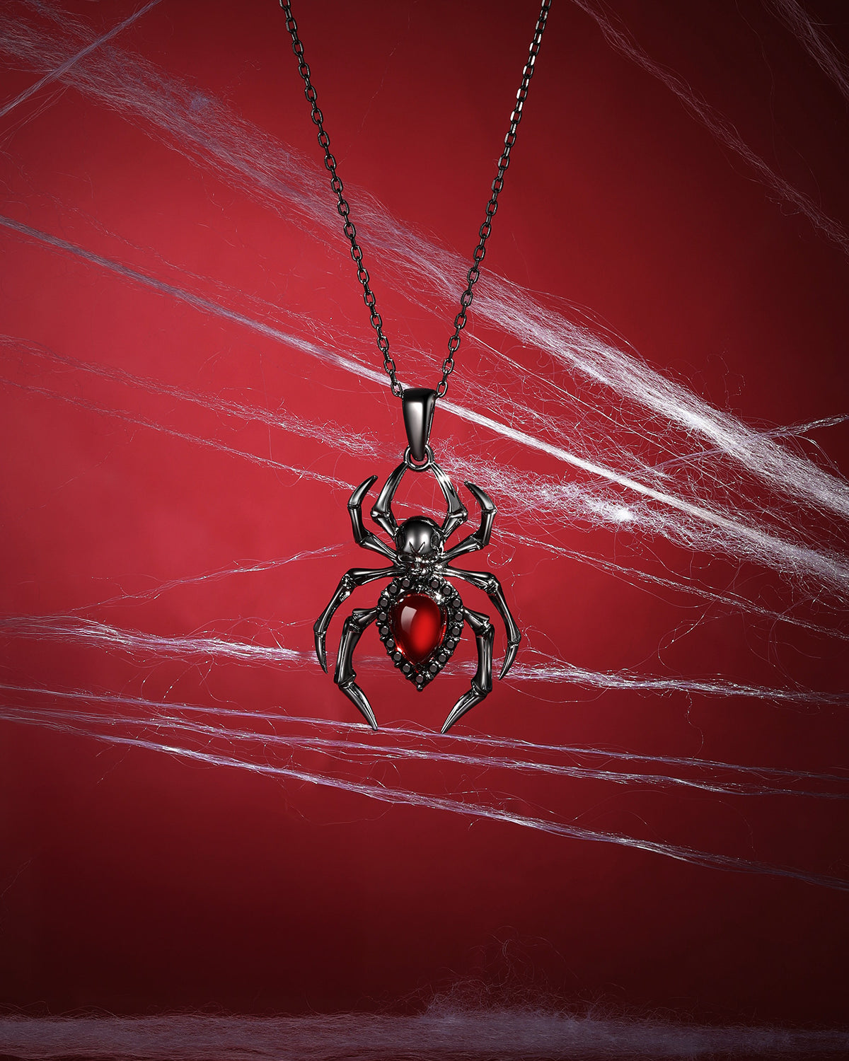 Deluxe Unique Spider & Skull Pear Cut Garnet Halloween Gothic Pendant Necklace