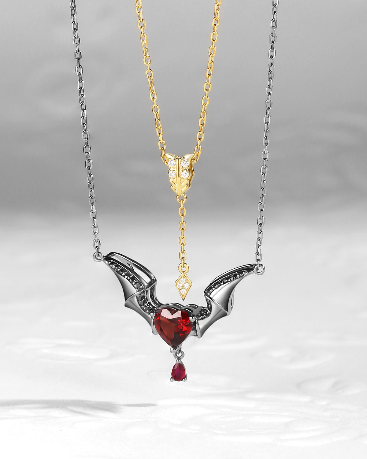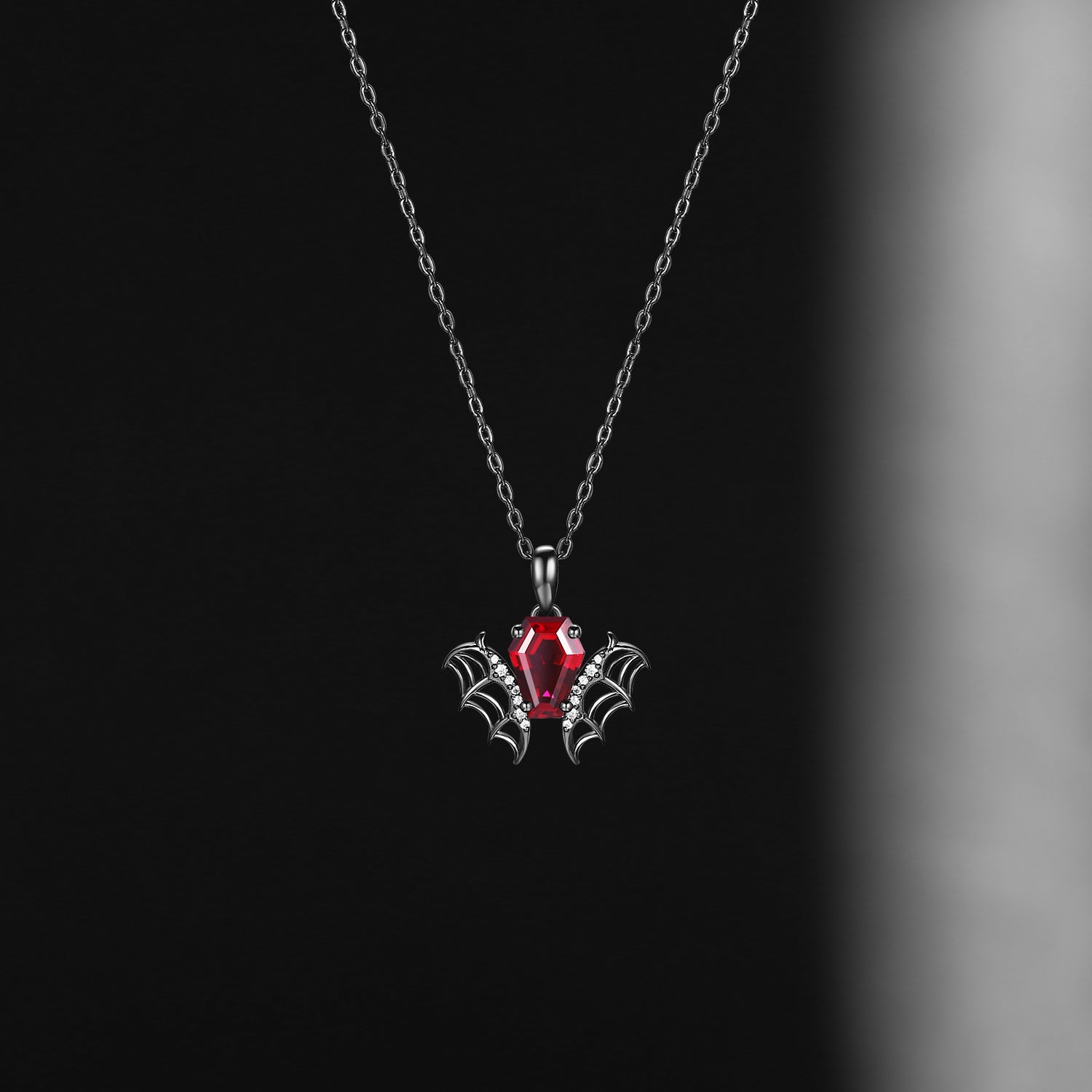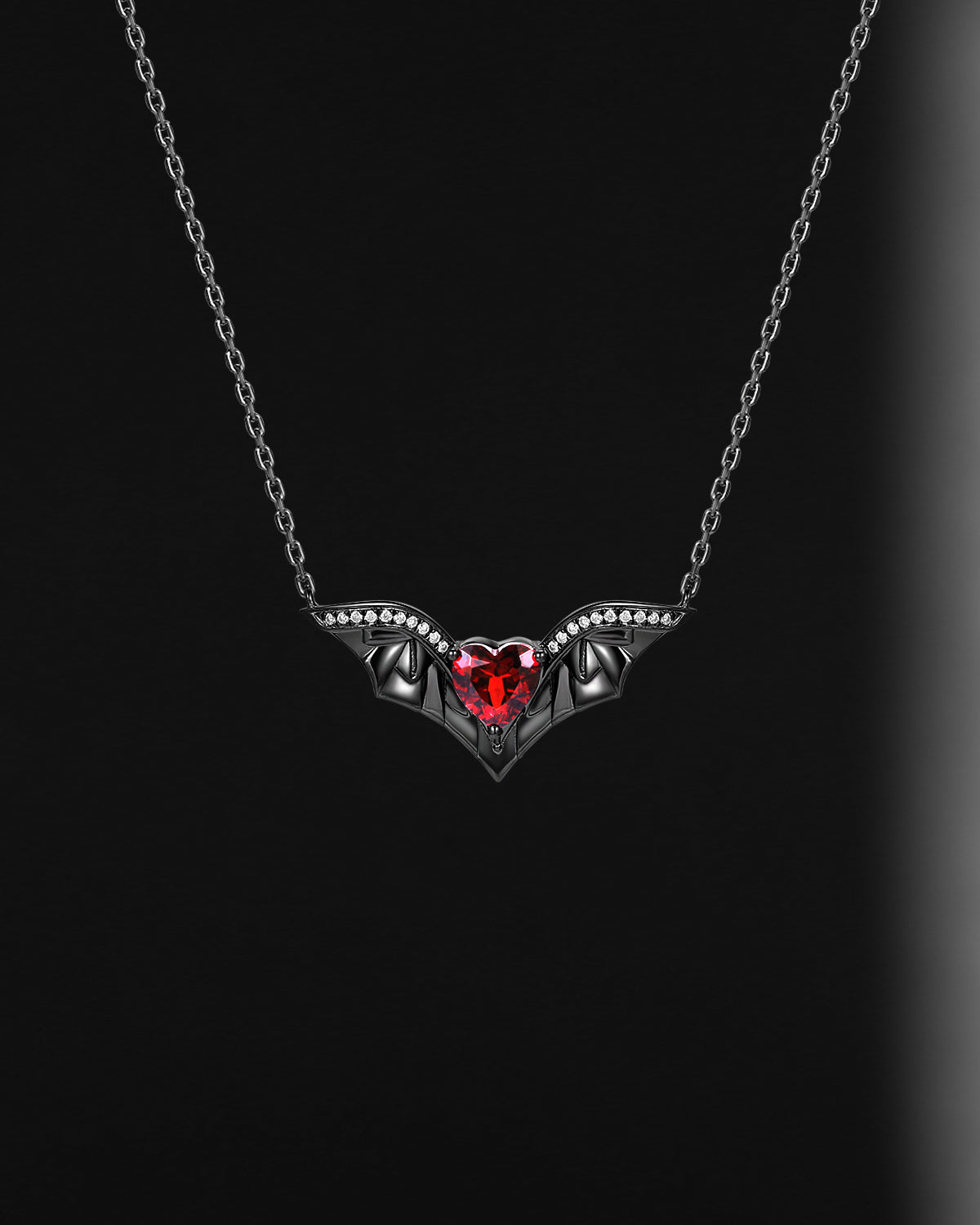 Unique Heart Shaped Garnet Necklace Bat Wing Halloween Jewelry