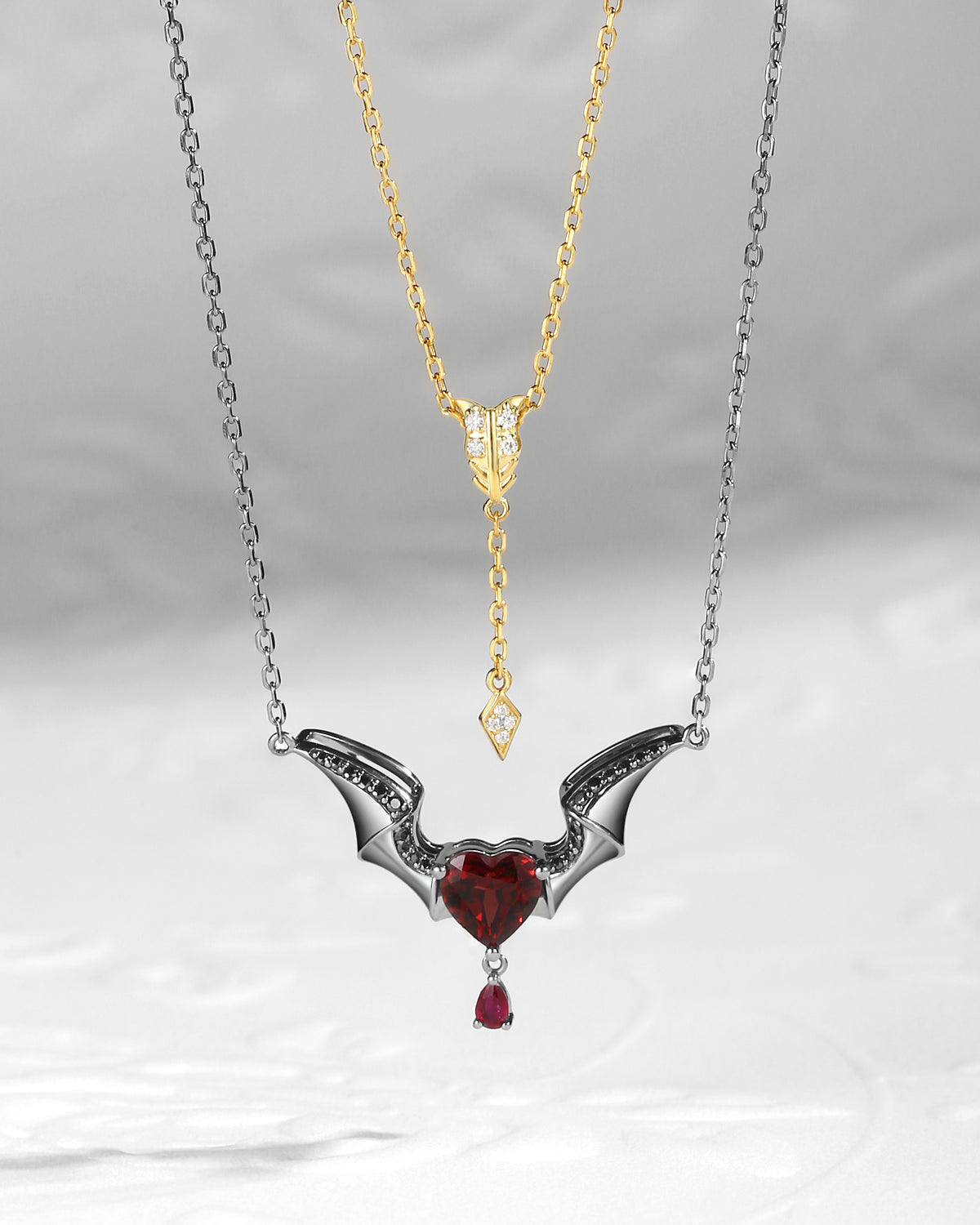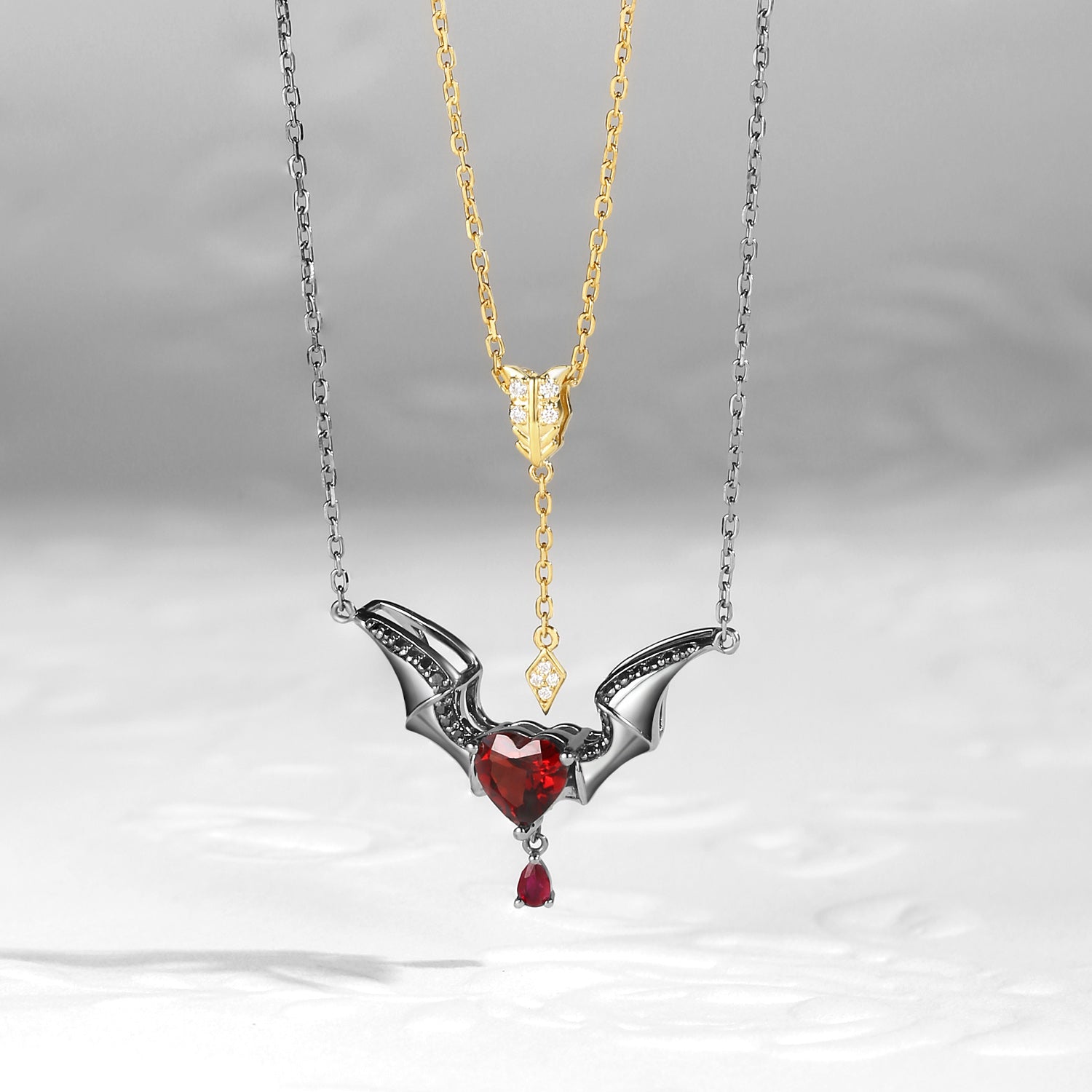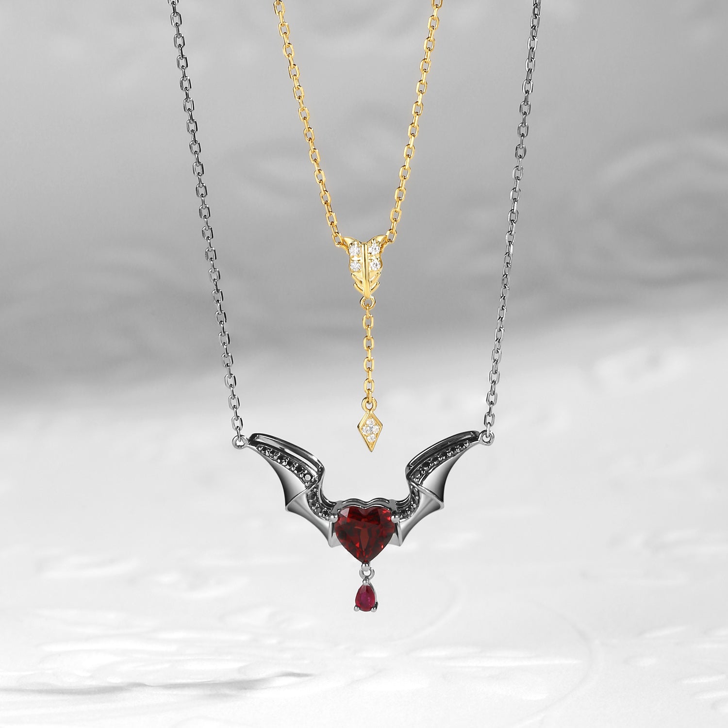Unique Heart Shaped Garnet Necklace Bat Wing Halloween Jewelry