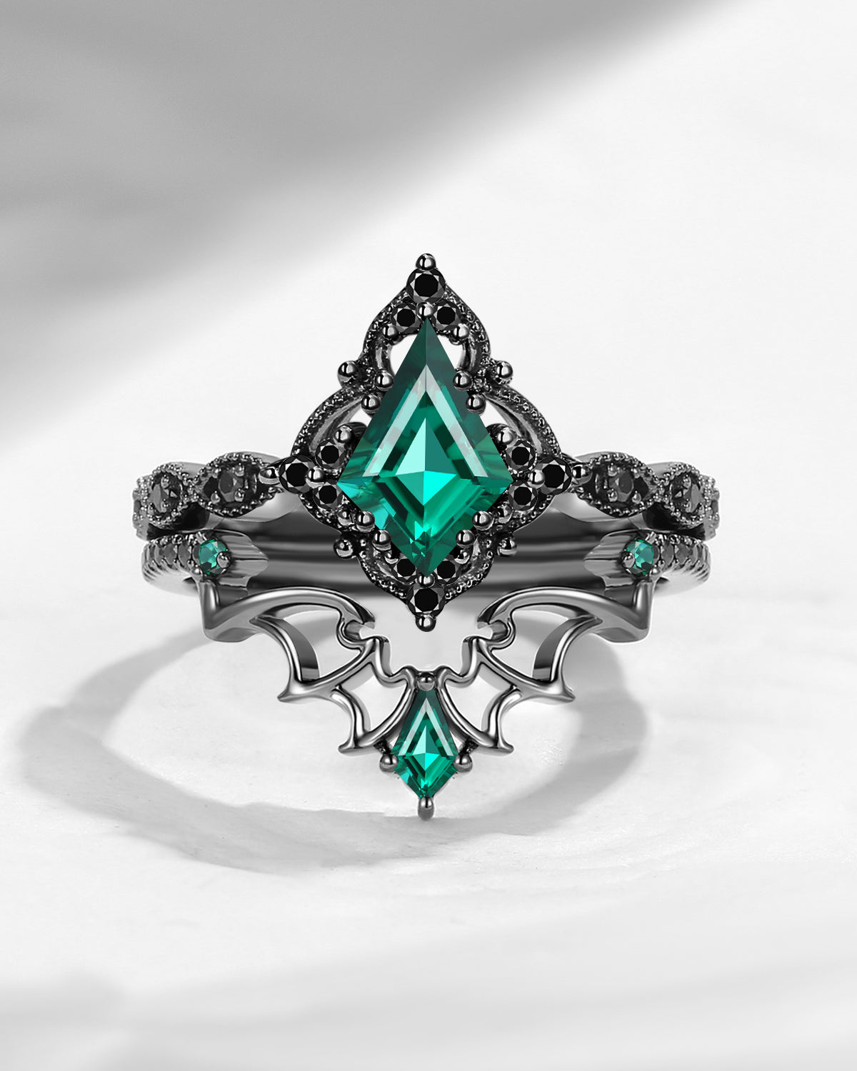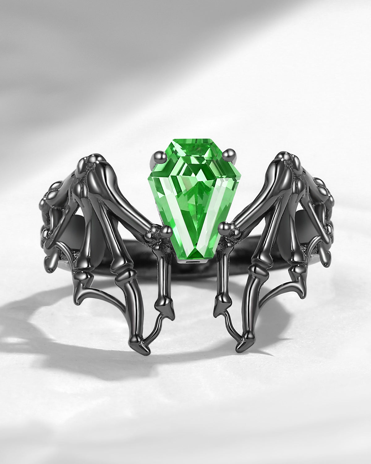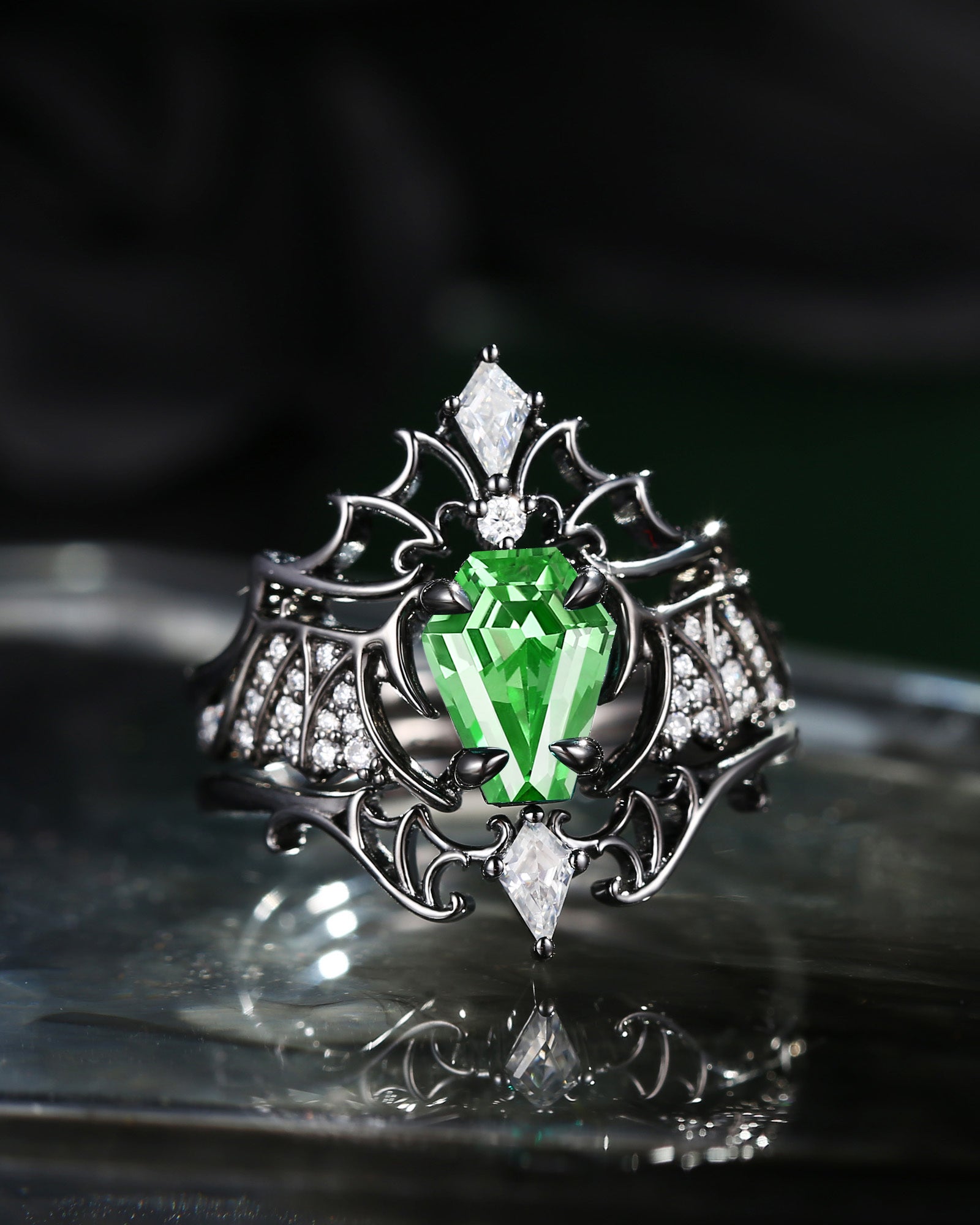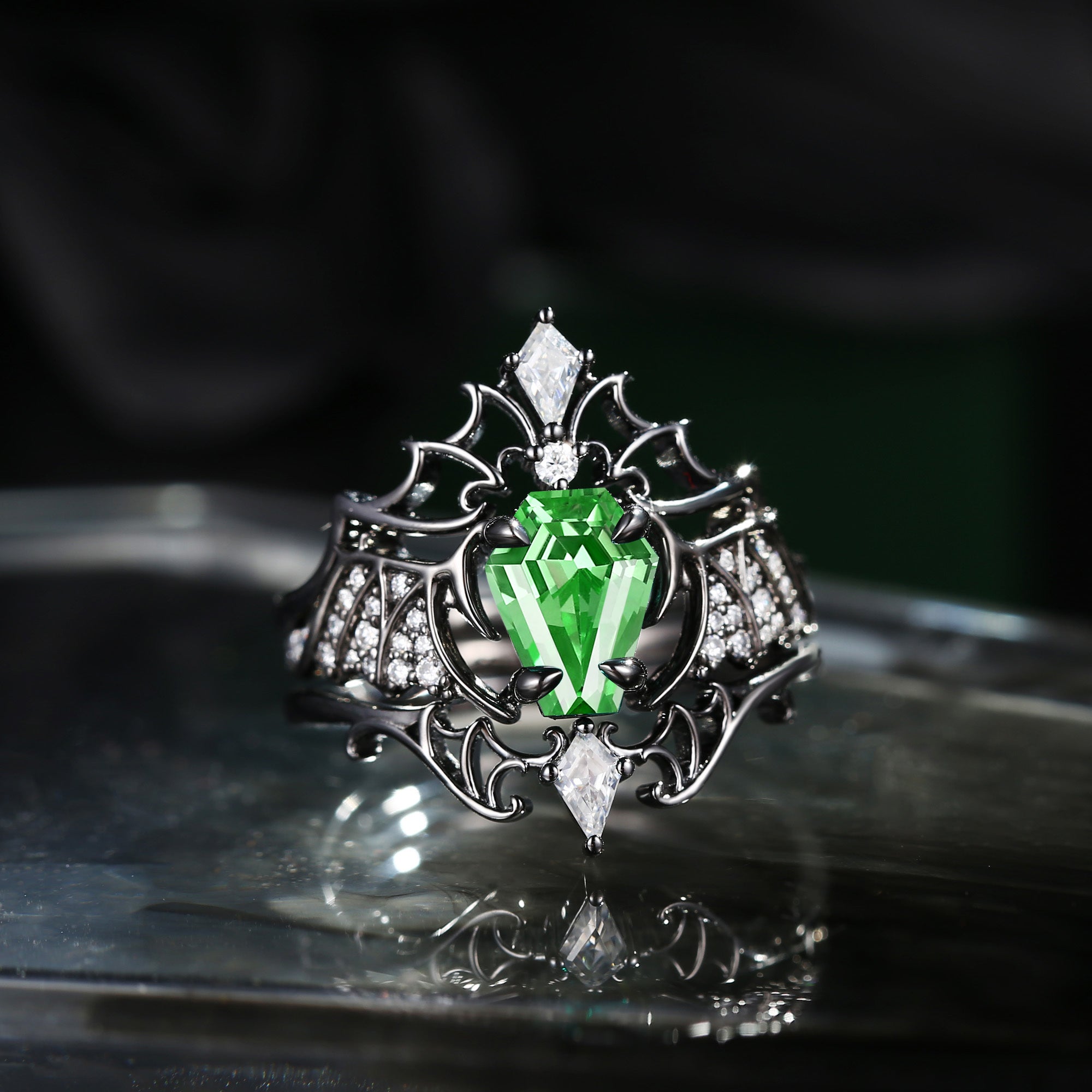 Lab Tsavorite Coffin Cut Vintage Inspired Black Gold Engagement Ring - Bat Ring