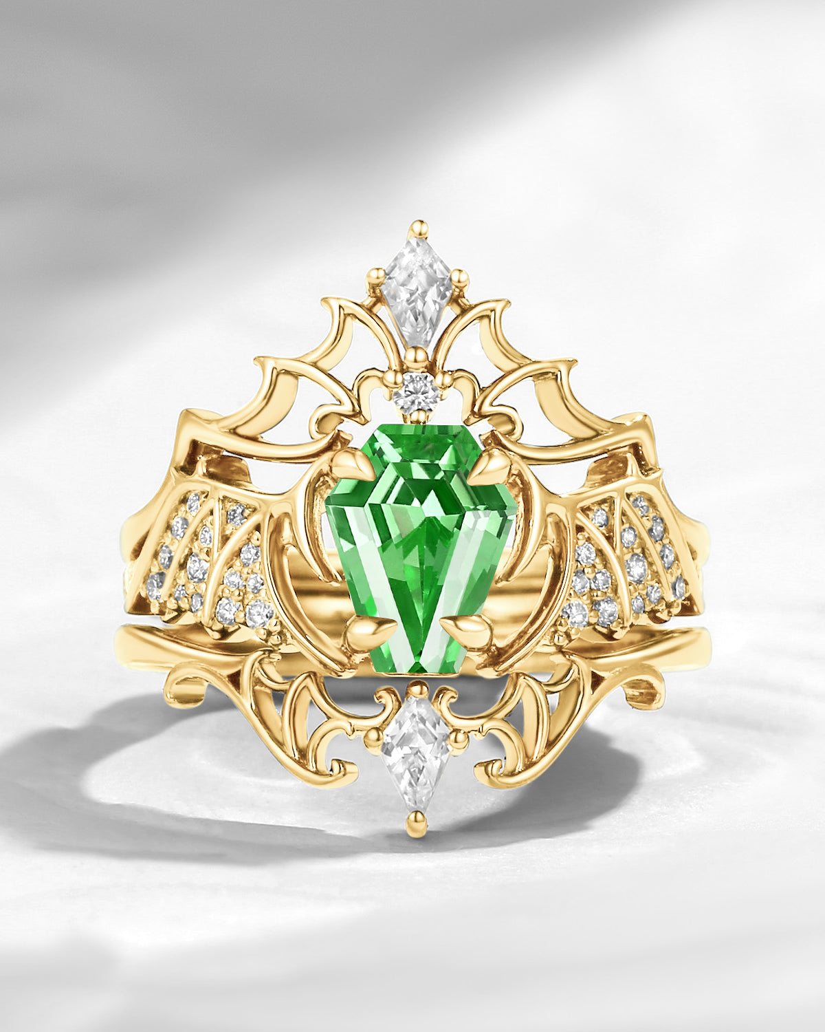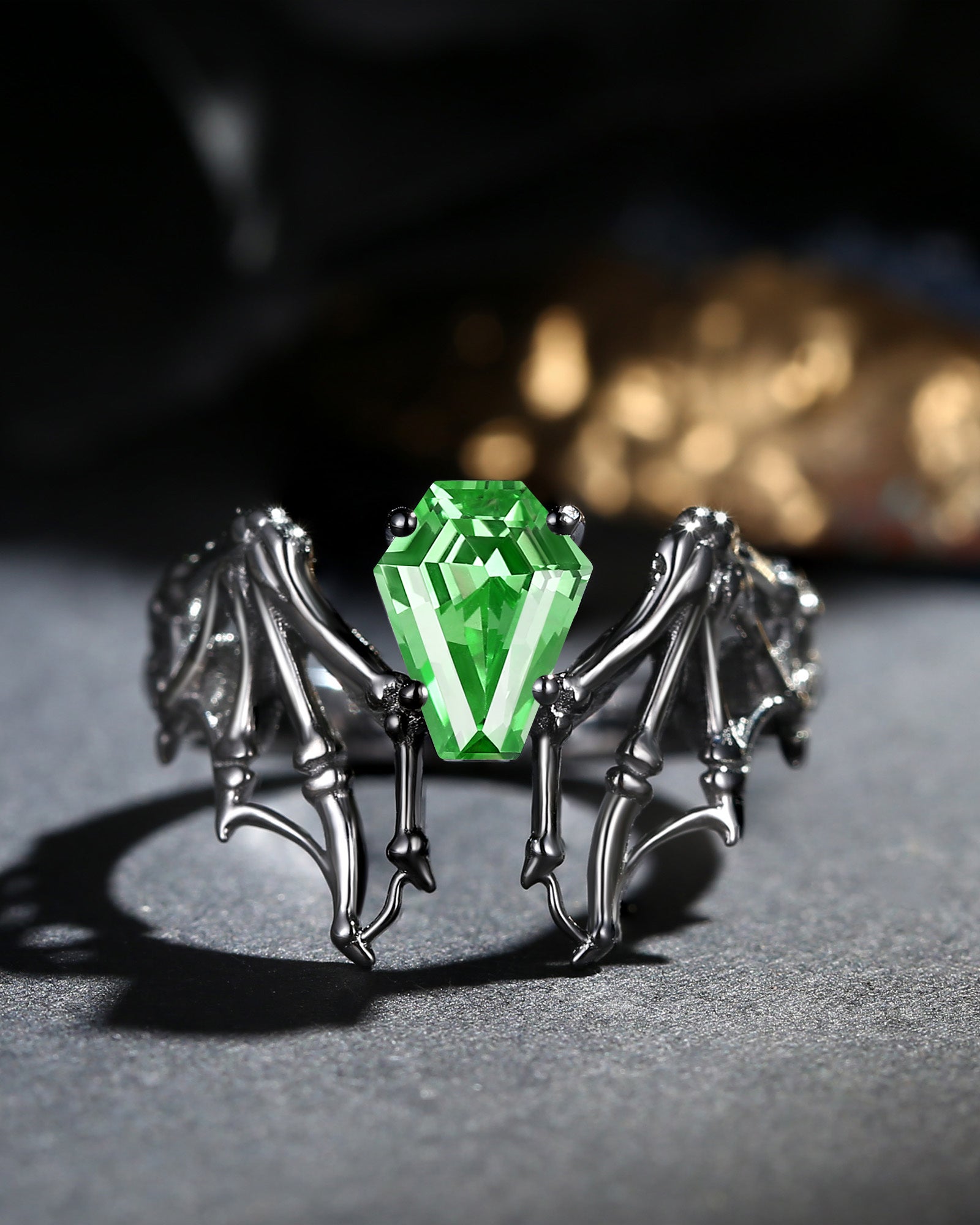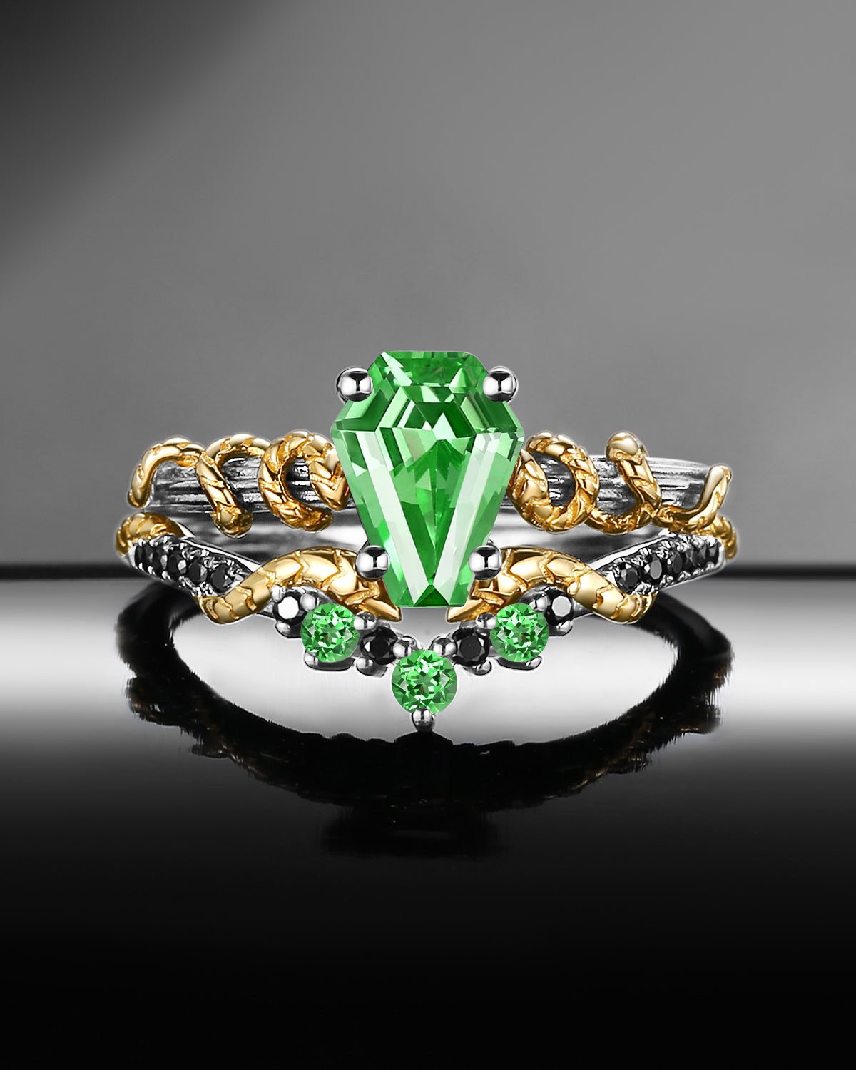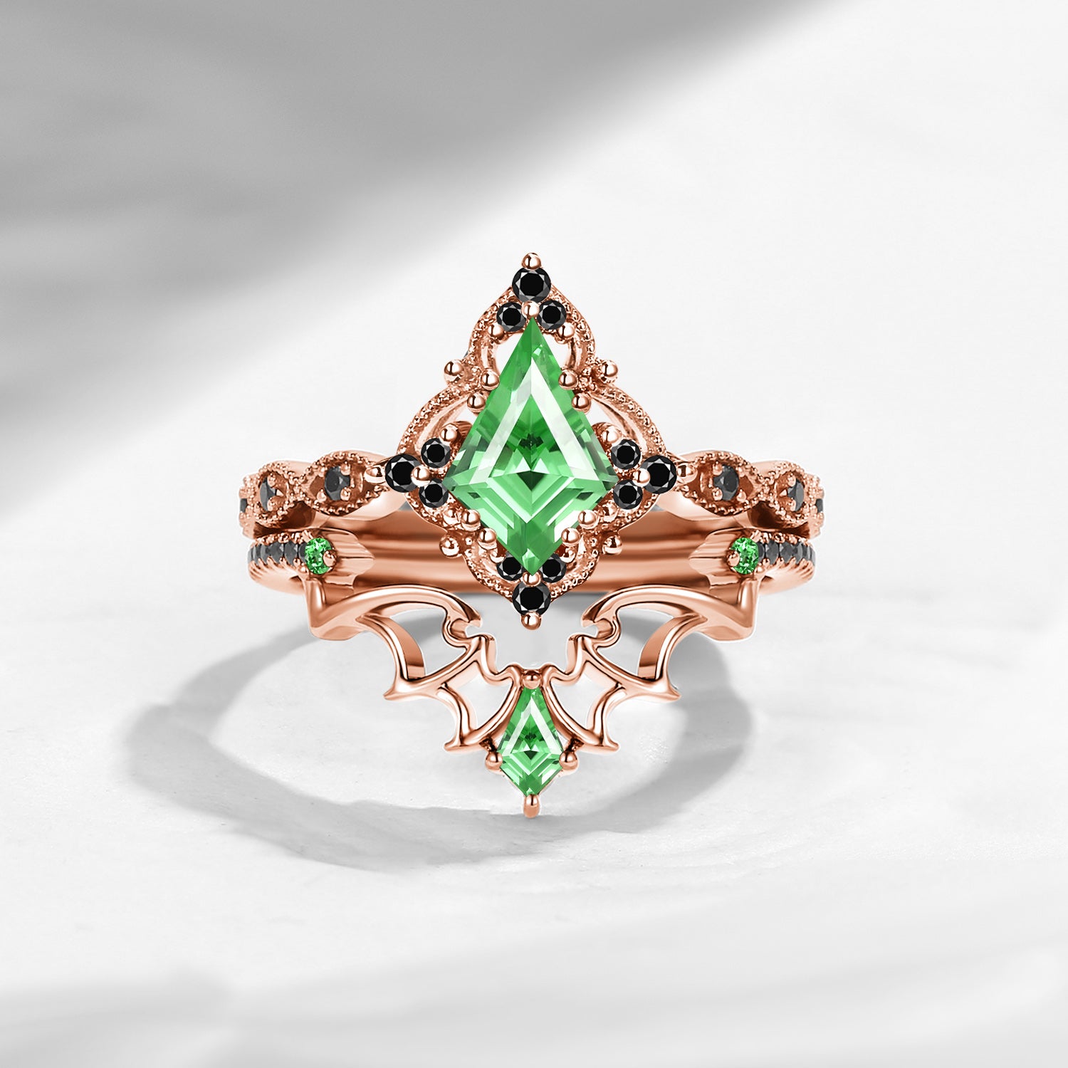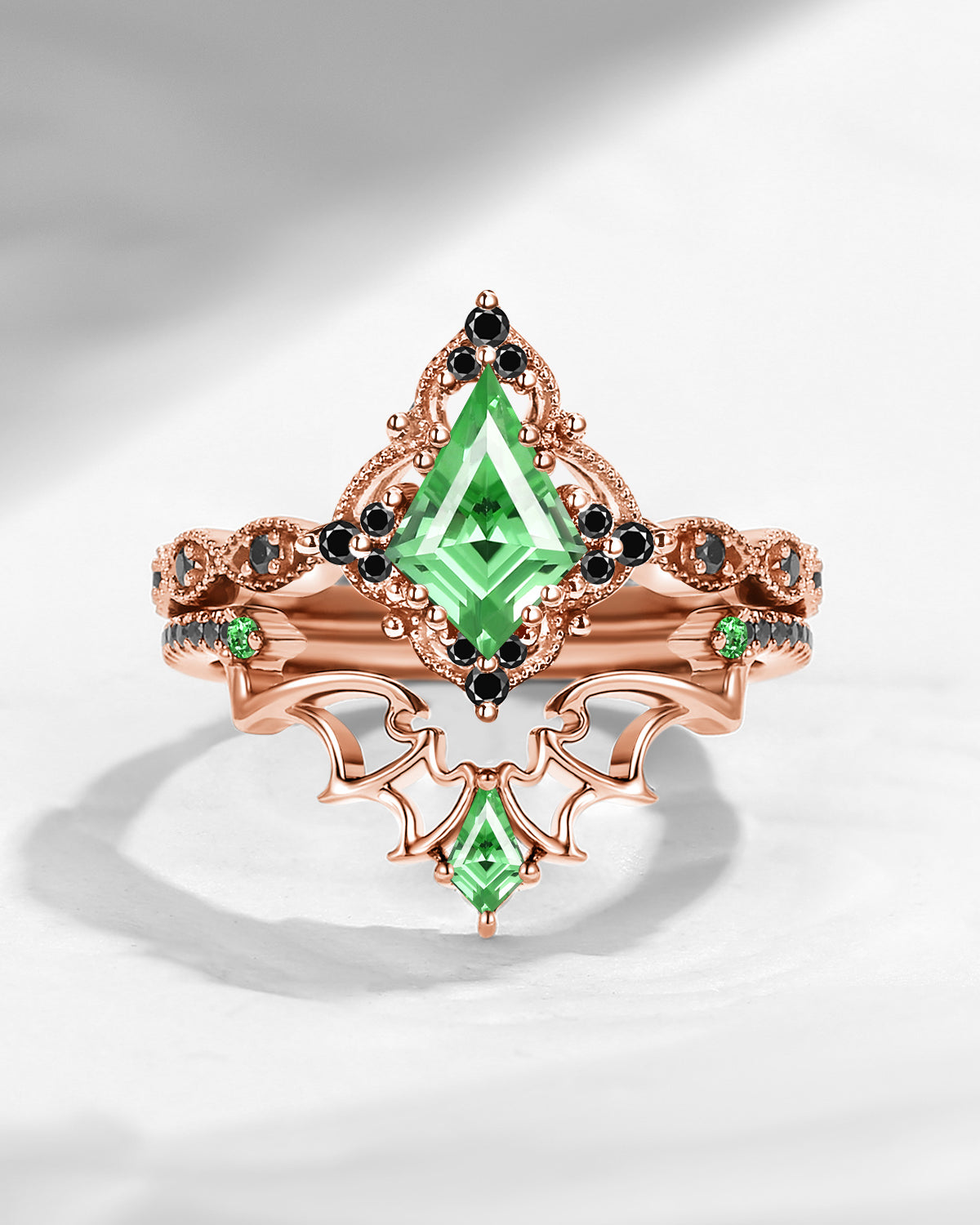 Lab Tsavorite Coffin Cut Vintage Inspired Black Gold Engagement Ring - Bat Ring