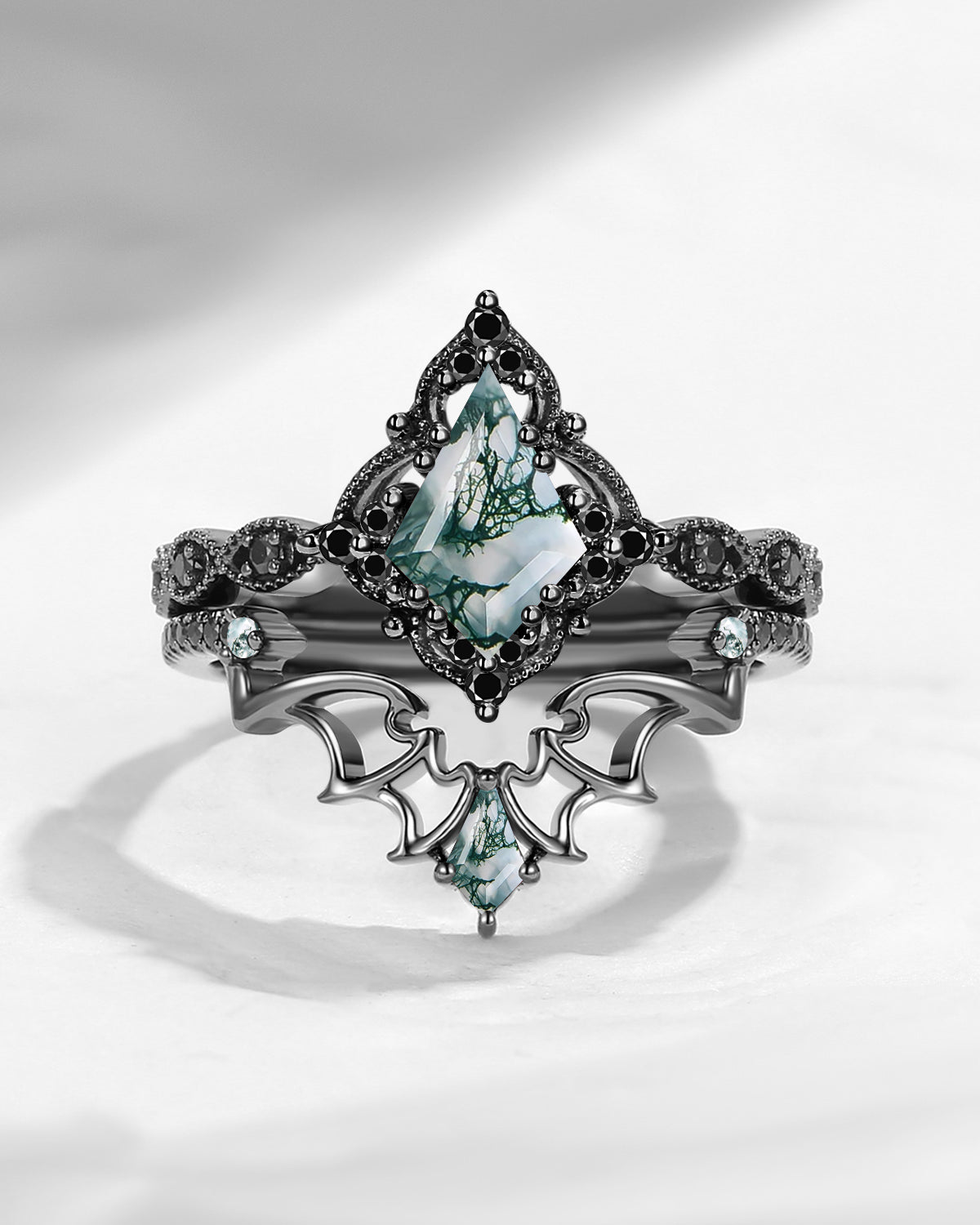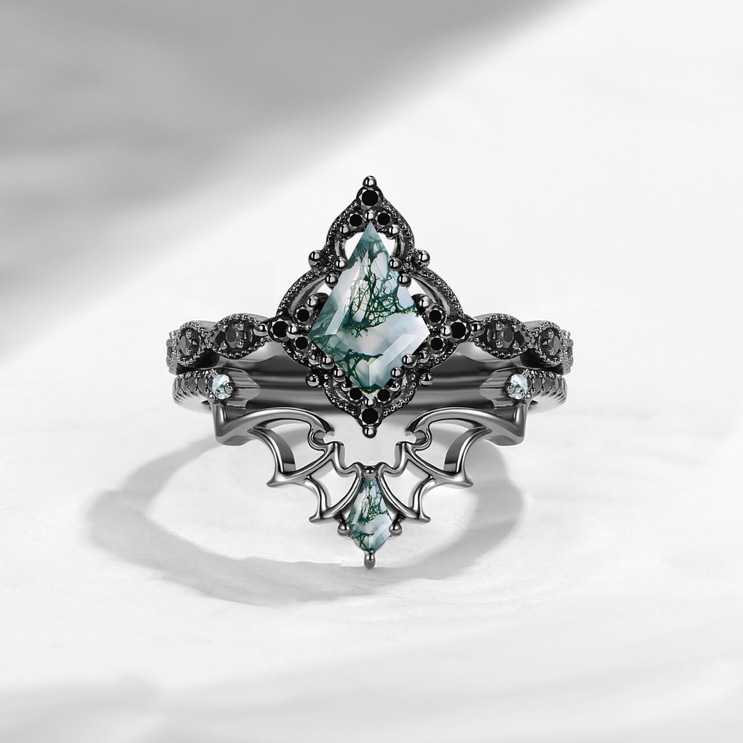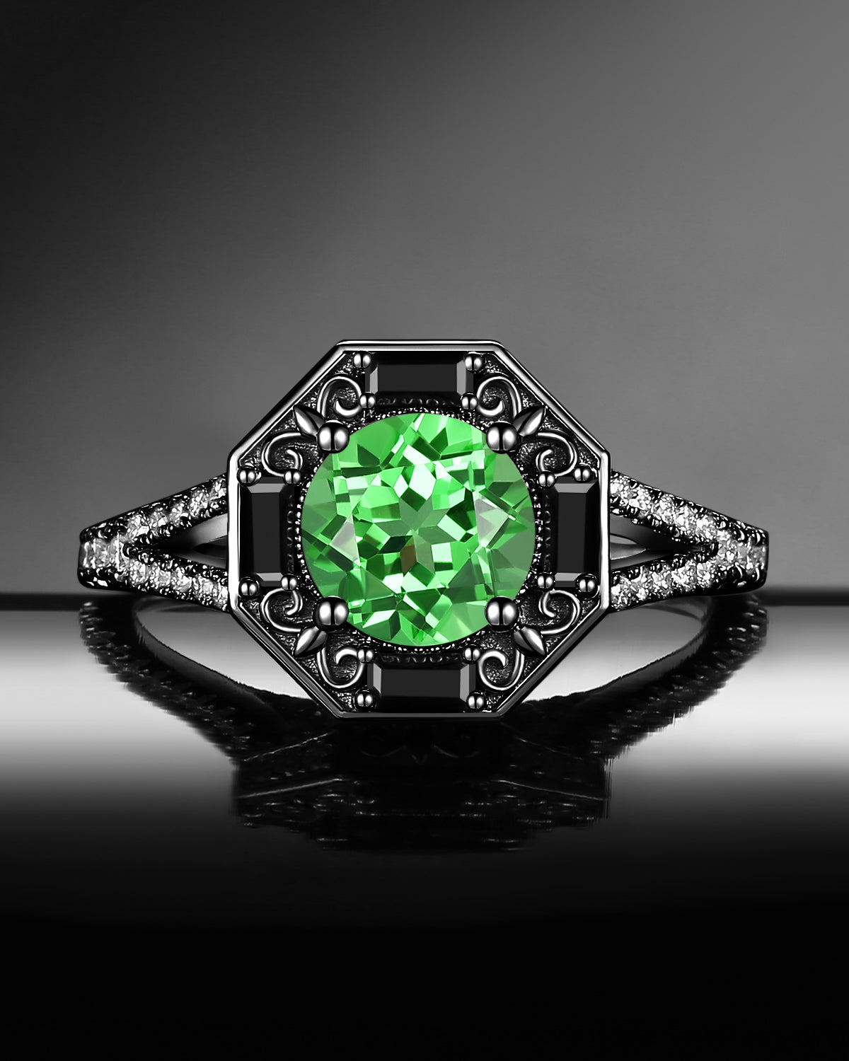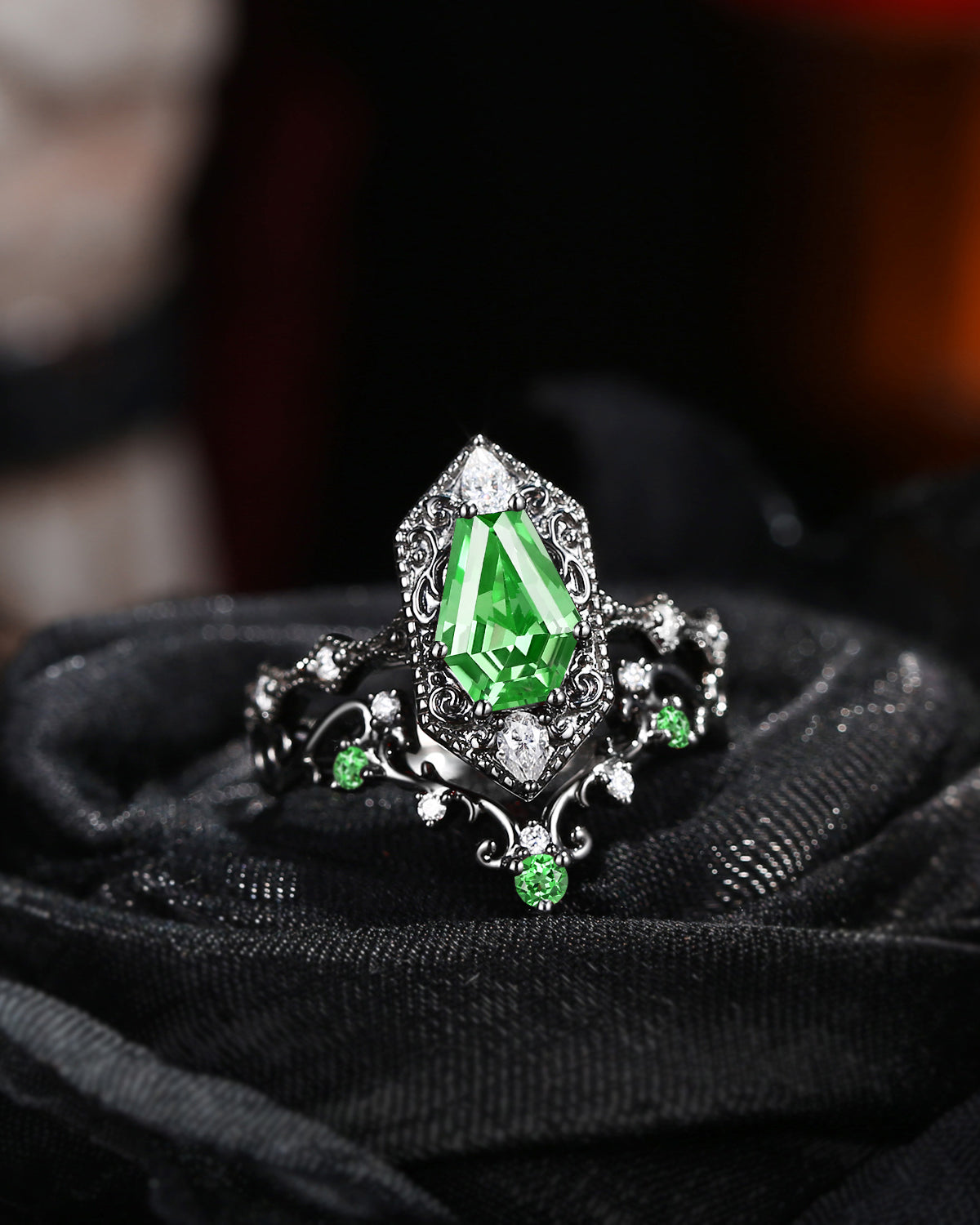 Lab Tsavorite Coffin Cut Vintage Inspired Black Gold Engagement Ring - Bat Ring