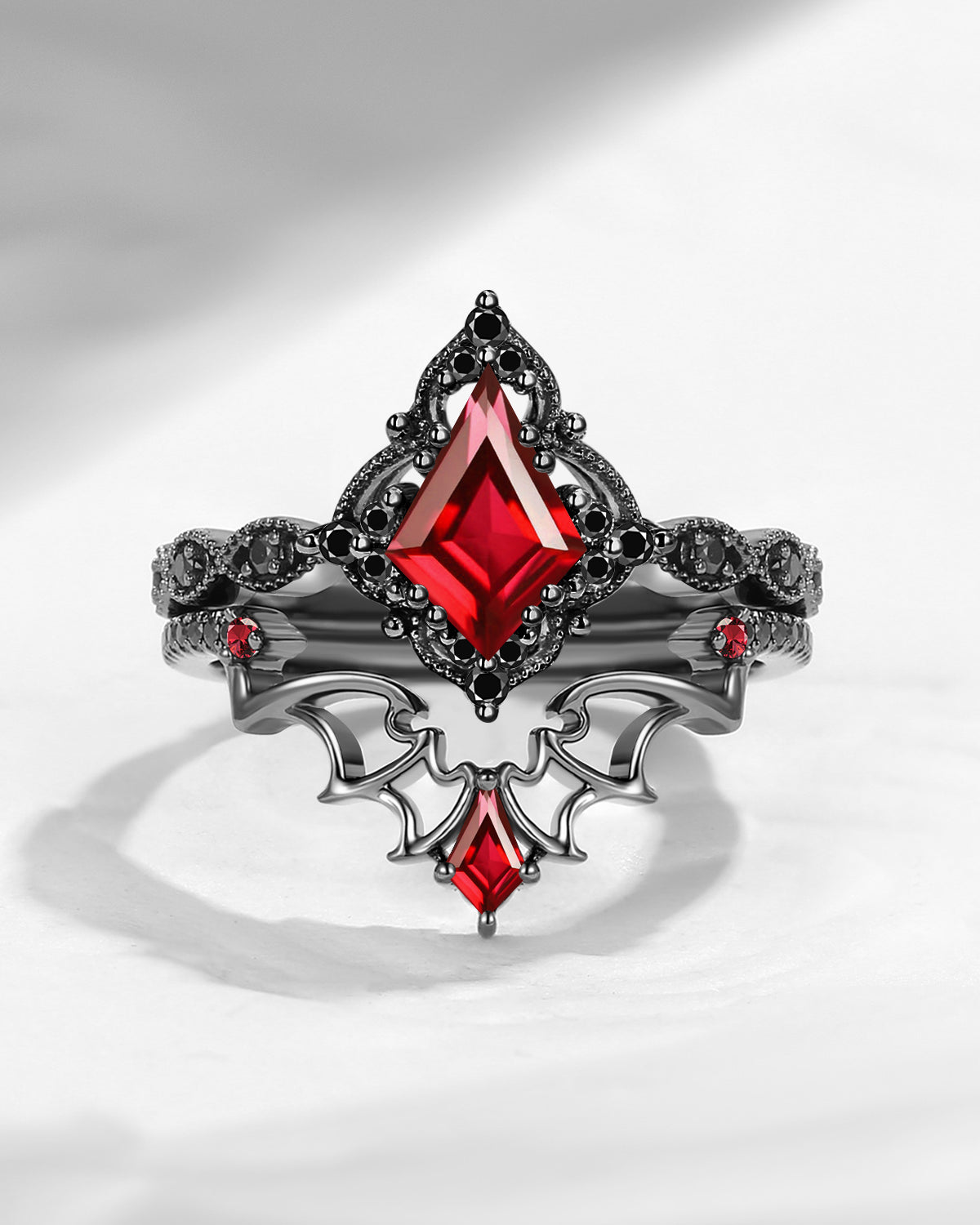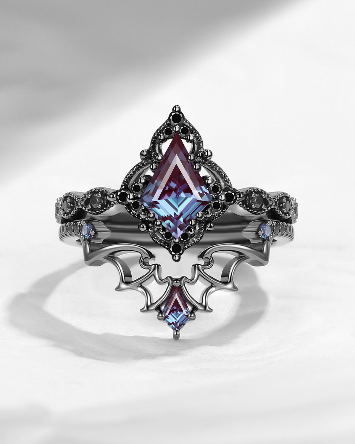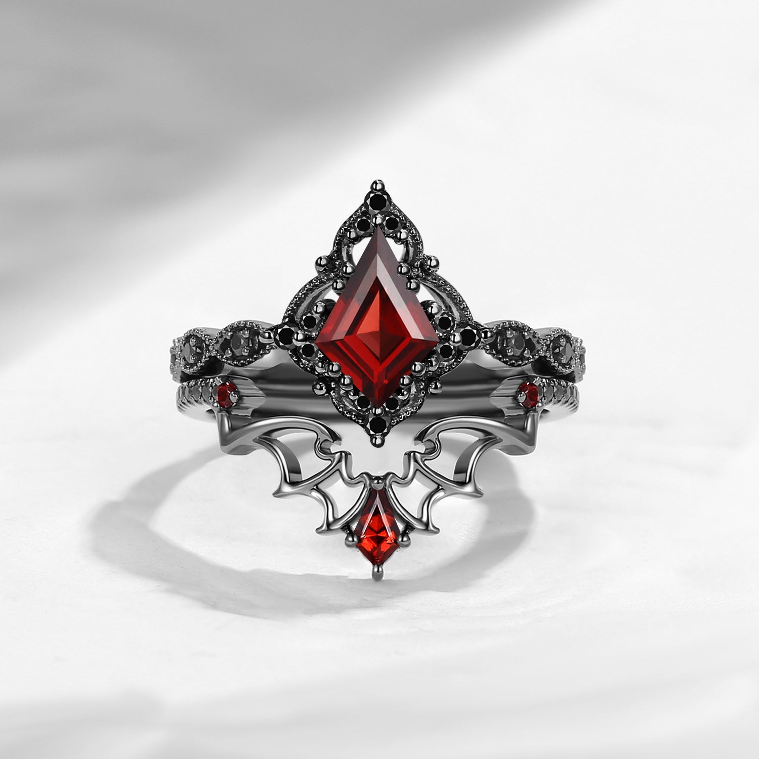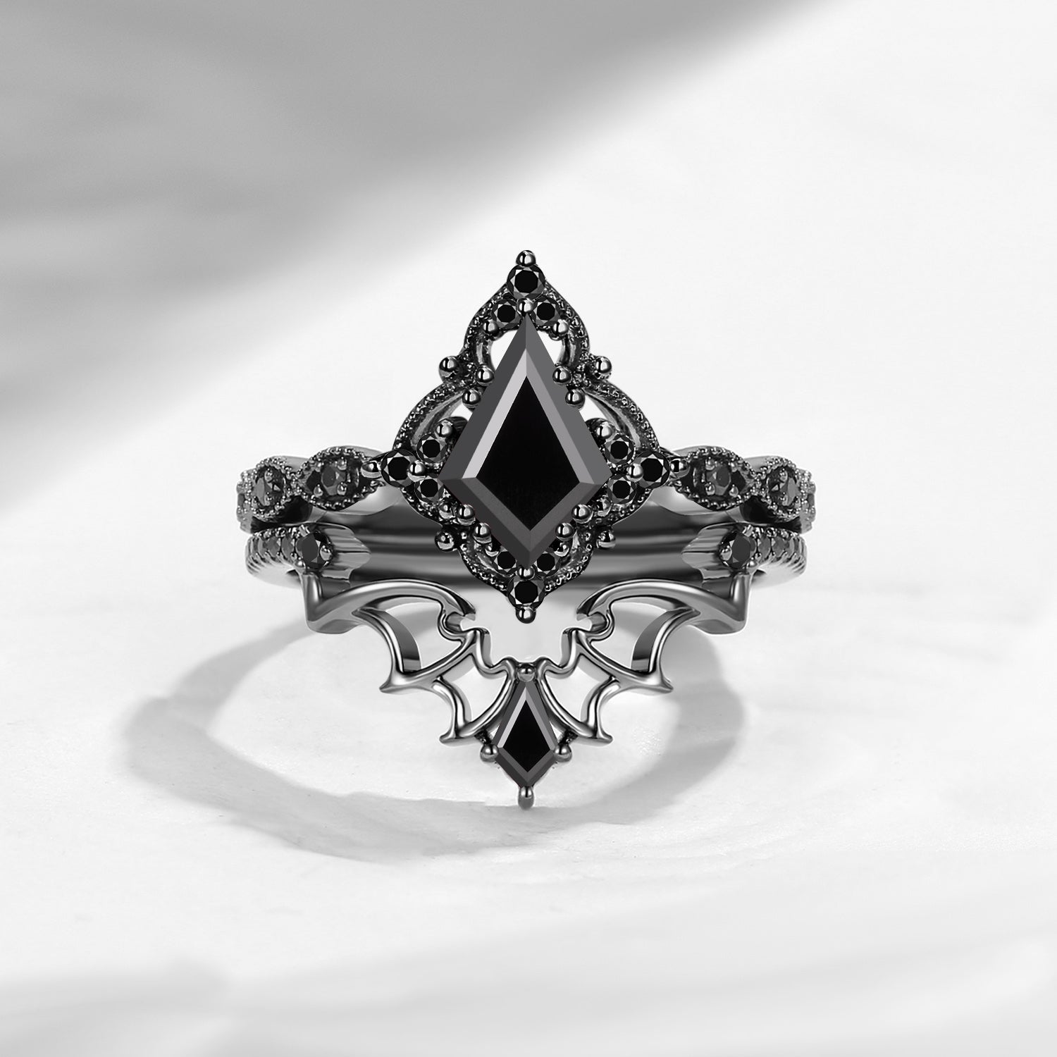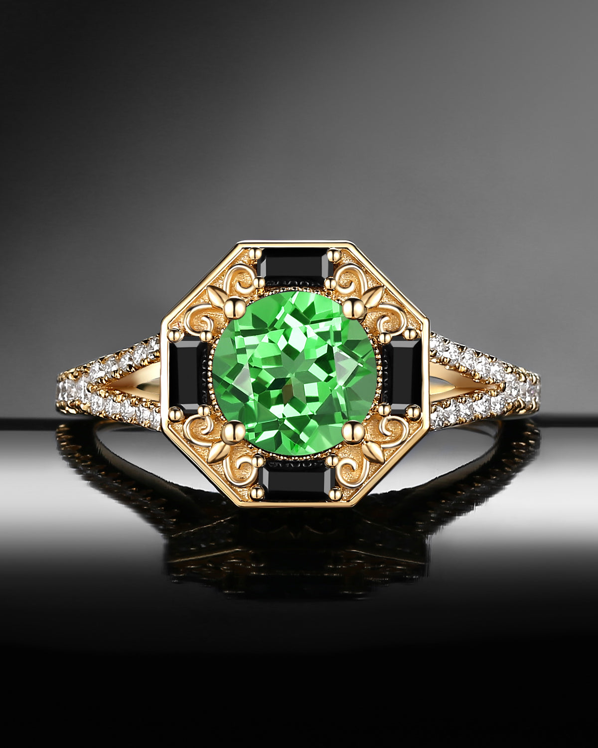 Lab Tsavorite Coffin Cut Vintage Inspired Black Gold Engagement Ring - Bat Ring