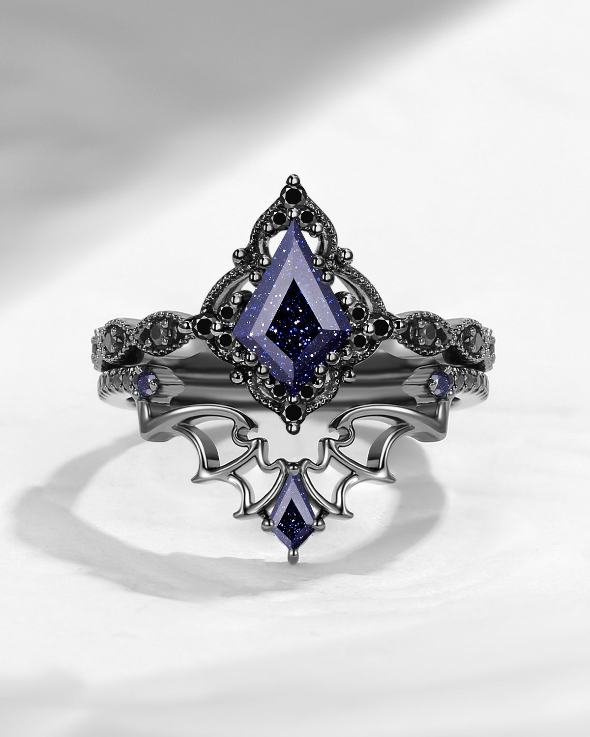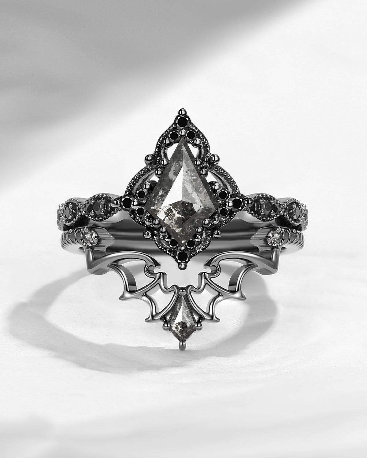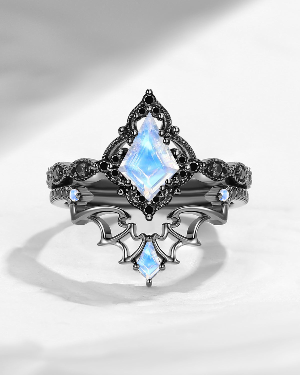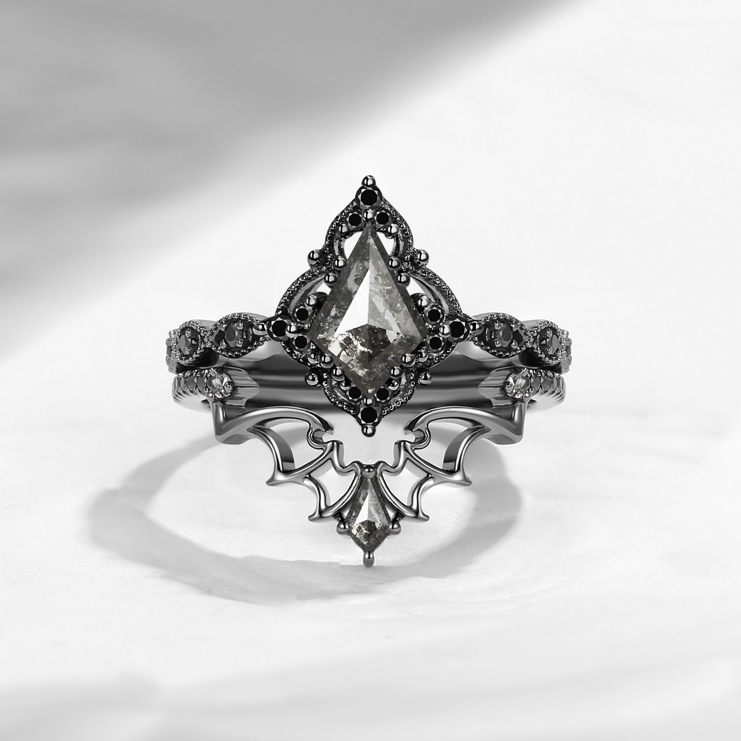 Lab Tsavorite Coffin Cut Vintage Inspired Black Gold Engagement Ring - Bat Ring