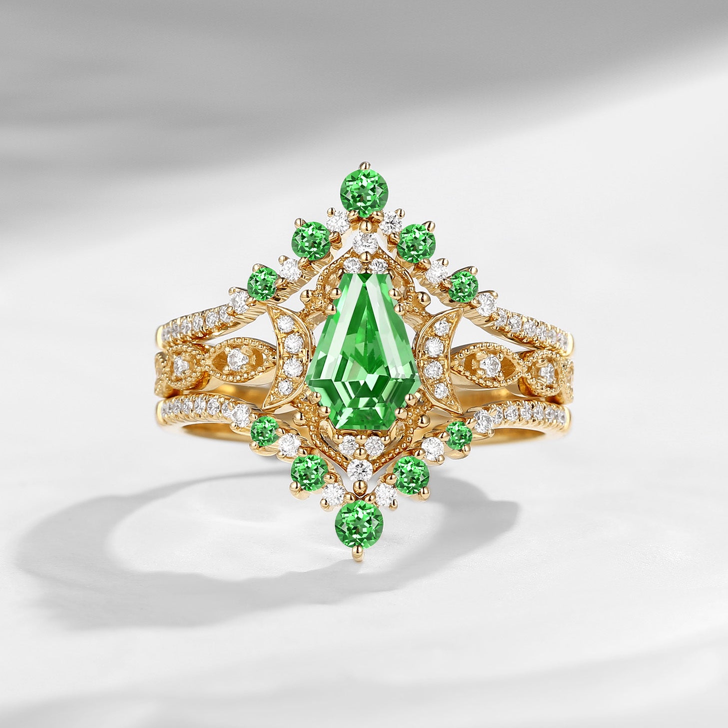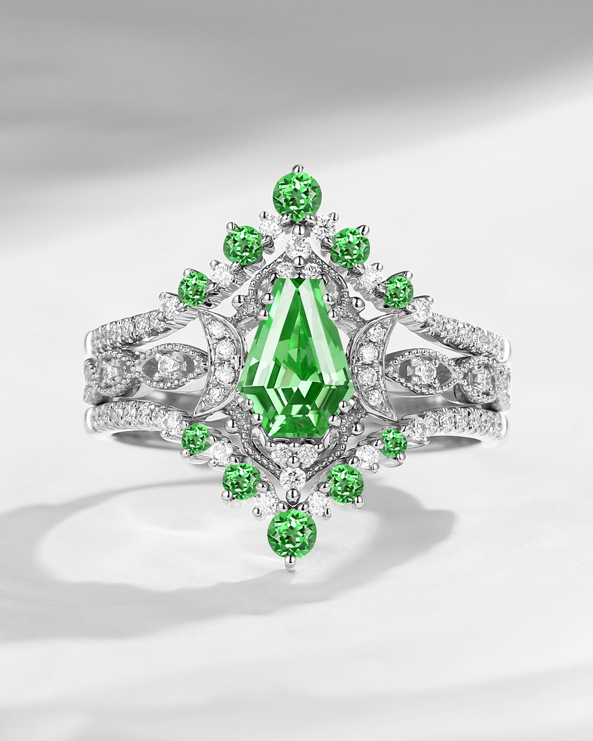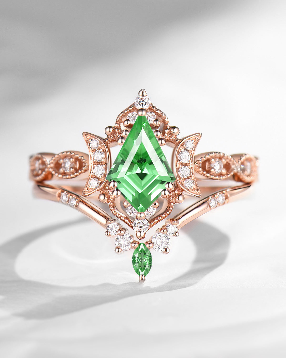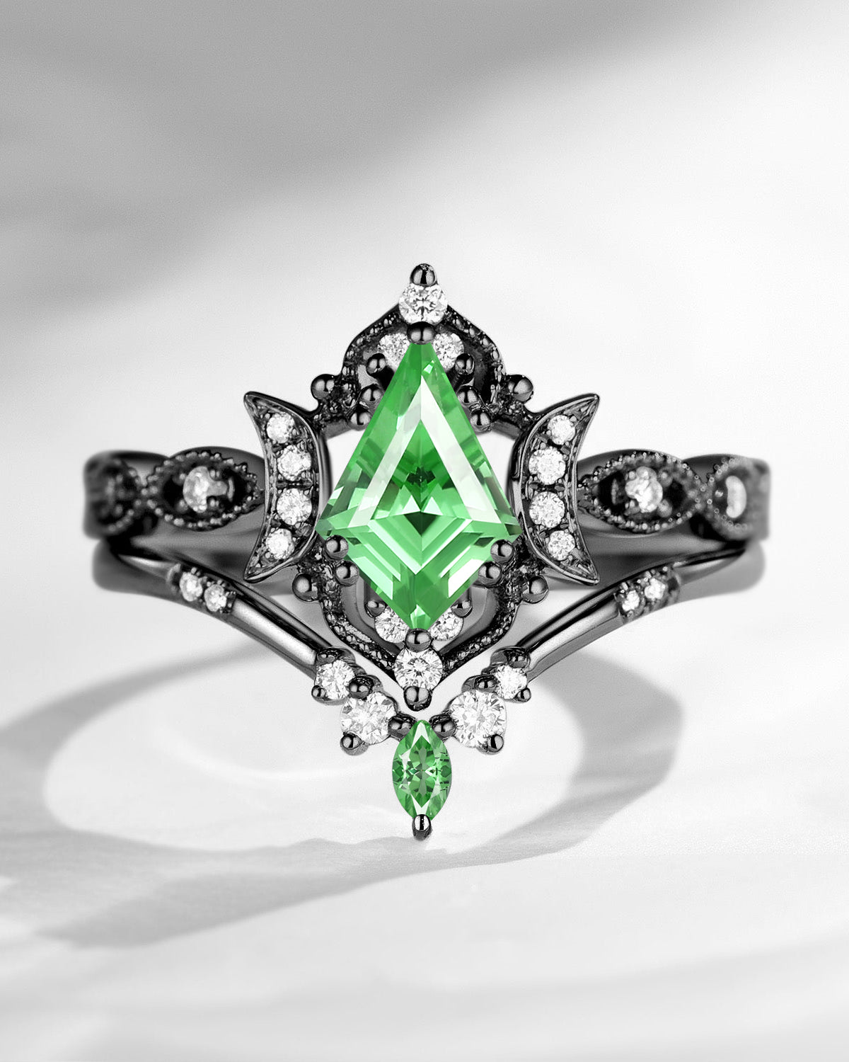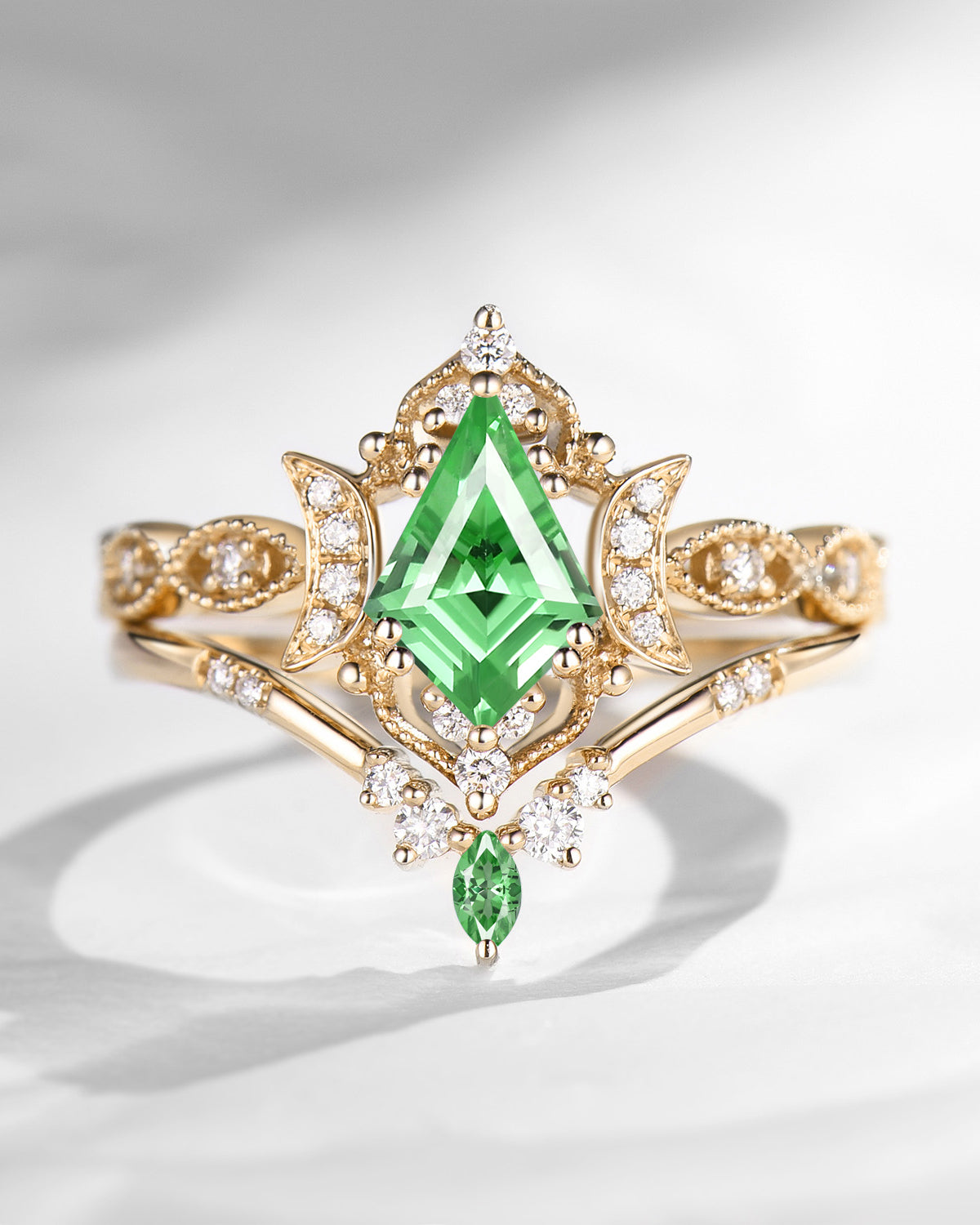Crescent Moon | Unique Kite Cut Lab Tsavorite Engagement Ring Set 2pcs - Luna