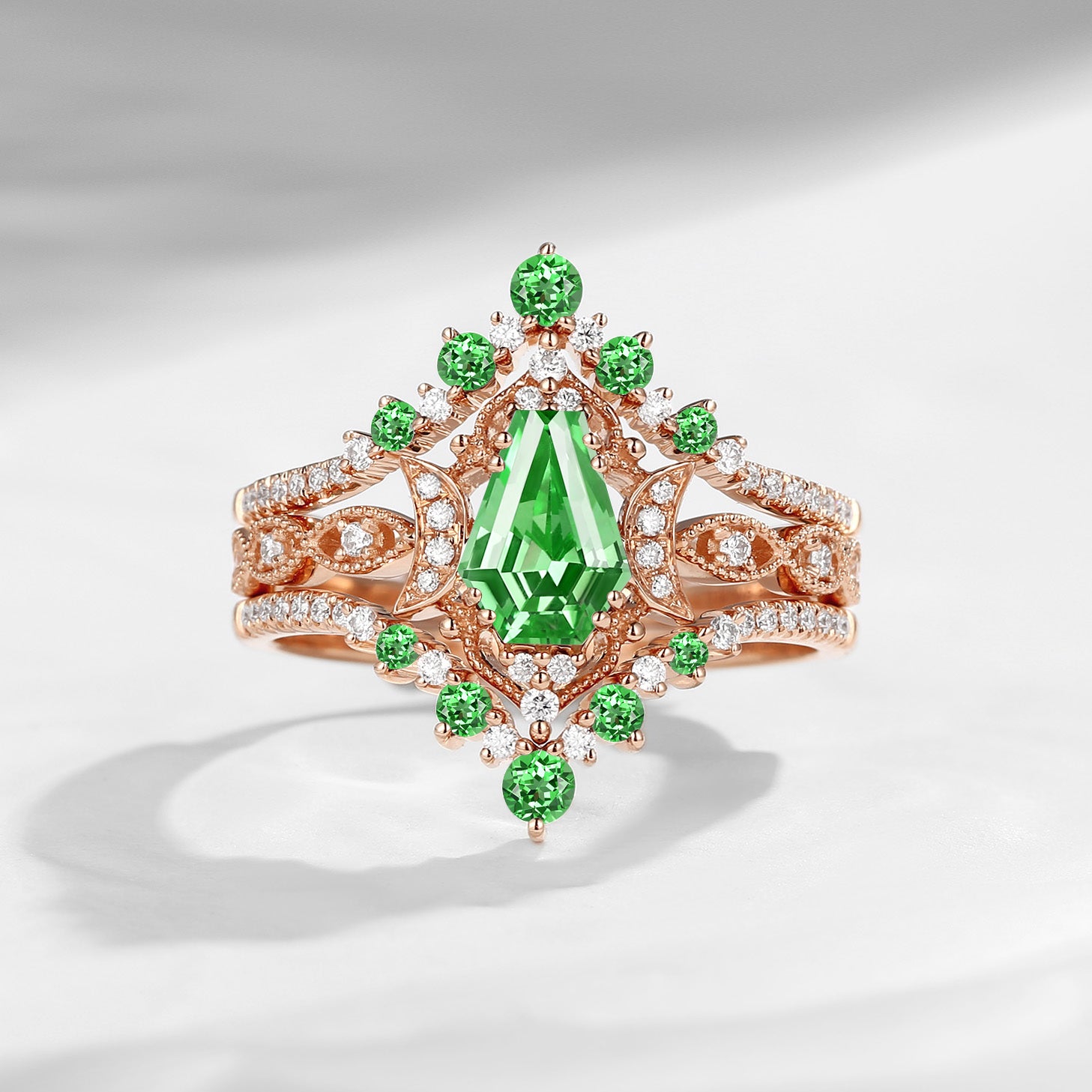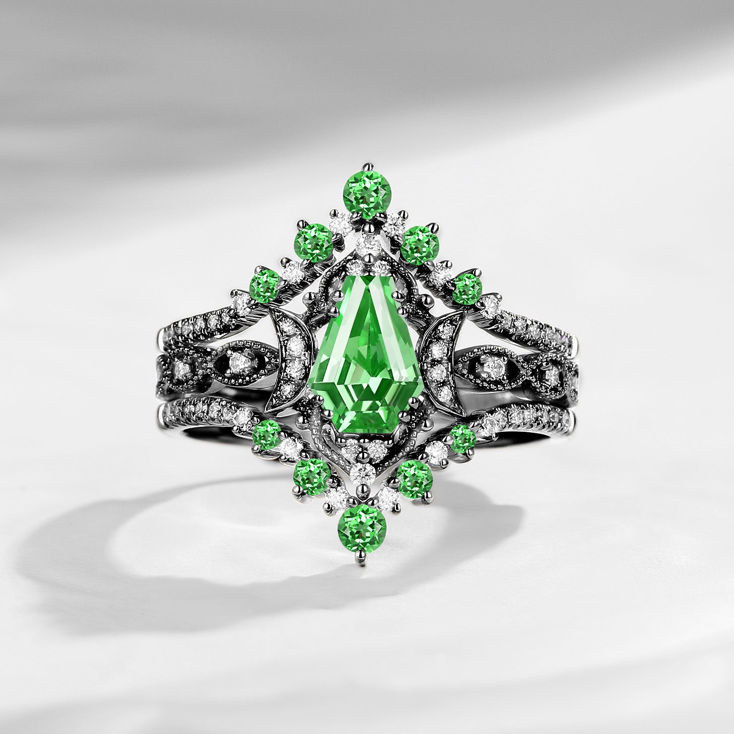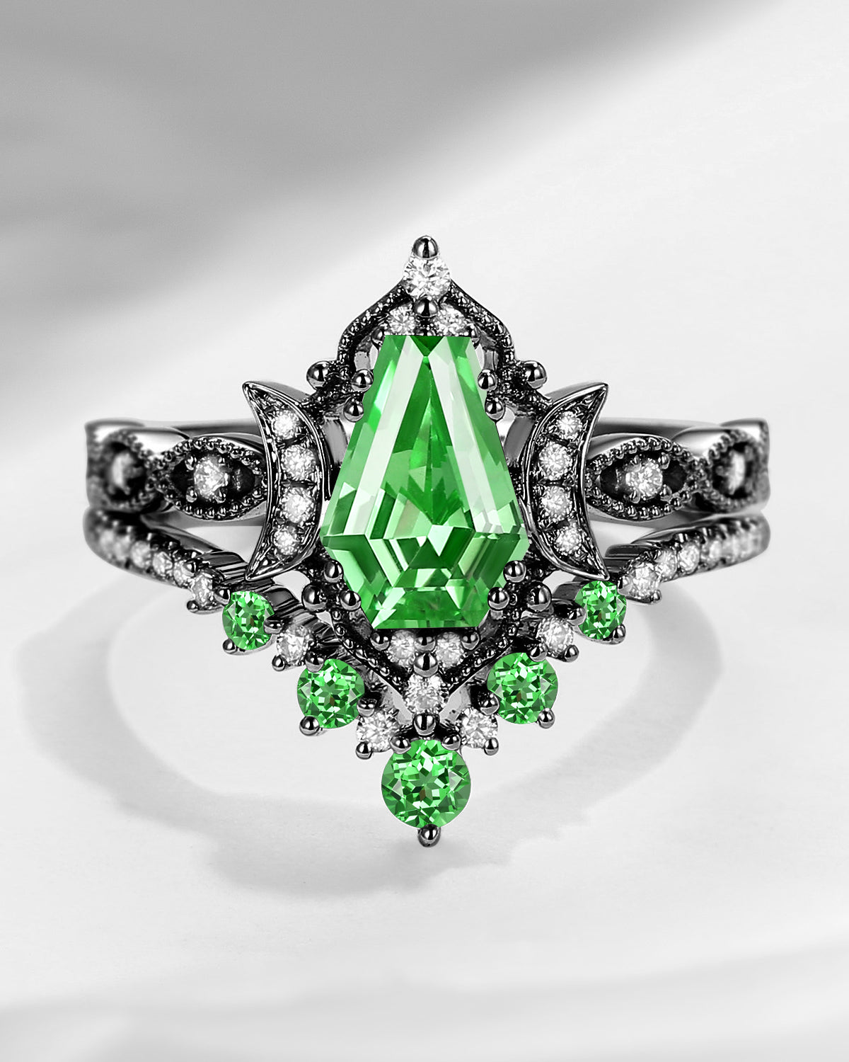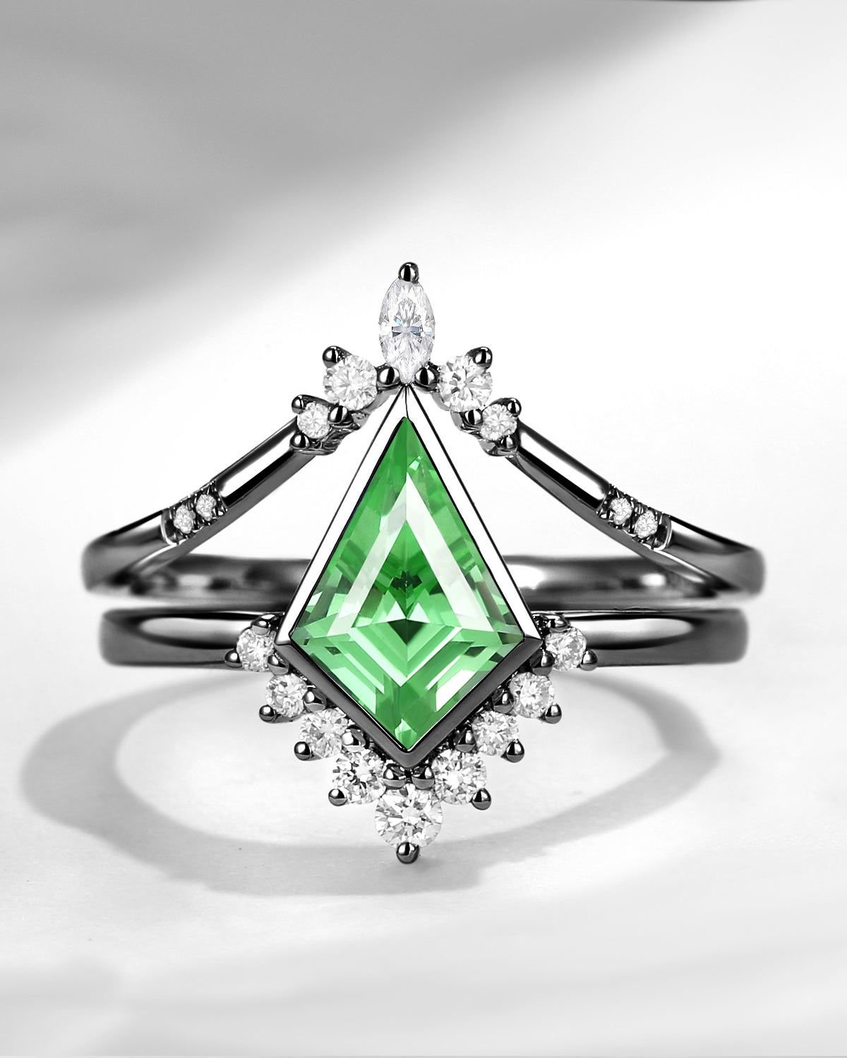 Crescent Moon | Unique Kite Cut Lab Tsavorite Engagement Ring Set 2pcs - Luna