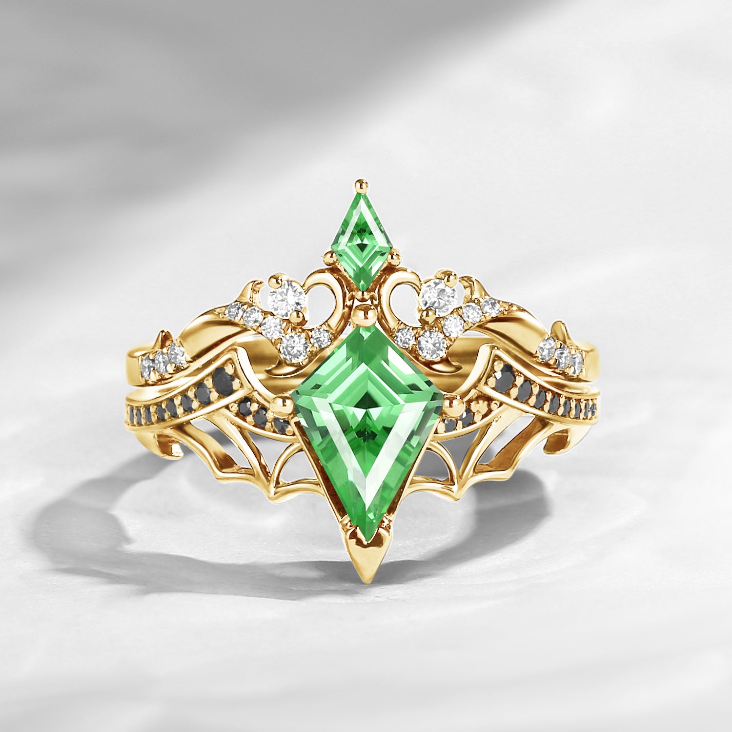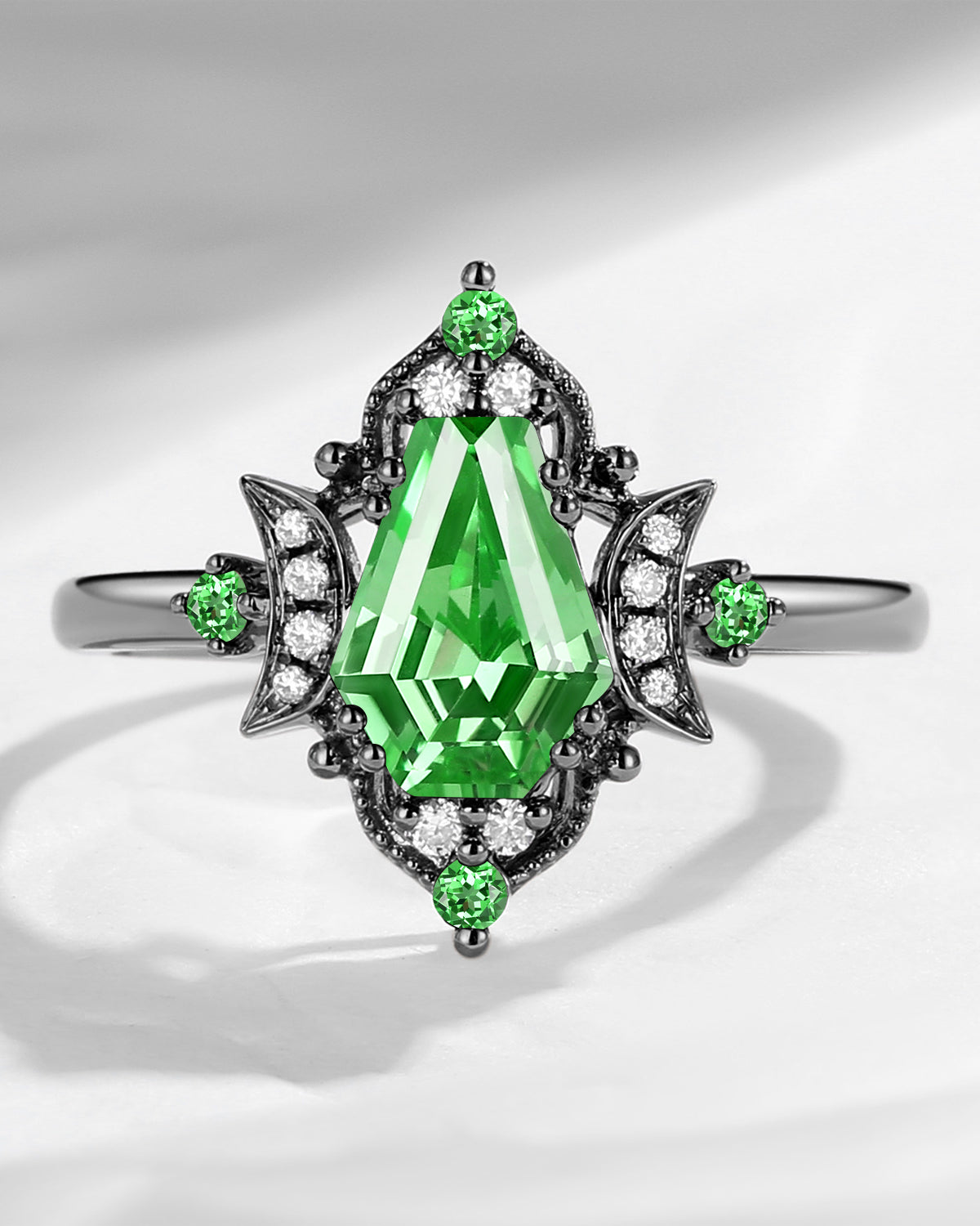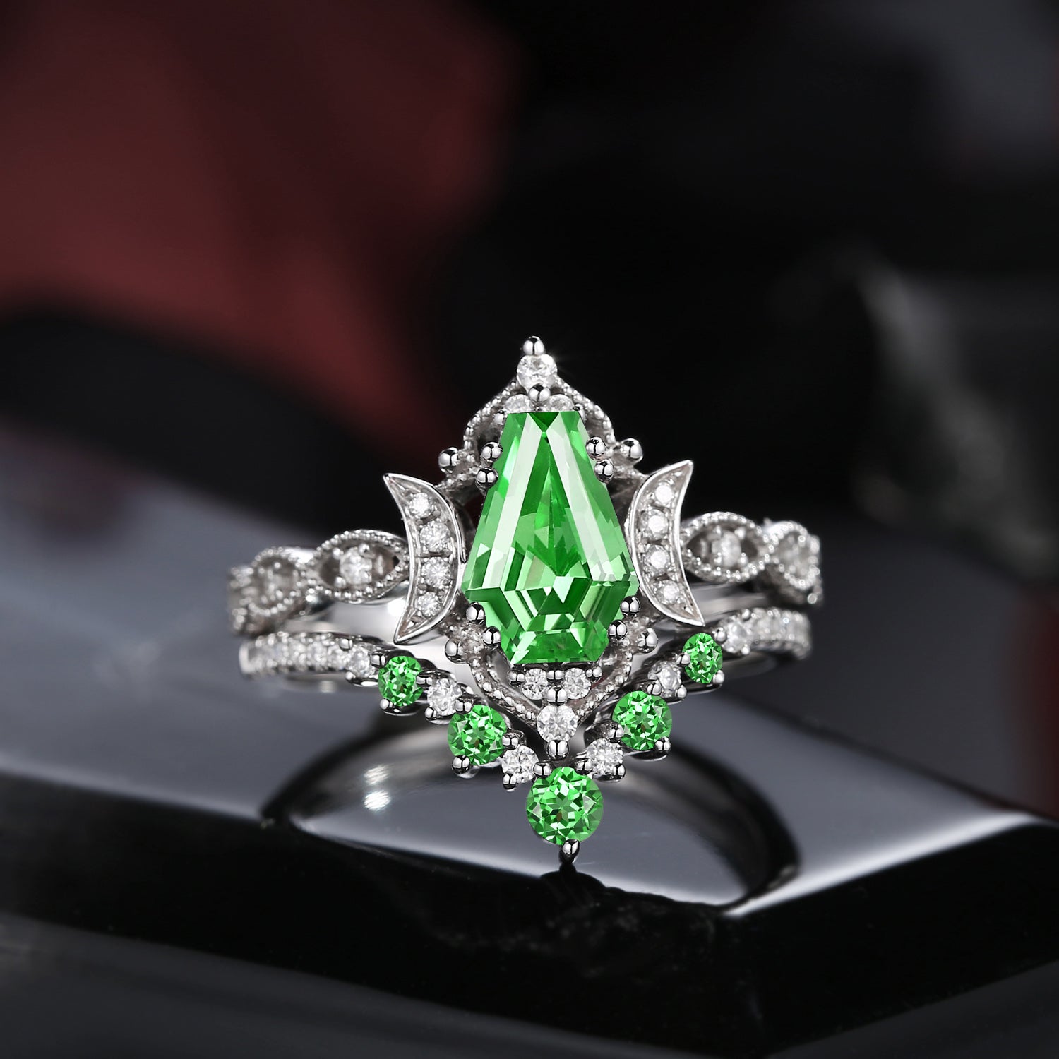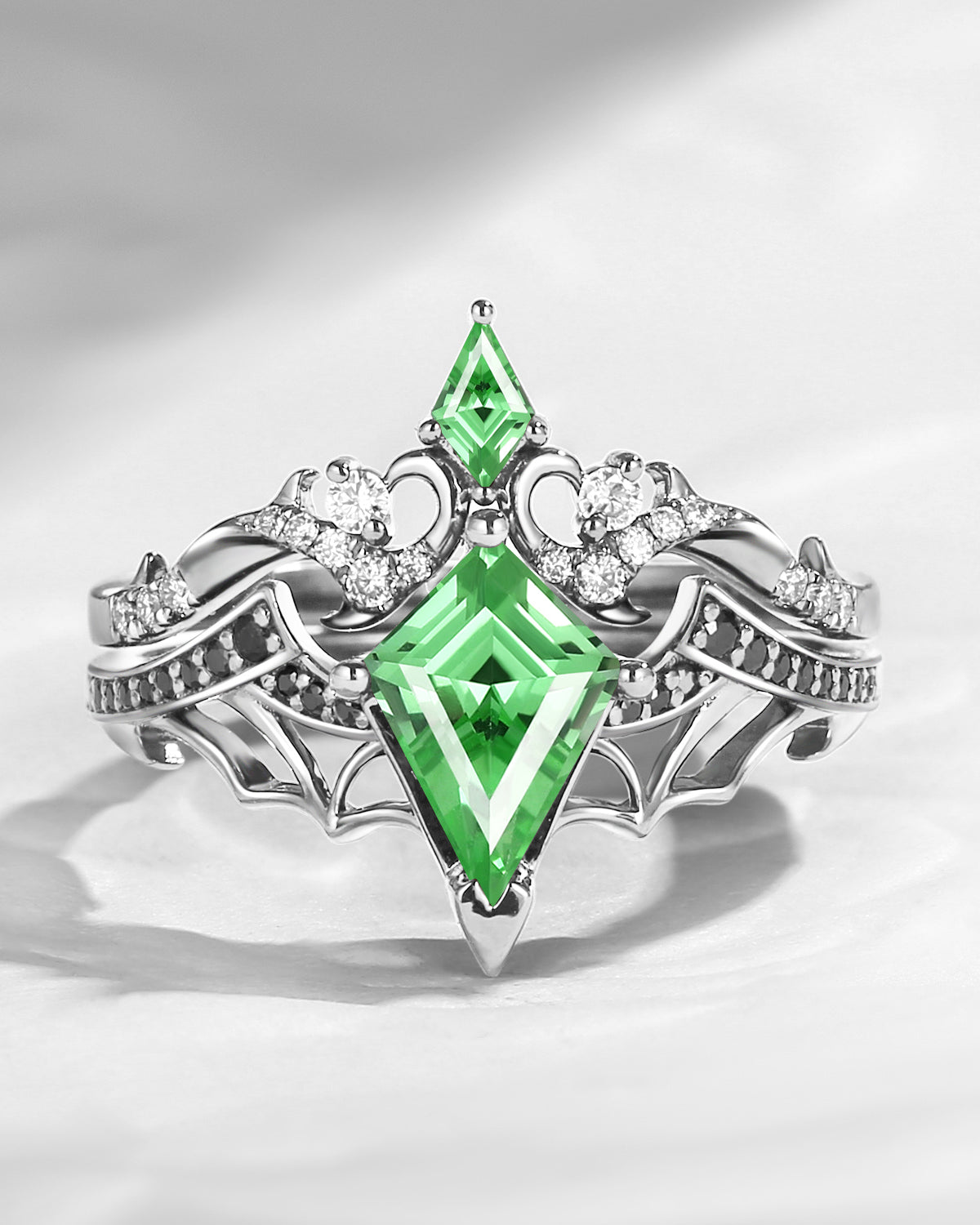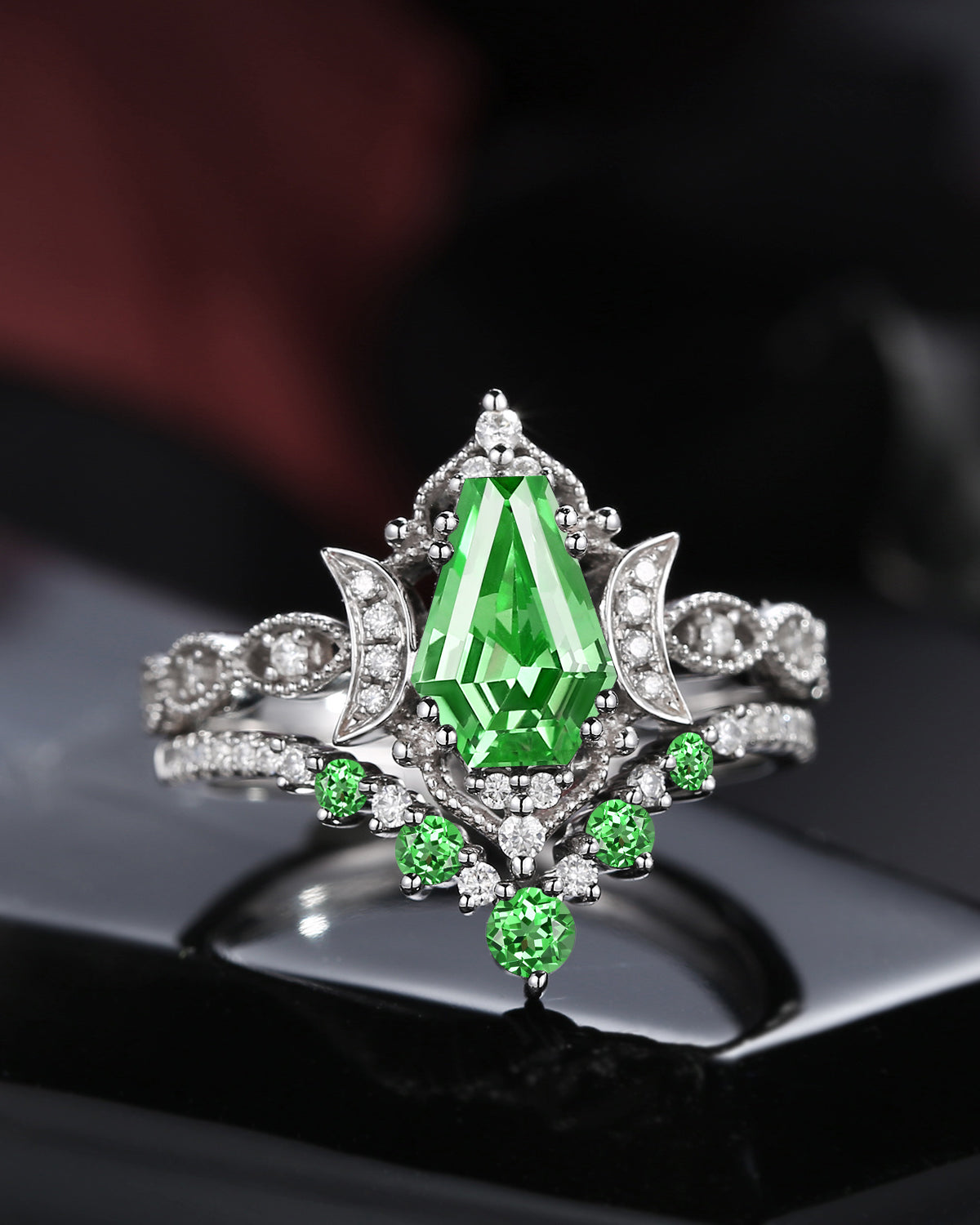 Crescent Moon | Unique Kite Cut Lab Tsavorite Engagement Ring Set 2pcs - Luna