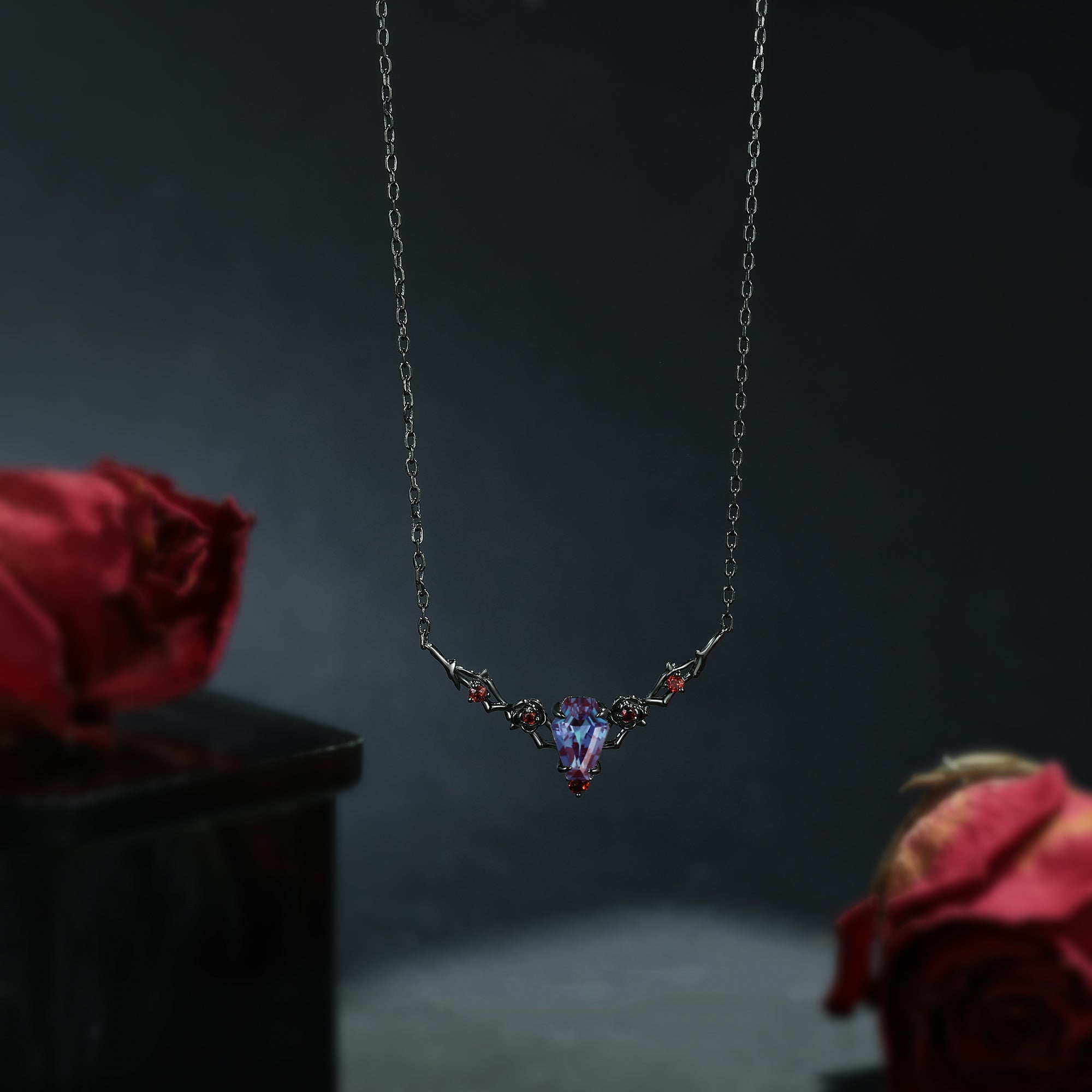 Gothic Long Hexagon Garnet 'Thorns & Roses' Cluster Black Gold Engagement Ring