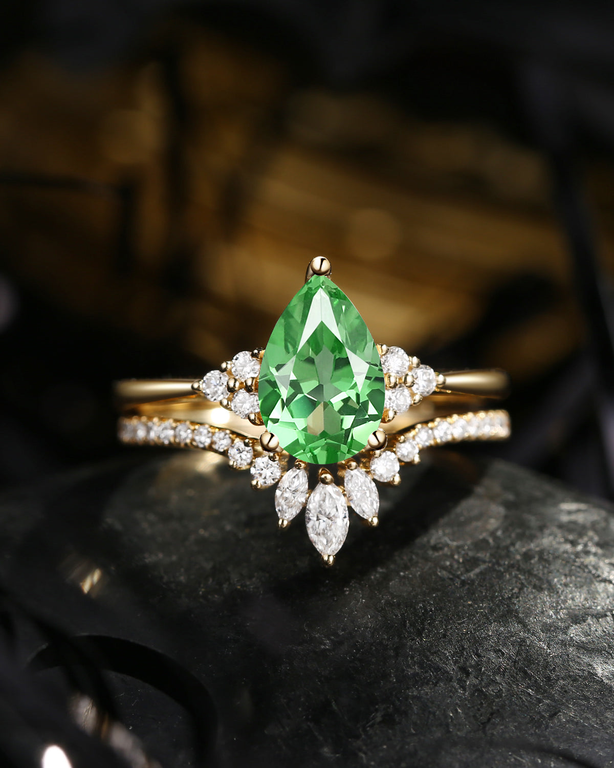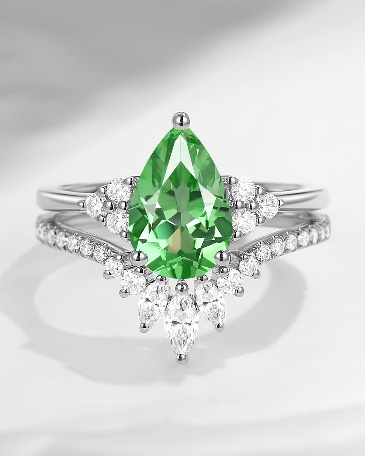 Pear Cut Lab Tsavorite Cluster Engagement Ring Set 2pcs - Vivian