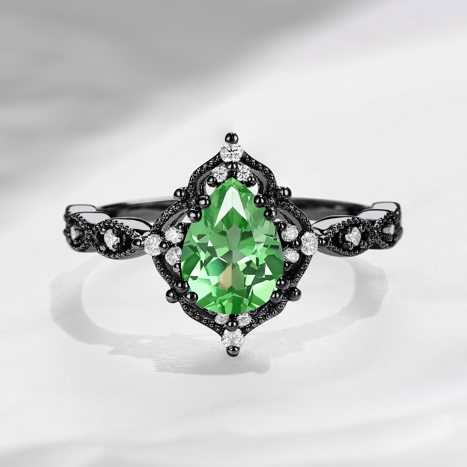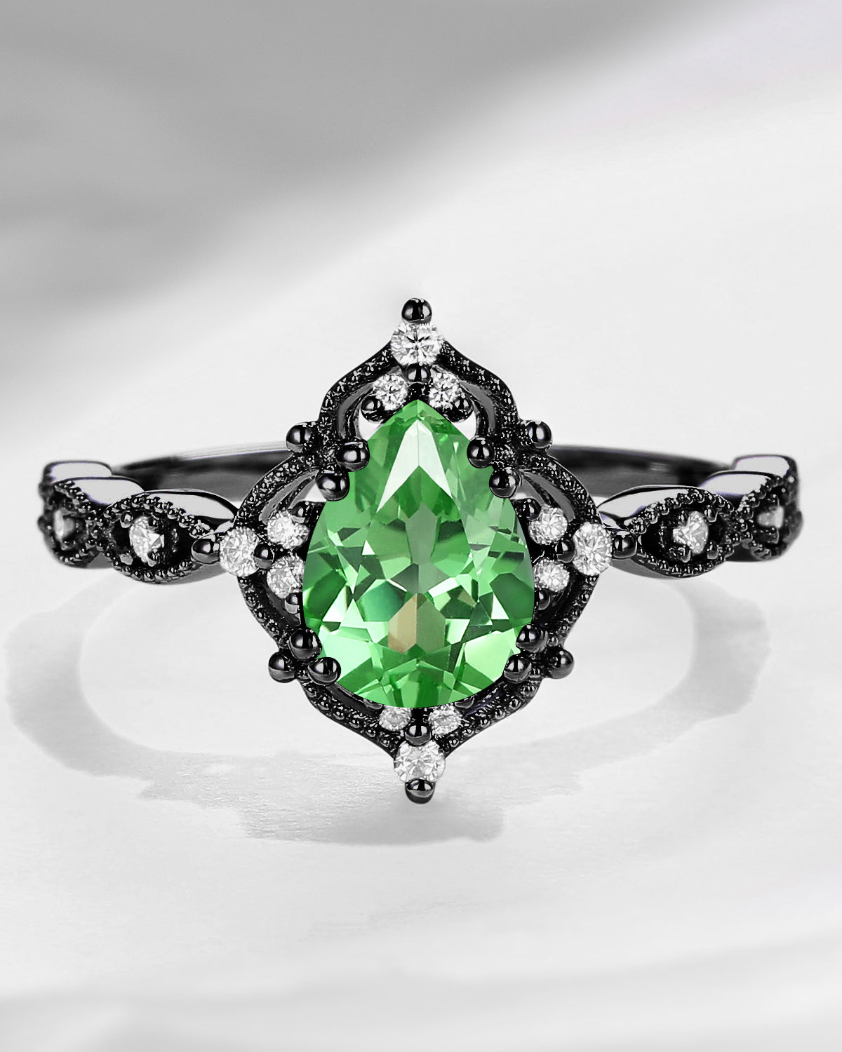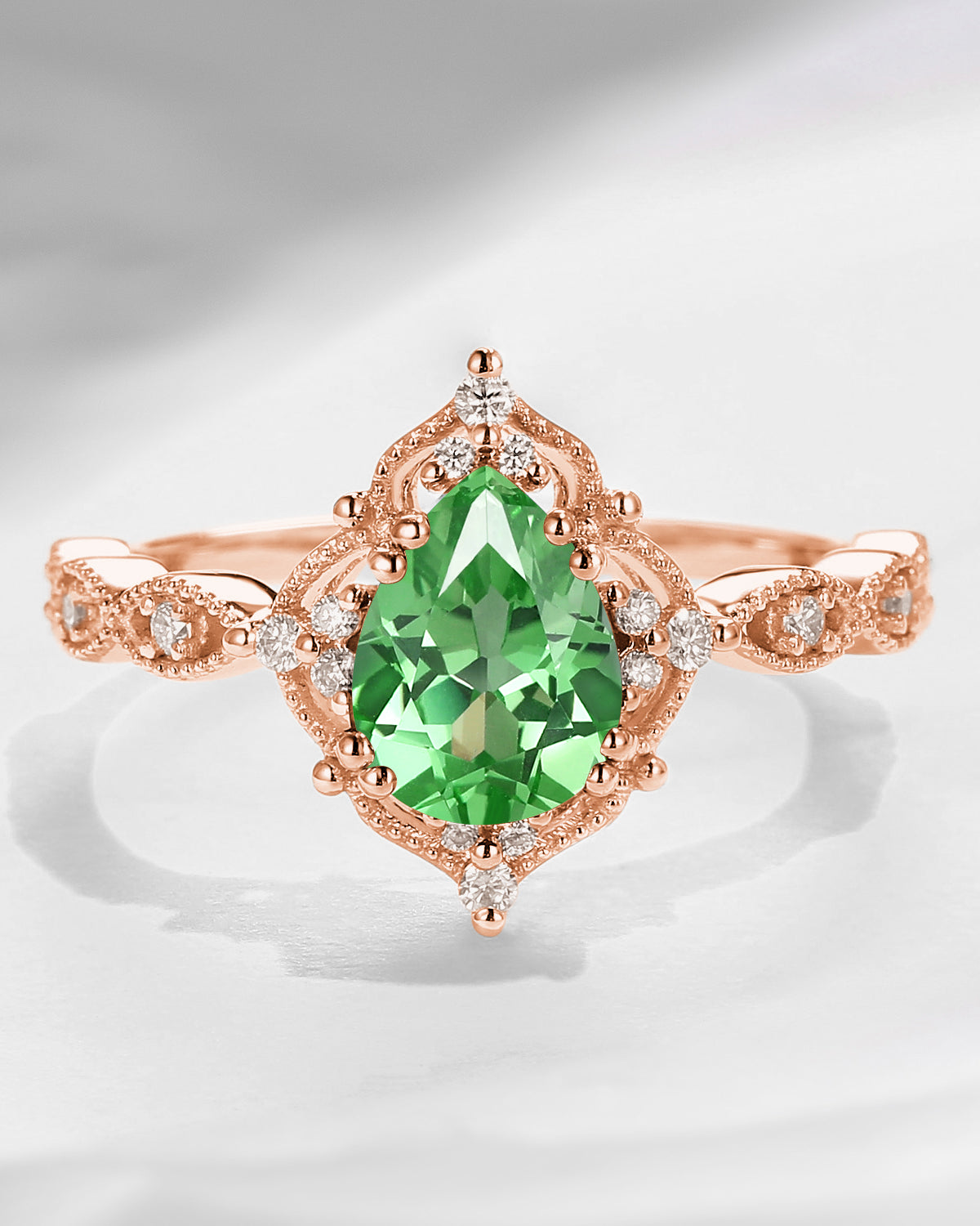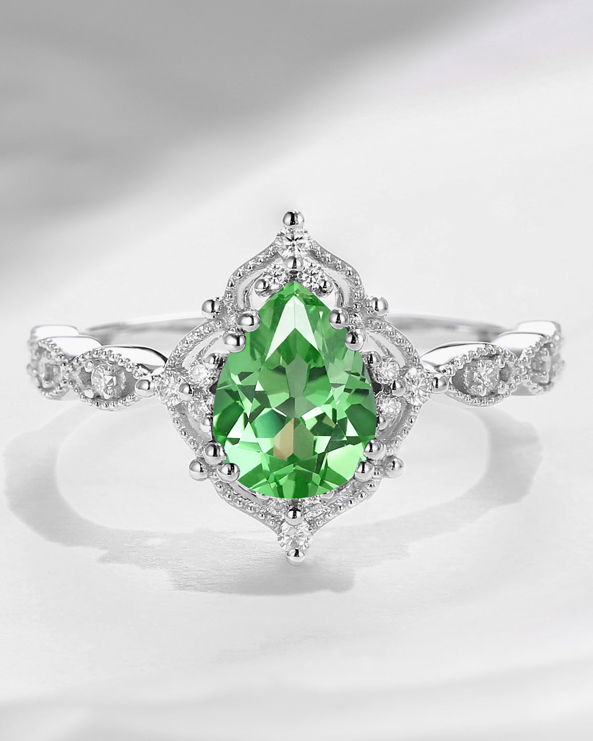 Vintage Pear Cut Lab Tsavorite Classic Milgrain Engagement Ring