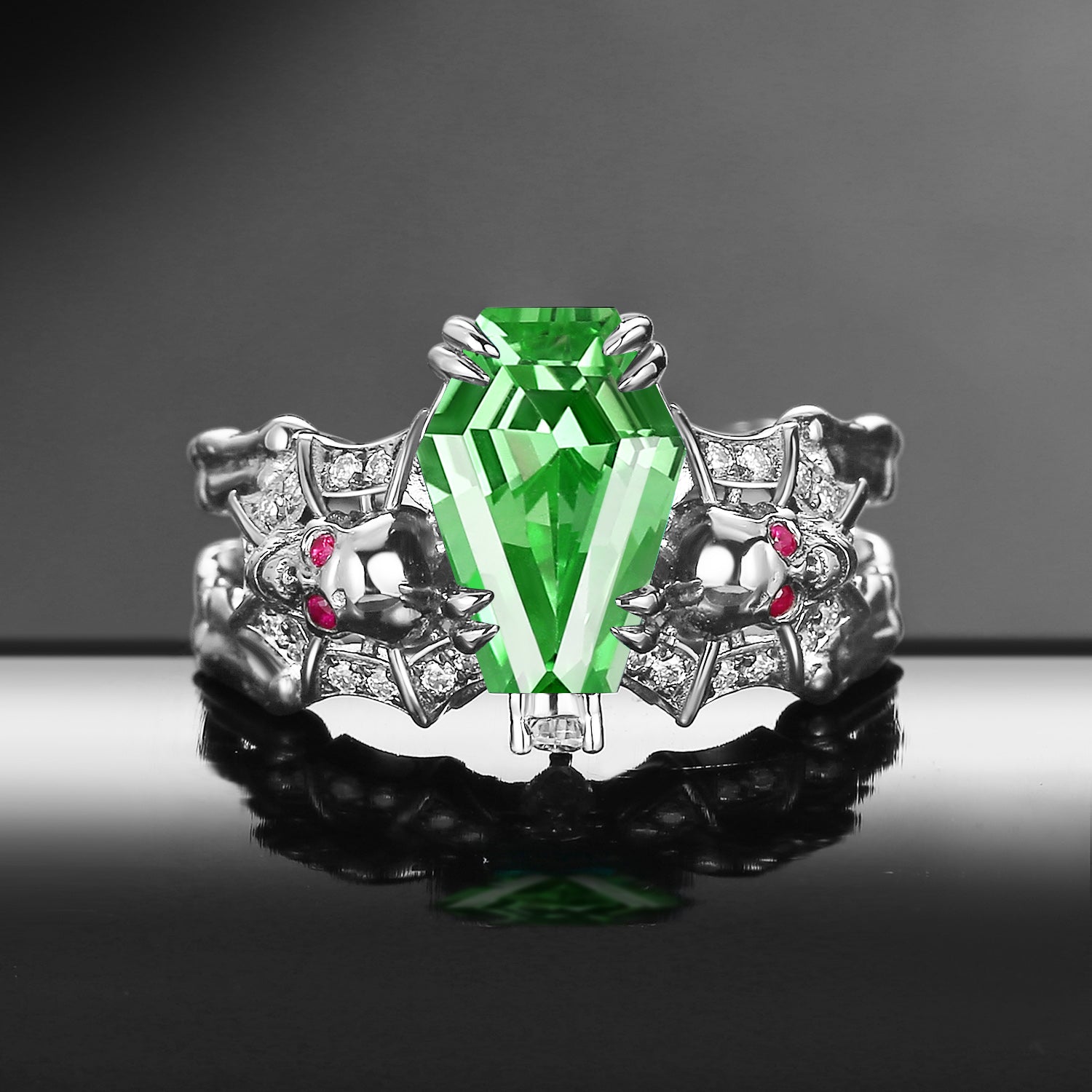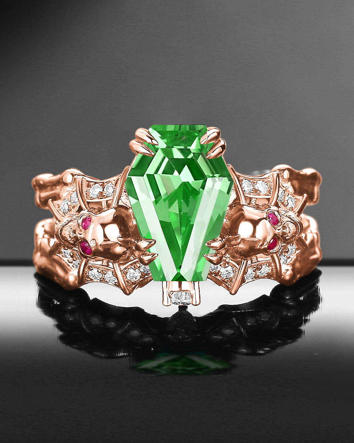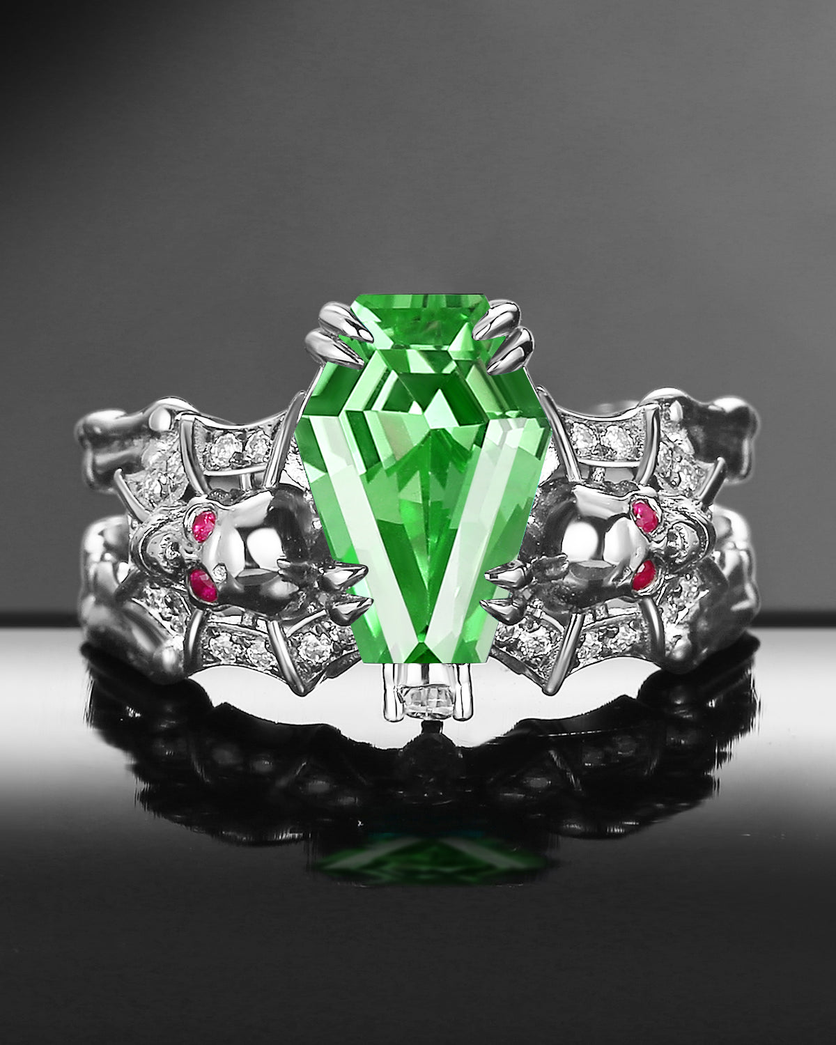 Gothic Inspired Skull & Skeleton Coffin Cut Lab Tsavorite 2-in-1 Engagement Ring