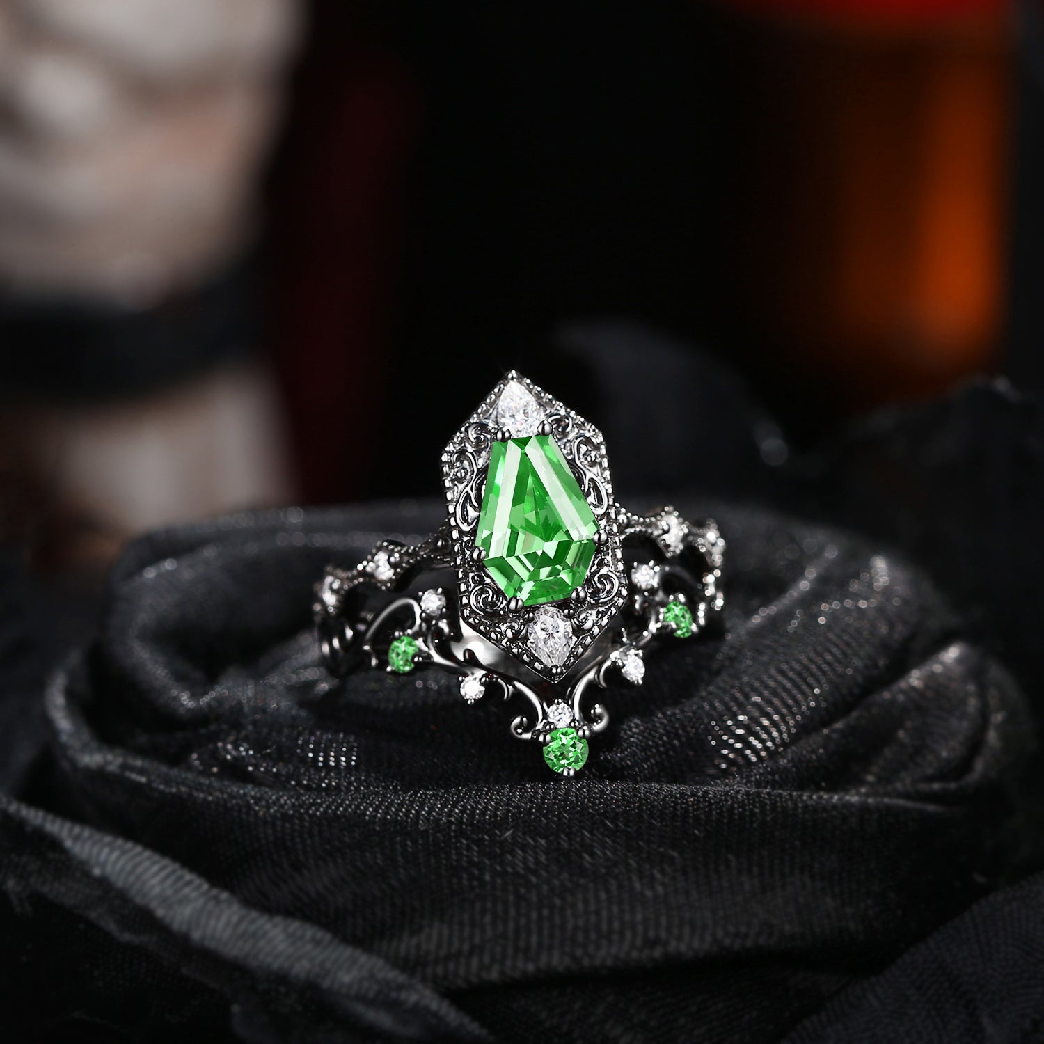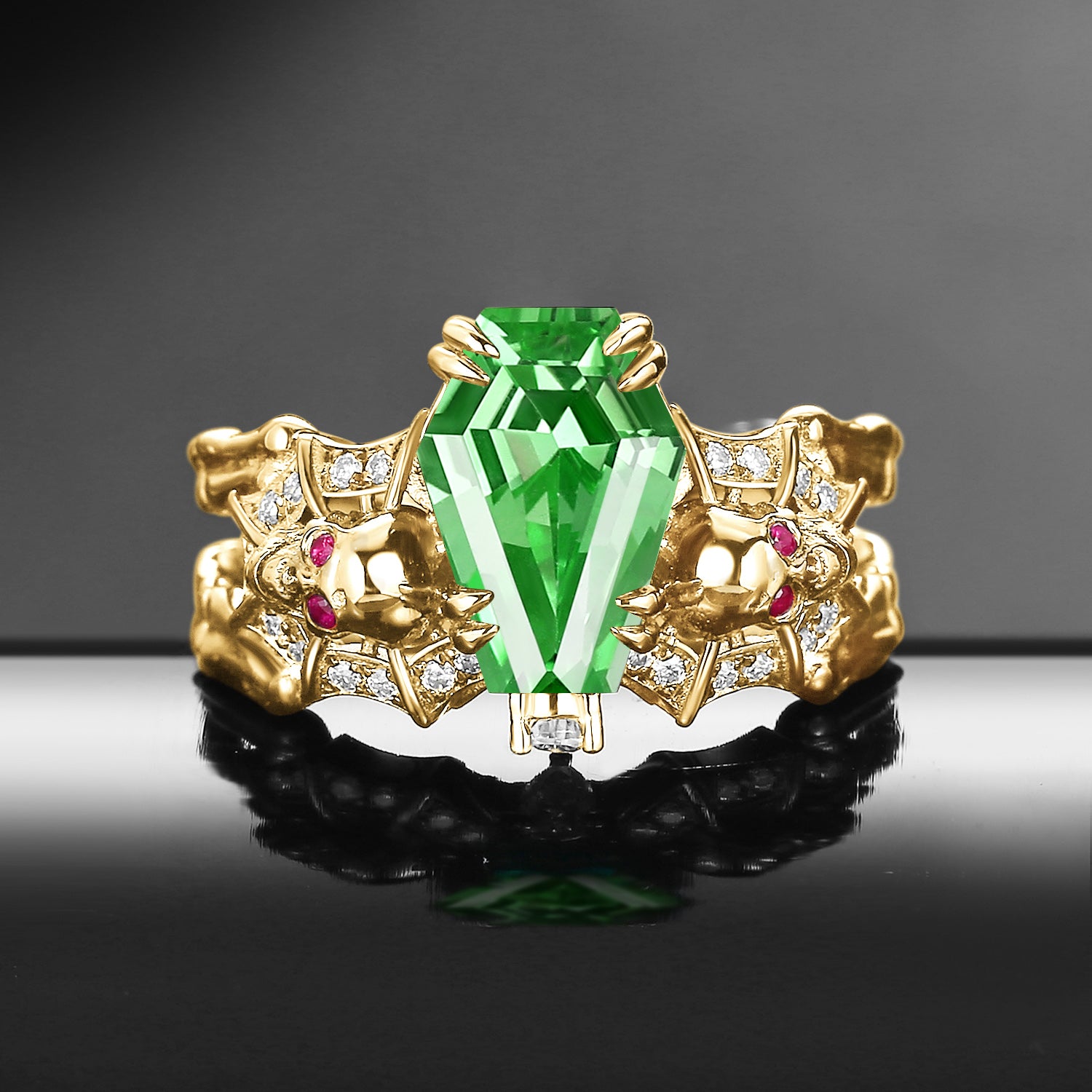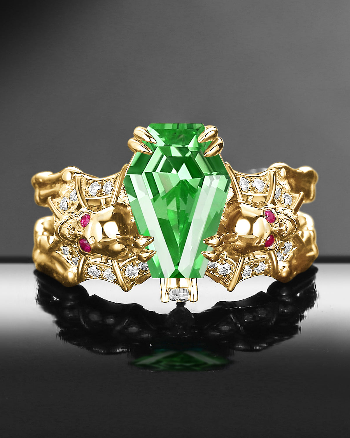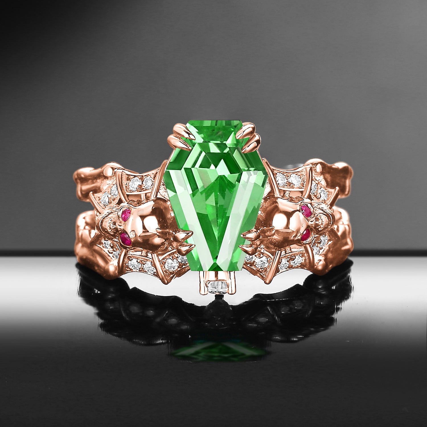Gothic Inspired Skull & Skeleton Coffin Cut Lab Tsavorite 2-in-1 Engagement Ring