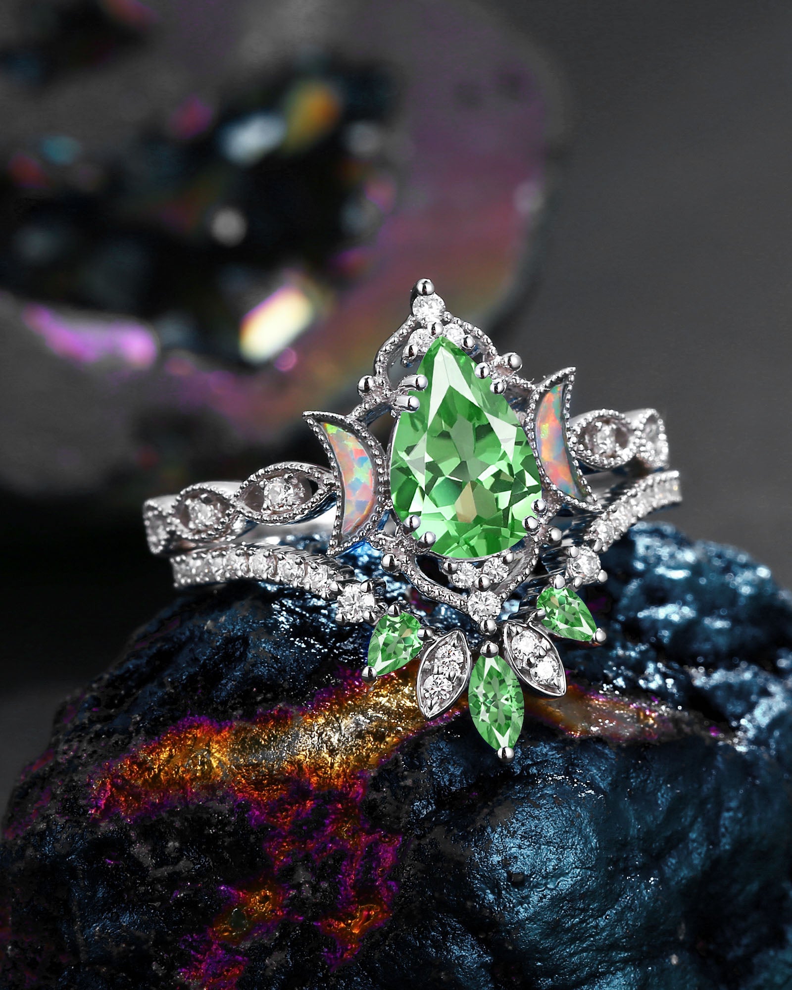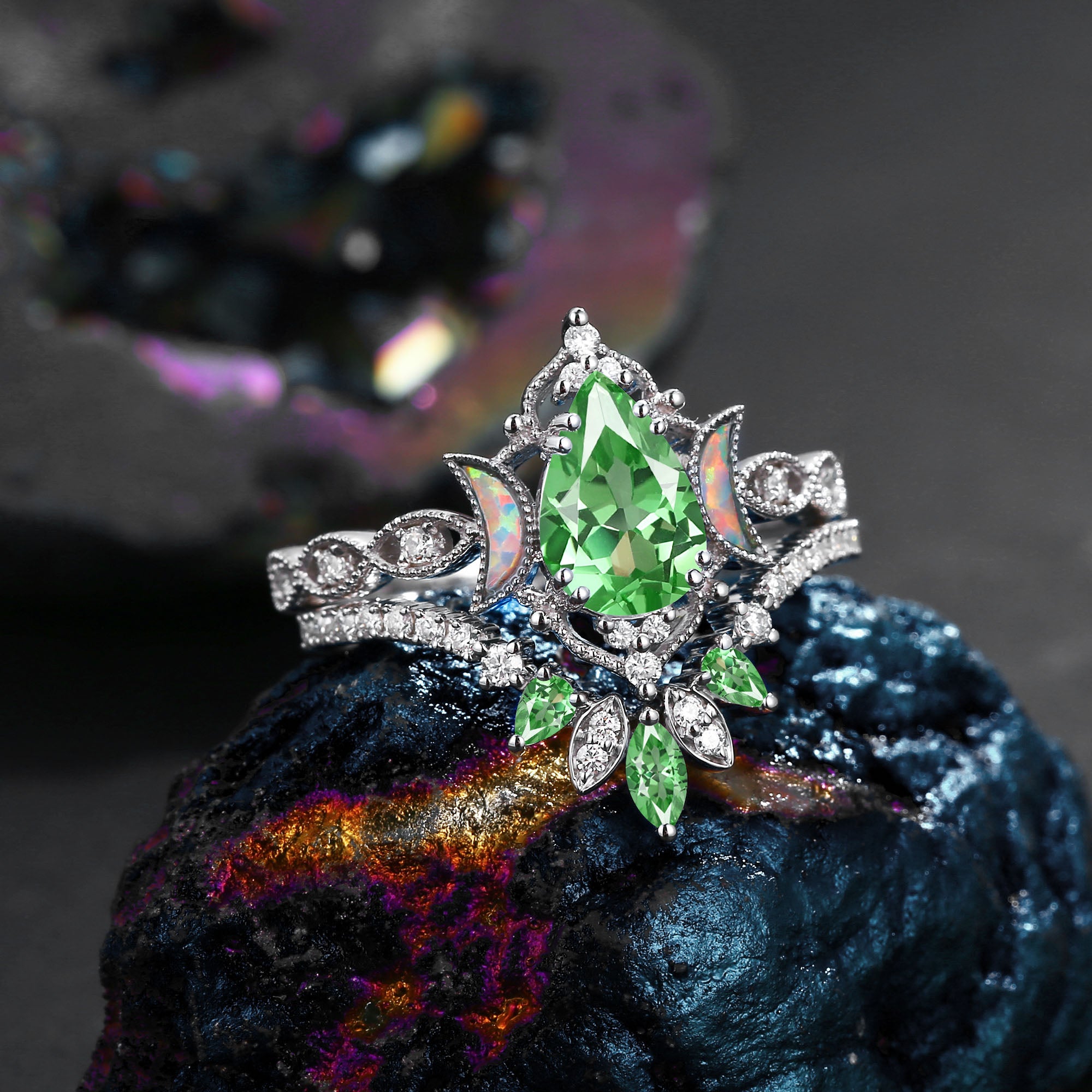 Crescent Moon | Pear Cut Lab Tsavorite 'Ultra Galaxy' Engagement Ring Set 2pcs