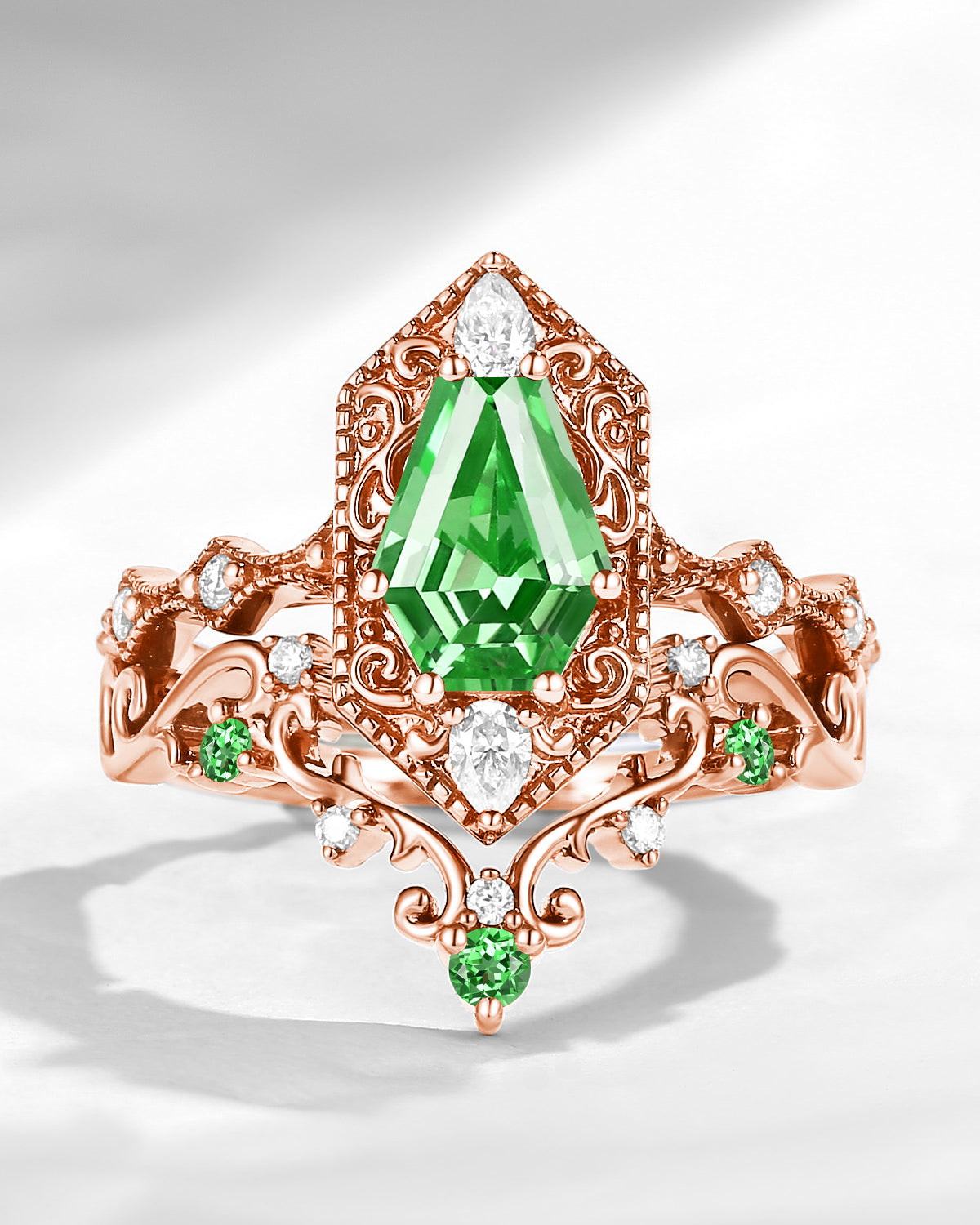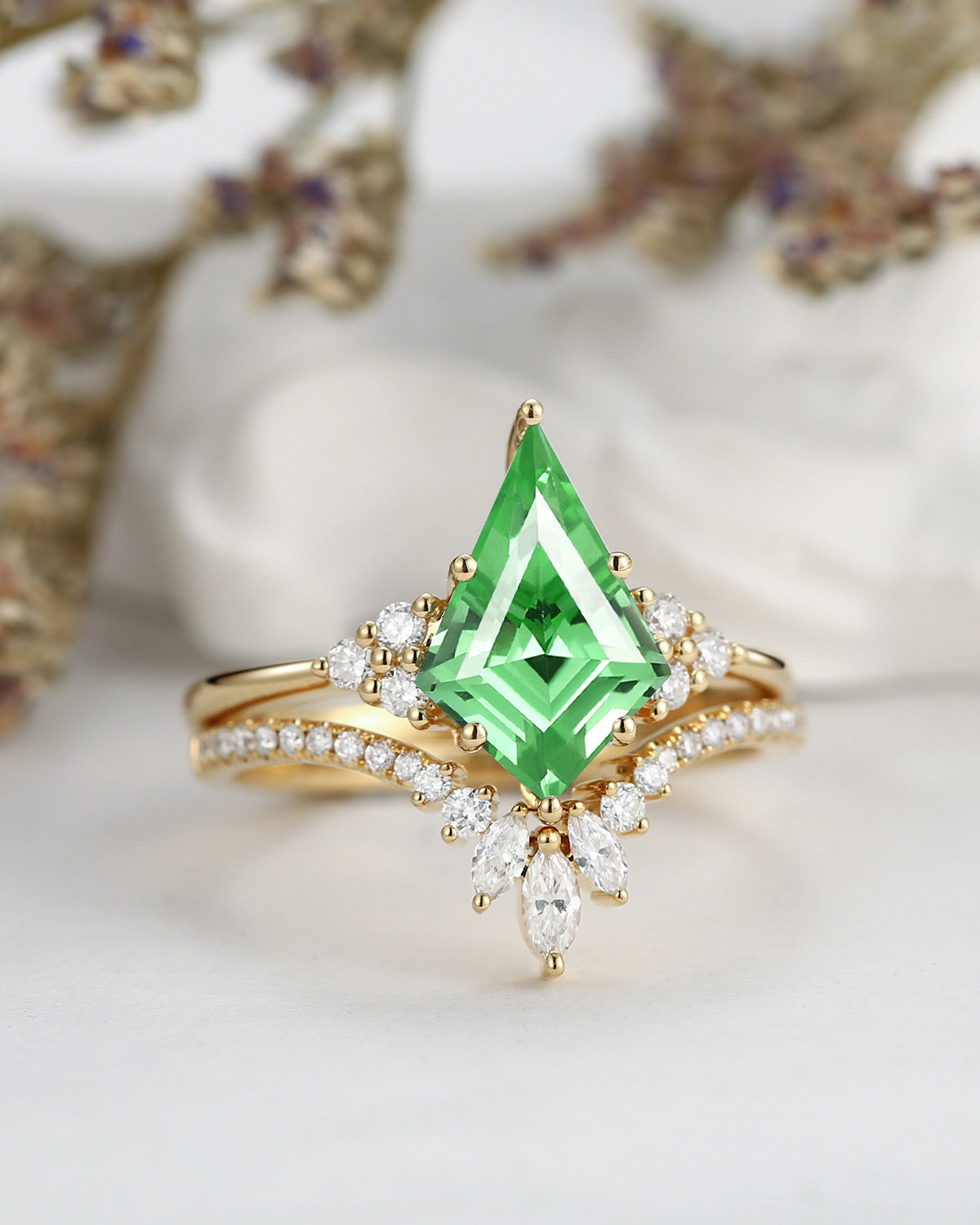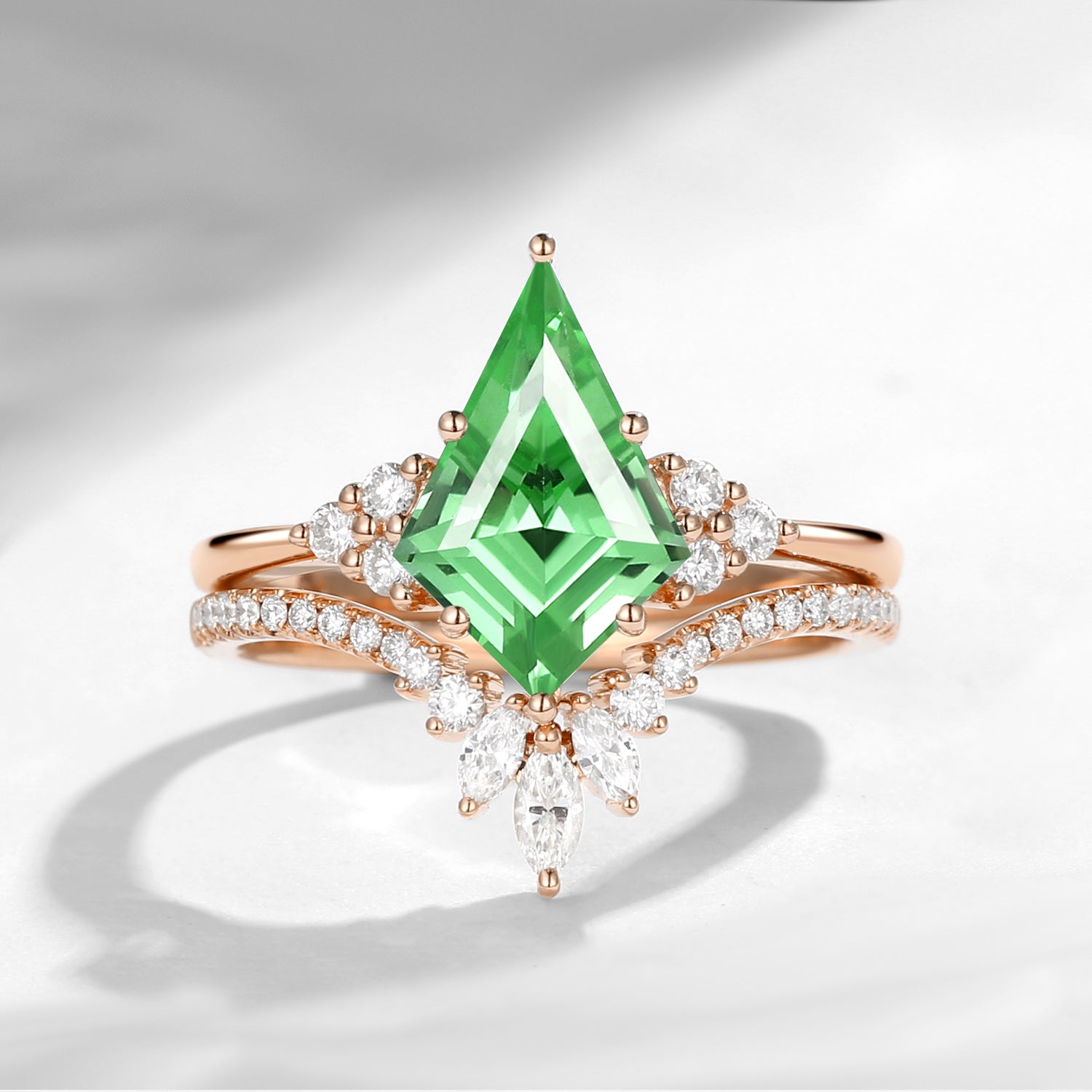18K Kite Cut Lab Tsavorite Engagement Ring Set 2pcs