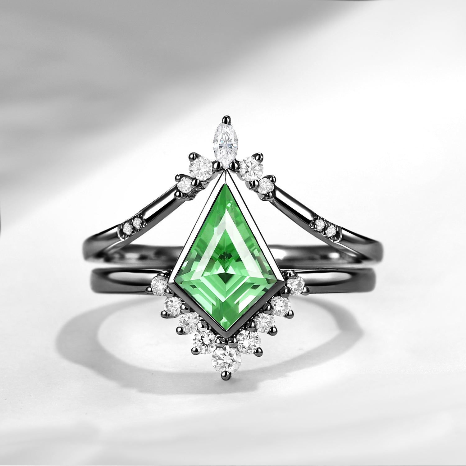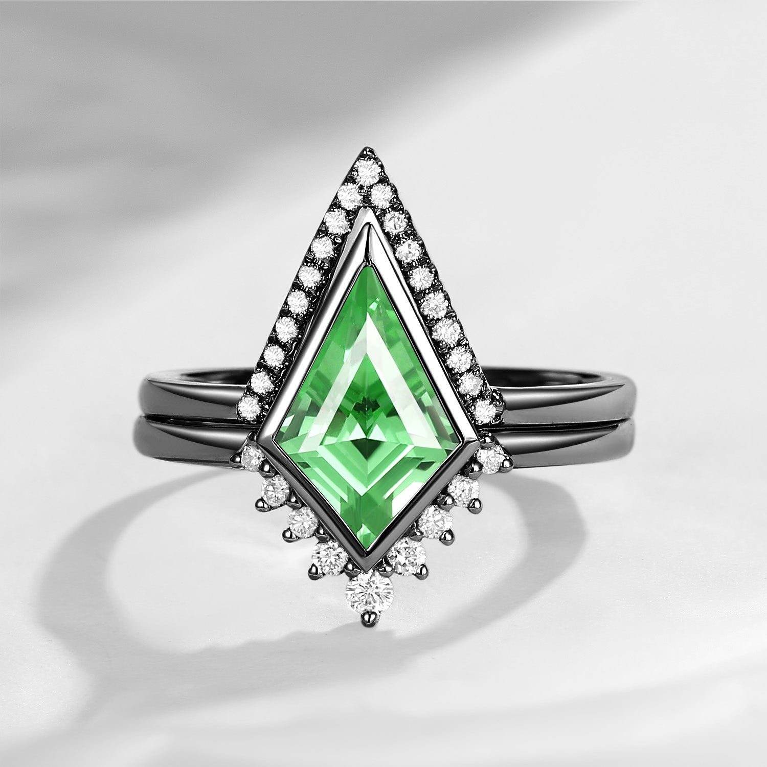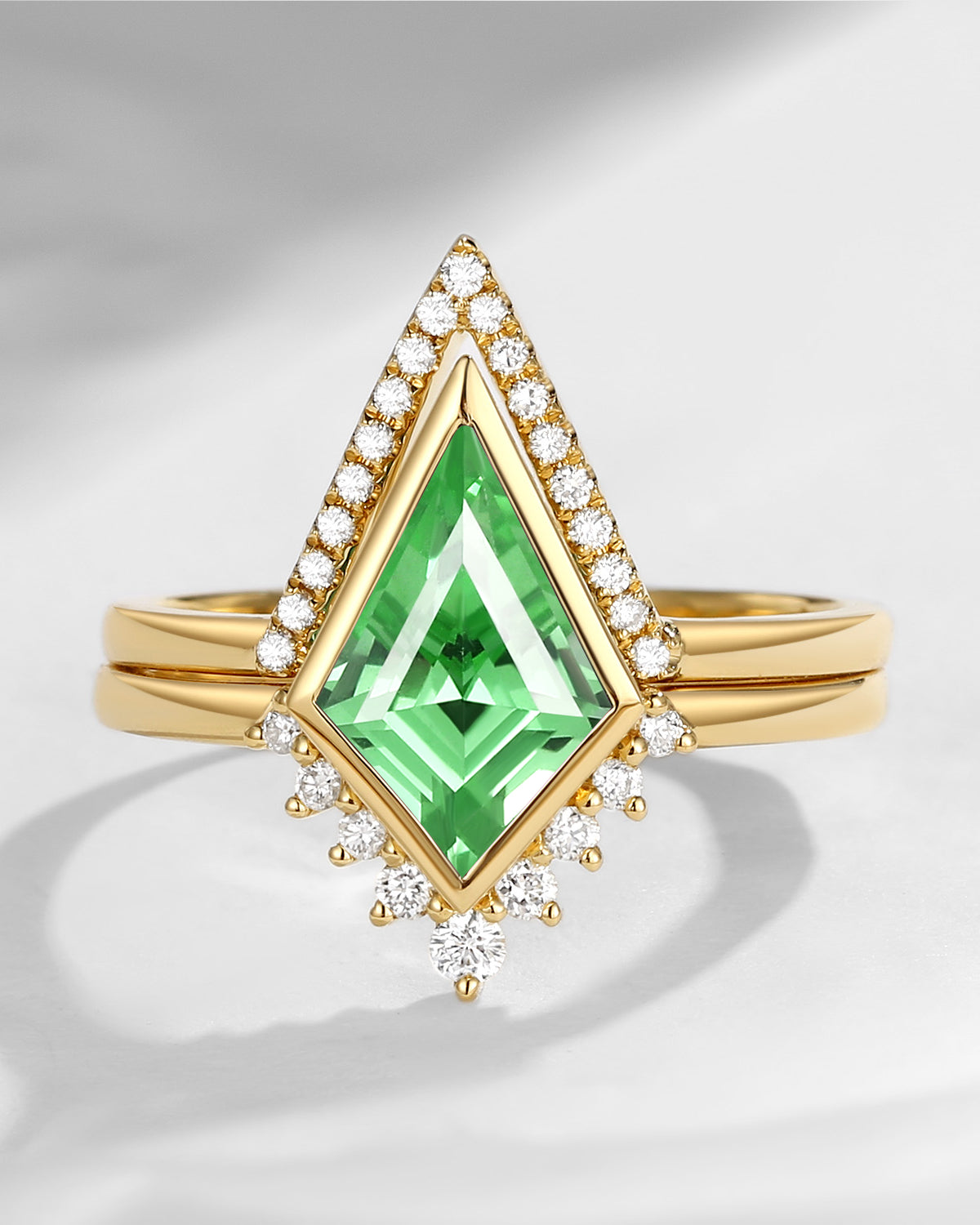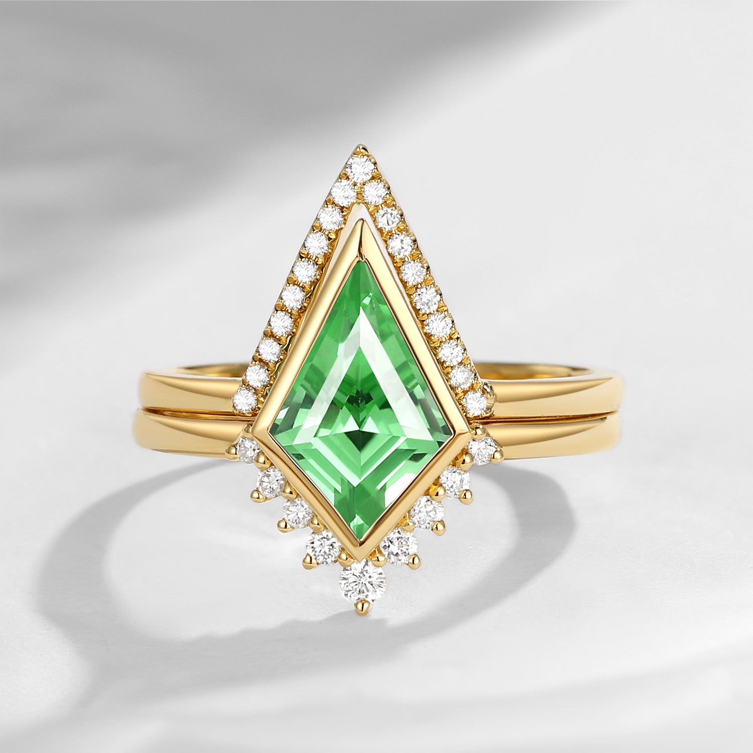 18K Art Deco Kite Cut Lab Tsavorite Bezel Engagement Ring Set 2pcs - Statement