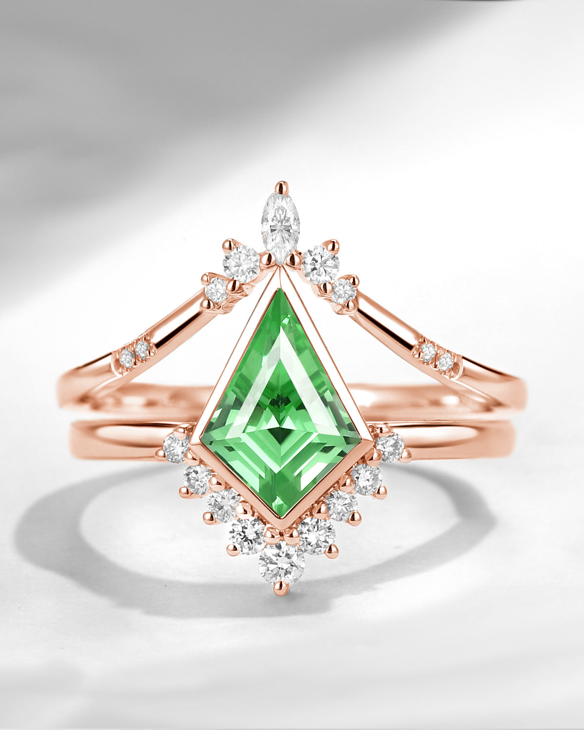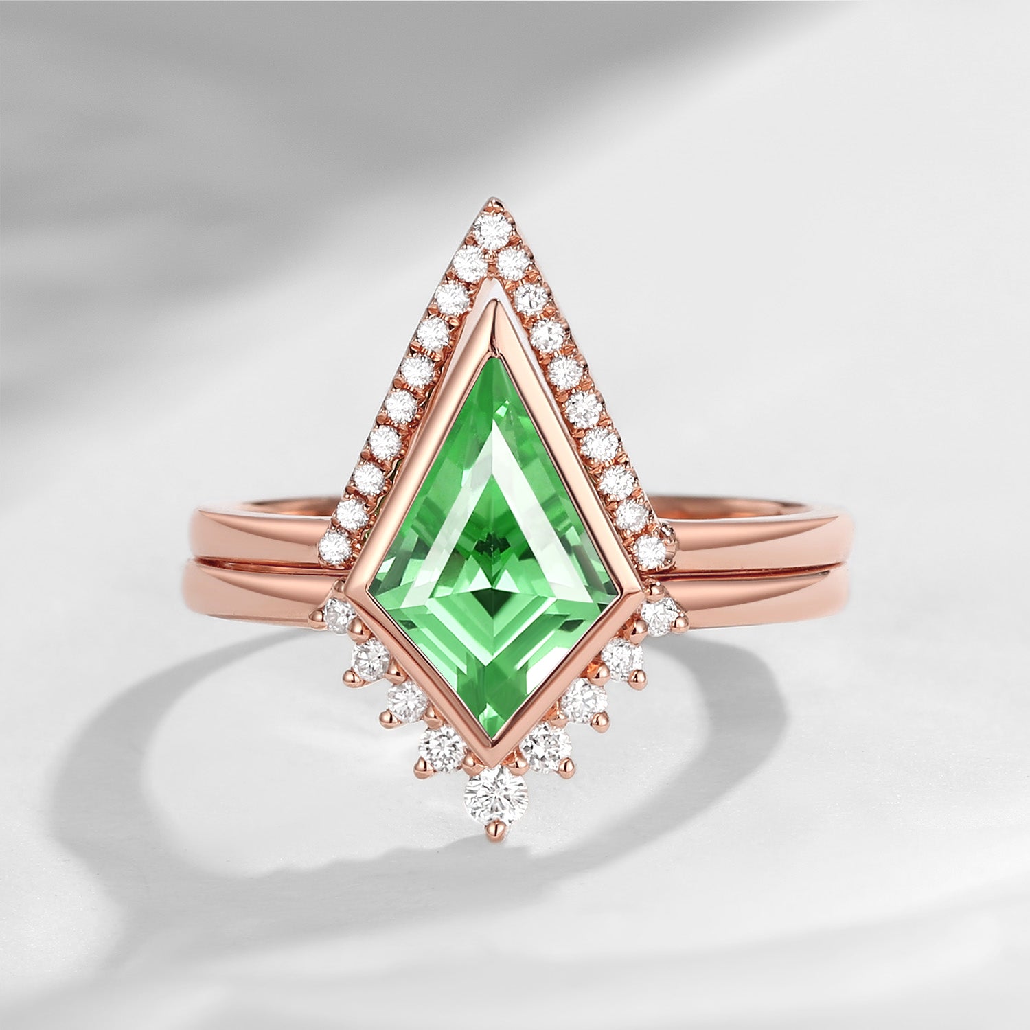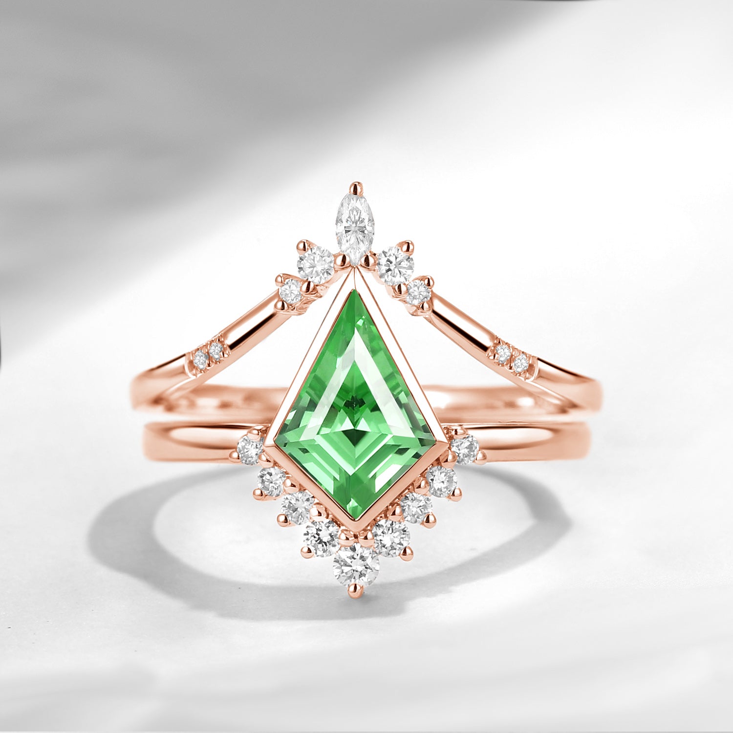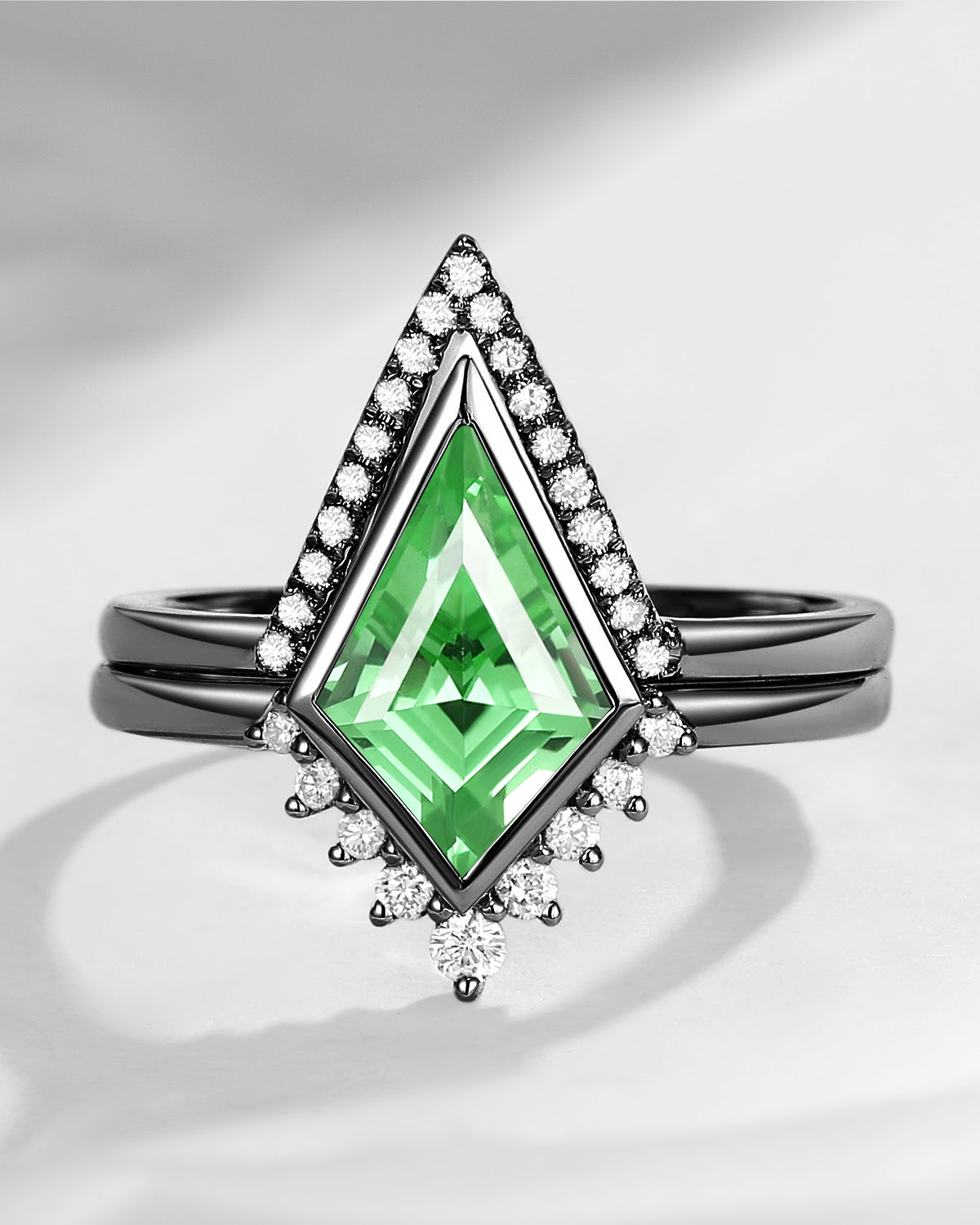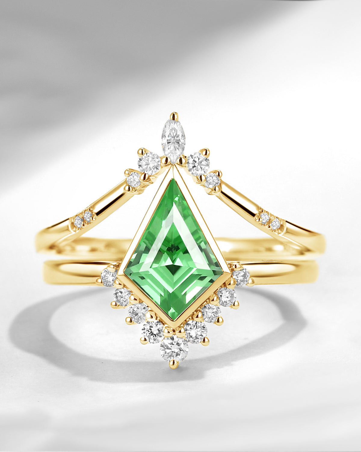 18K Art Deco Kite Cut Lab Tsavorite Bezel Engagement Ring Set 2pcs - Statement