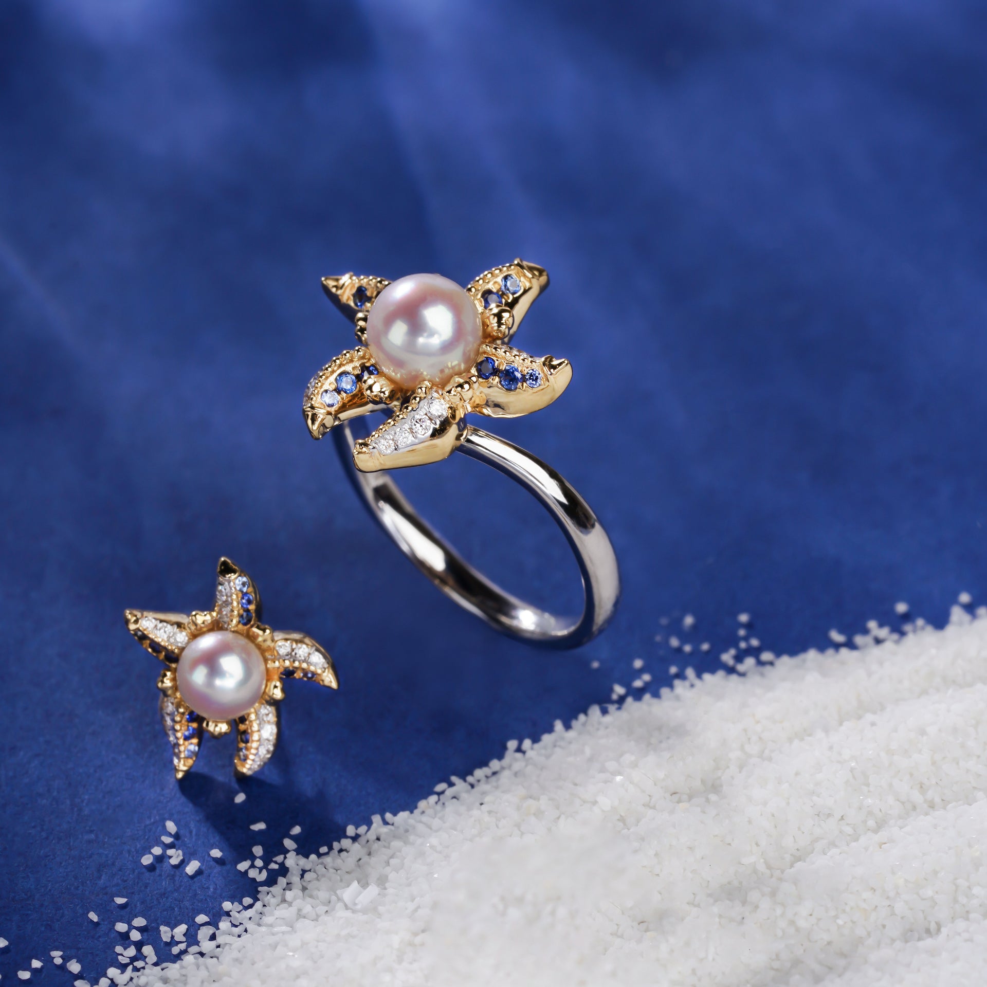 Art Deco Sapphire Freshwater Pearl Starfish Inspired Ring Shell Earrings  - Ocean Fantasy