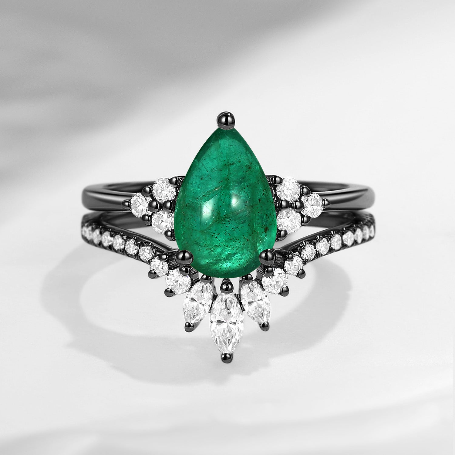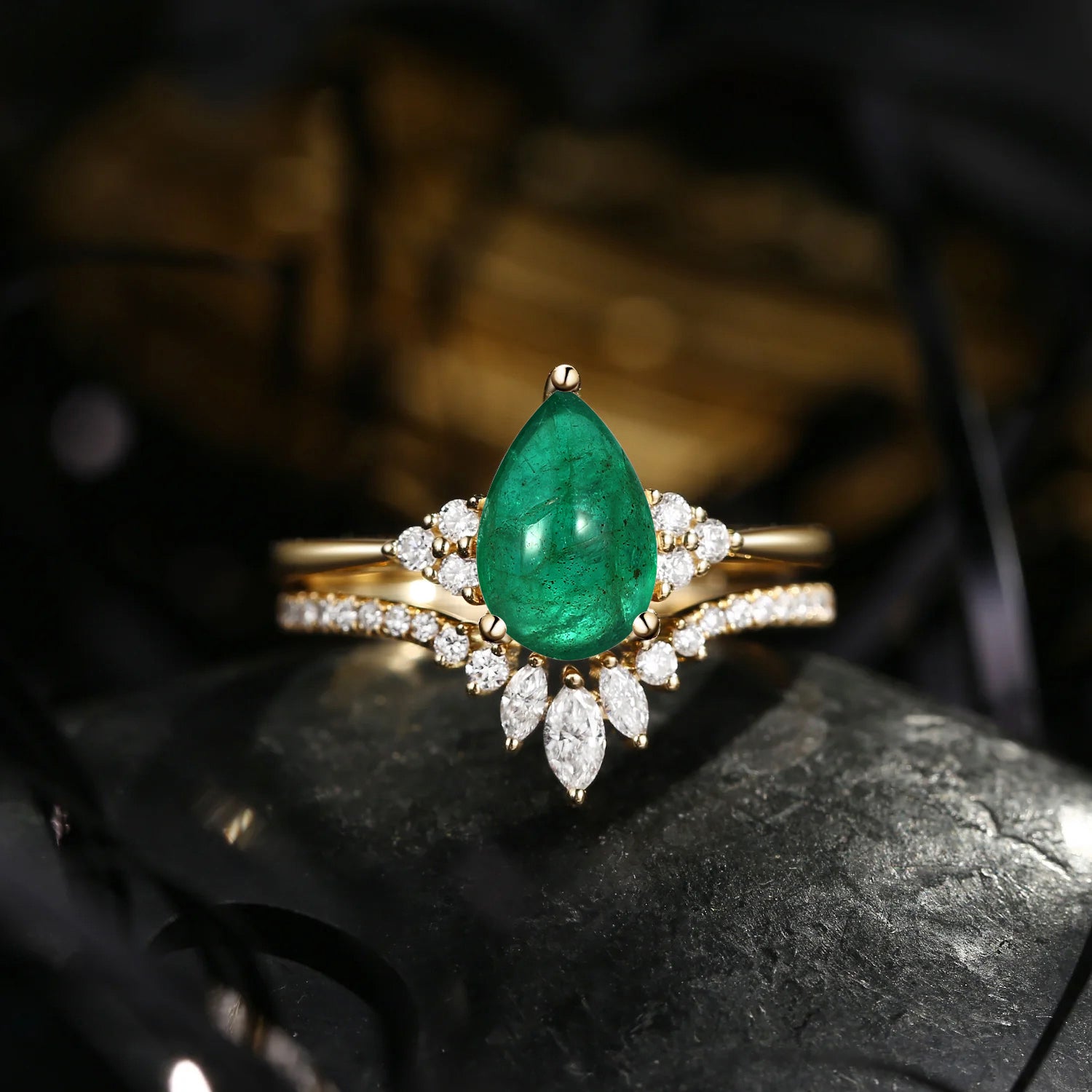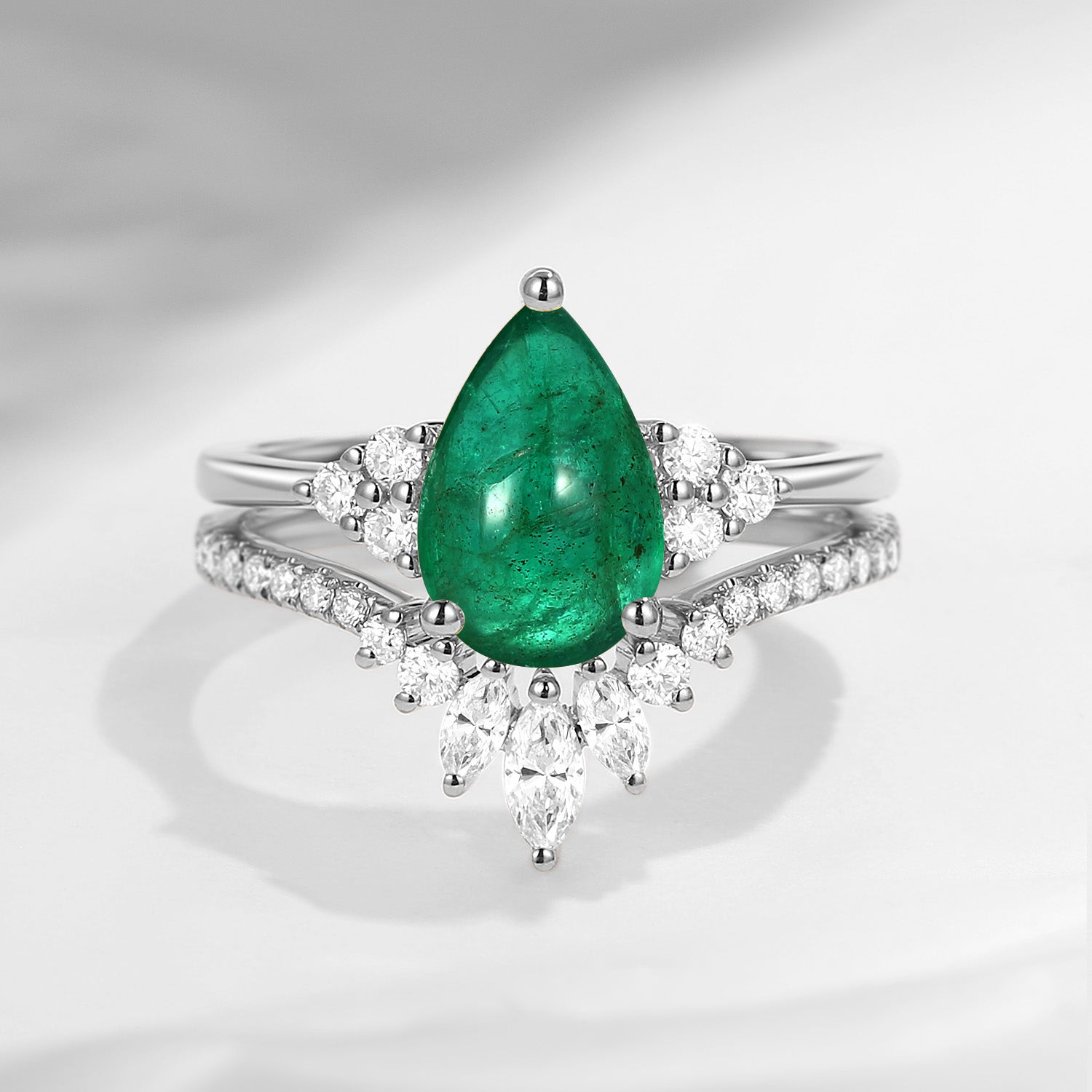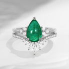 Classic Style Pear Natural Emerald Cluster Engagement Ring Set 2pcs - Vivian