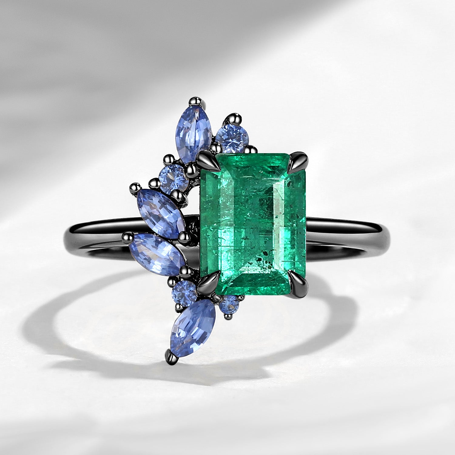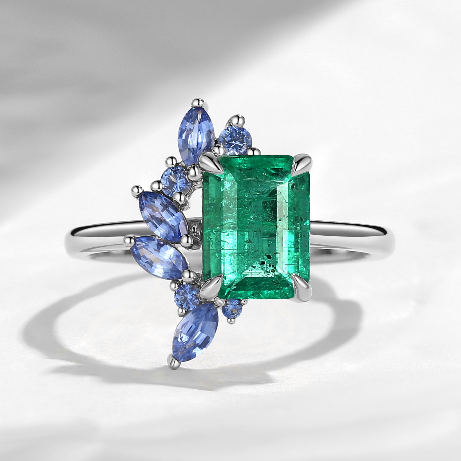 Cluster Emerald Cut Natural Emerald & Natural Sapphire Accents Engagement Ring