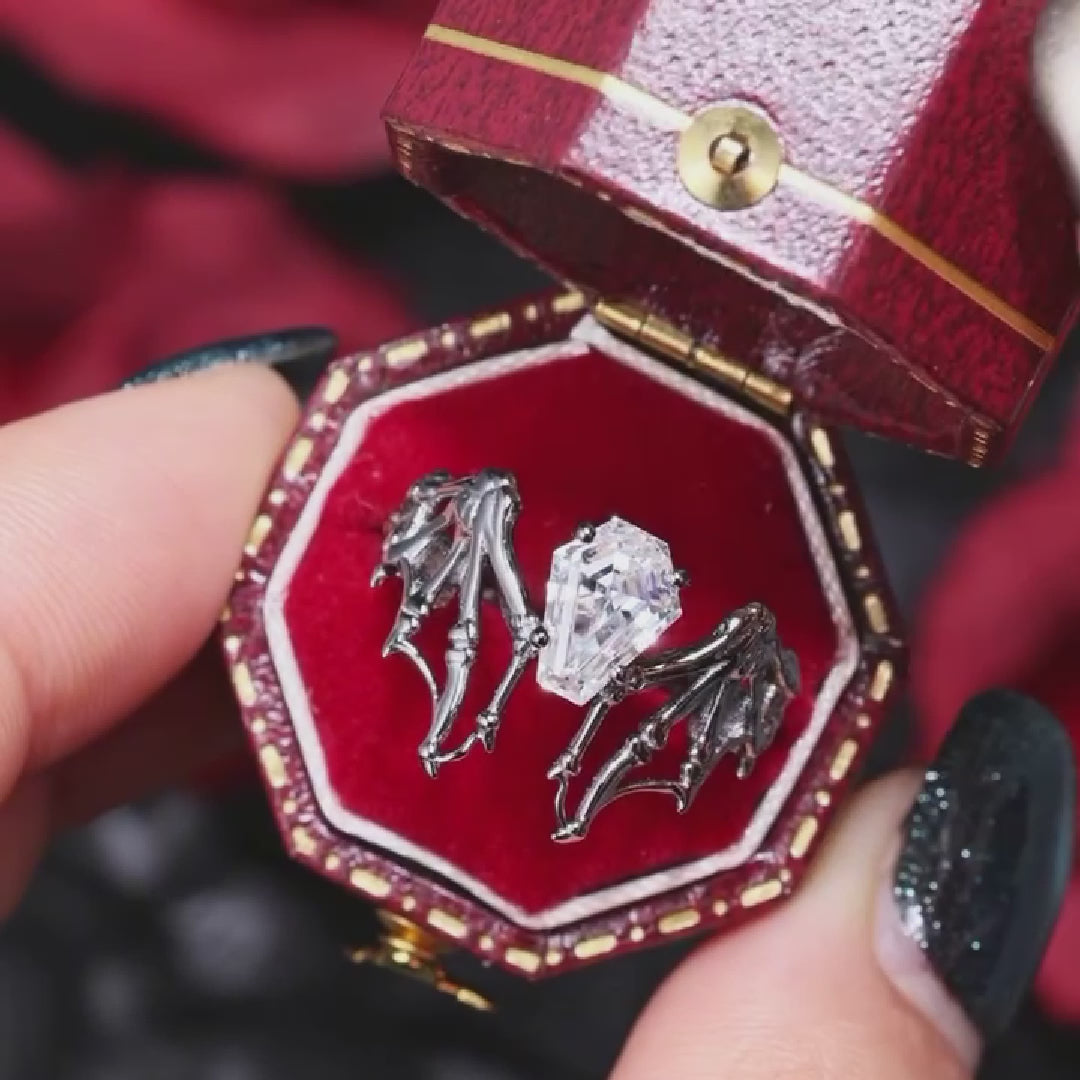 Moissanite Coffin Cut Vintage Inspired Black Gold Engagement Ring - Bat Ring