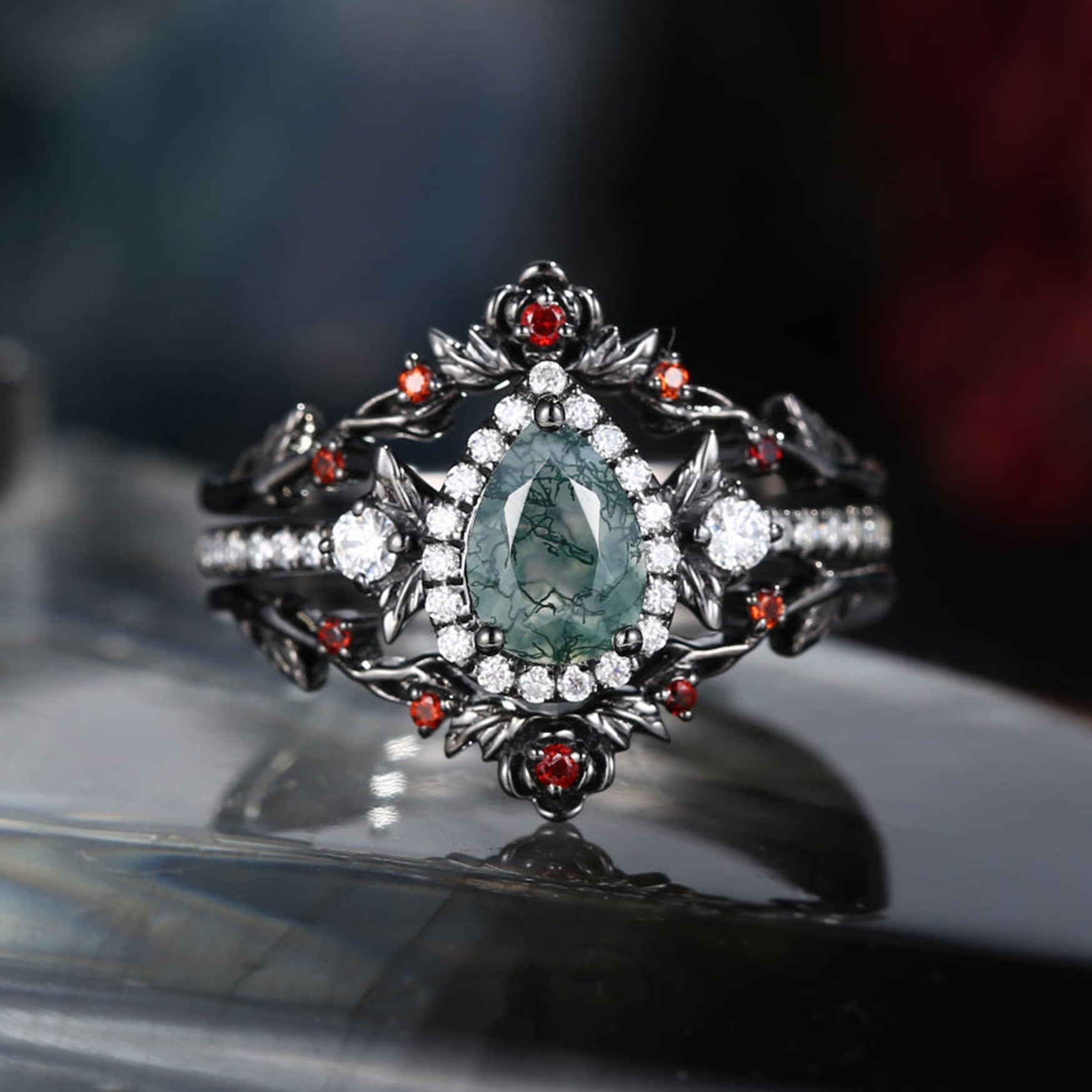 Nature Inspired Pear Cut Moss Agate Halo Engagement Ring Set 3pcs