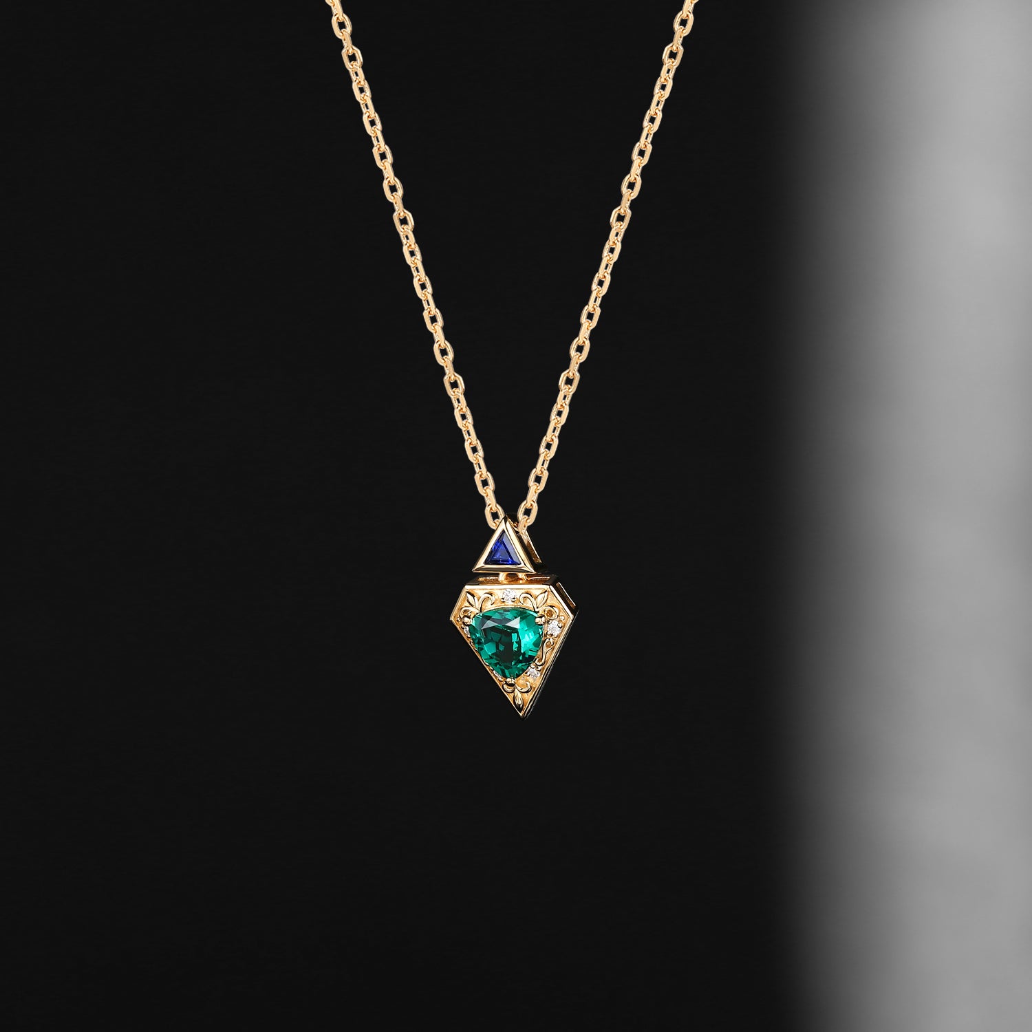 Vintage Inspired Triangle Cut Lab Emerald 'Fallen Aegis' Filigree Gold Necklace