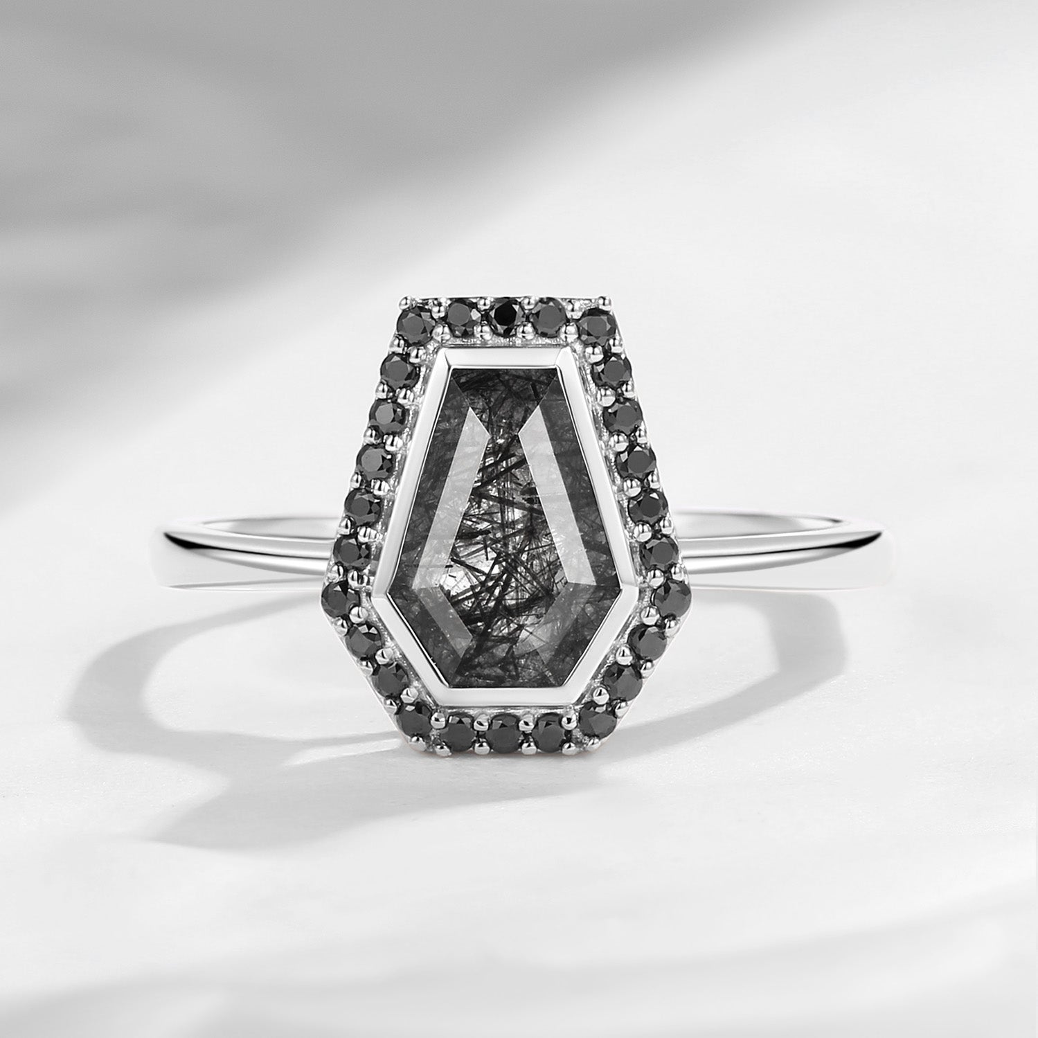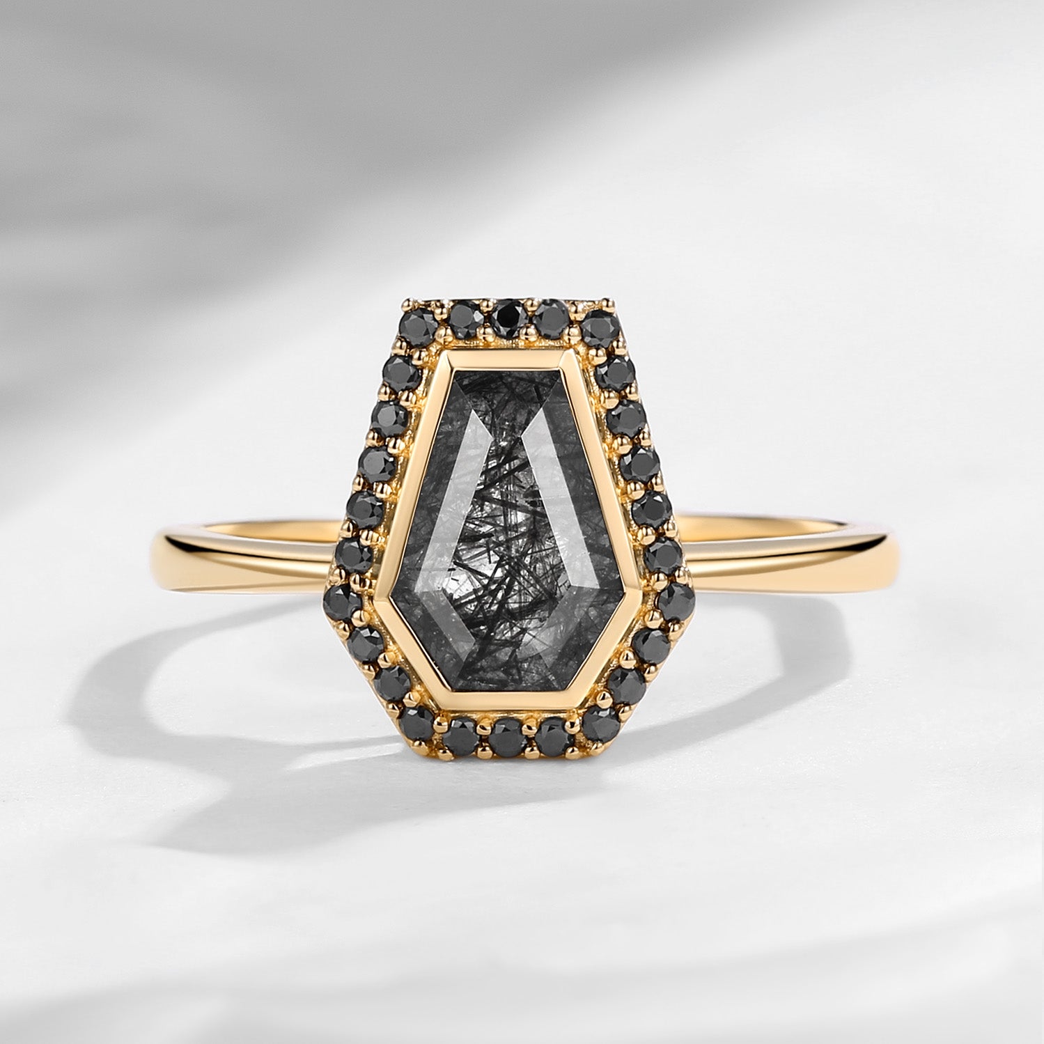 Coffin Cut Black Rutilated Quartz Halo Engagement Ring - Goth Girl