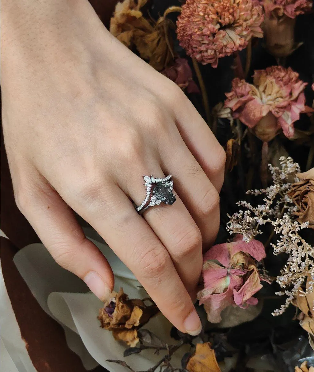 White Gold Engagement Ring Coffin Black Rutilated Quartz Ring Set 2pcs Crystal Ring Till death do us Part Ring Gift