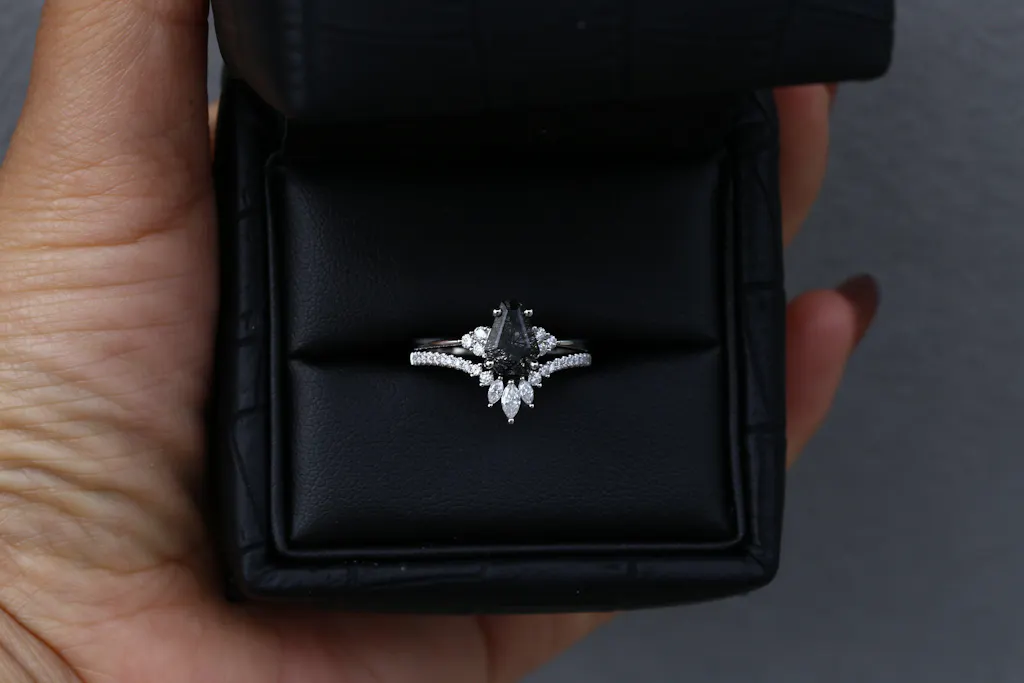 Coffin Black Rutilated Quartz Engagement Ring 2PCS - White Dress